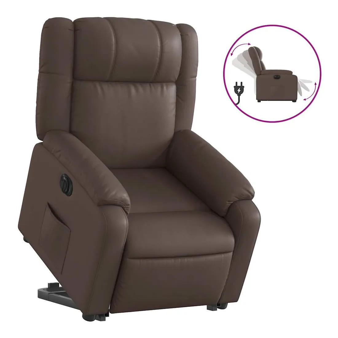 Asseyez-vous et détendez-vous dans ce fauteuil inclinable électrique très confortable ! Fonction de levage électrique : ce fauteuil inclinable pour personnes âgées est équipé d'un moteur électrique pour la fonction de levage. Grâce à la fonction qui pousse toute la chaise vers le haut, vous pouvez facilement vous tenir debout sans stresser votre dos et vos genoux en appuyant simplement sur le bouton.Fonction d'inclinaison électrique : ce fauteuil inclinable est également équipé d'un moteur électrique qui permet de régler automatiquement le repose-pied et le dossier dans n'importe quelle position, selon votre confort, en appuyant simplement sur le bouton situé sur le côté du fauteuil. Cette fonction permet une inclinaison maximale de 135 degrés. En outre, le dossier peut revenir automatiquement à sa position d'origine par une simple pression sur le bouton.Expérience de siège confortable : le siège, le dossier et les larges accoudoirs rembourrés épais recouverts de similicuir procurent une sensation confortable et chaleureuse, vous faisant vous sentir enlacé lorsque vous êtes assis. Le simili cuir est un matériau très résistant. Il est résistant aux taches, ce qui le rend facile à nettoyer avec un chiffon humide. La surface lisse donne également un aspect luxueux et la beauté du cuir véritable.Poche latérale pratique : ce fauteuil est doté d'une poche latérale pour vous permettre de garder vos objets essentiels à portée de main.Cadre solide et stable : le cadre en bois et en métal offre une structure solide et une grande stabilité. Ce fauteuil inclinable est confortable et durable.