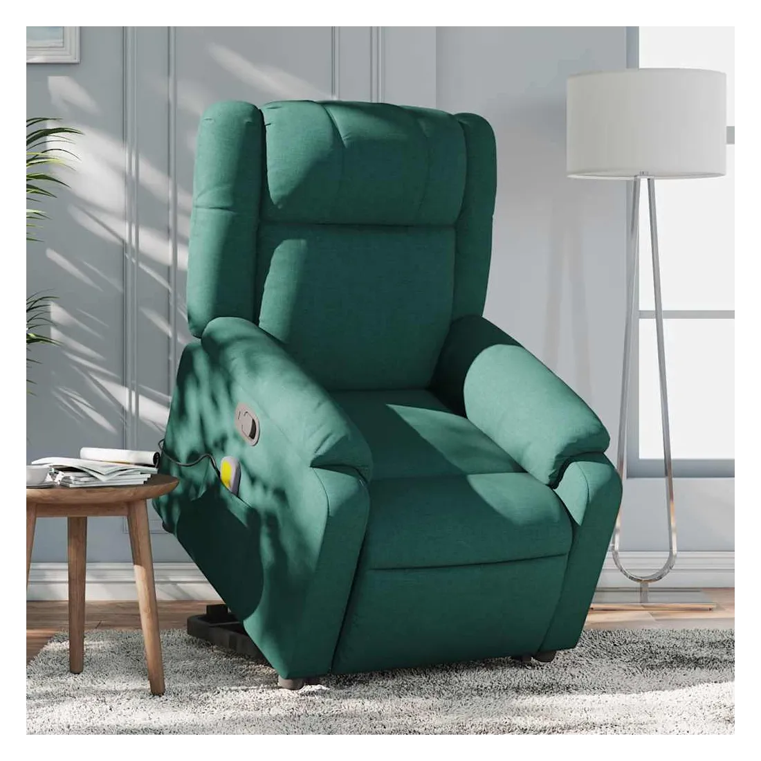 Asseyez-vous et détendez-vous dans ce fauteuil inclinable de massage très confortable ! Fonction de levage électrique : ce fauteuil inclinable pour personnes âgées est équipé d'un moteur électrique pour la fonction de levage. Grâce à la fonction qui pousse toute la chaise vers le haut, vous pouvez facilement vous tenir debout sans stresser votre dos et vos genoux en appuyant simplement sur le bouton.Fonction d'inclinaison manuelle : ce fauteuil inclinable est doté d'une poignée du côté droit. Vous pouvez régler manuellement le repose-pieds et le dossier dans n'importe quelle position selon votre confort en tirant simplement sur la poignée. Cette fonction permet une inclinaison maximale de 135 degrés. De plus, le dossier peut revenir rapidement à sa position d'origine en tirant simplement sur la poignée.Fonction de vibration : les 6 points de massage vous permettent de faire l'expérience d'un massage mieux ciblé. De plus, la télécommande incluse vous permet de choisir différents programmes de massage. La fonction de massage est alimentée par le connecteur USB qui nécessite une source d'alimentation USB certifiée de 5 V (non fournie).Expérience d'assise confortable : le siège, le dossier et les larges accoudoirs bien rembourrés recouverts de tissu procurent une sensation confortable et chaleureuse, vous permettant de vous sentir enveloppé lorsque vous êtes assis. Le tissu présente un aspect simple et épuré et est respirant et durable.Poche latérale pratique : ce fauteuil est doté d'une poche latérale pour ranger votre télécommande ou garder vos objets essentiels à portée de main.Cadre solide et stable : le cadre en bois et en métal offre une structure solide et une grande stabilité. Ce fauteuil inclinable est confortable et durable.
