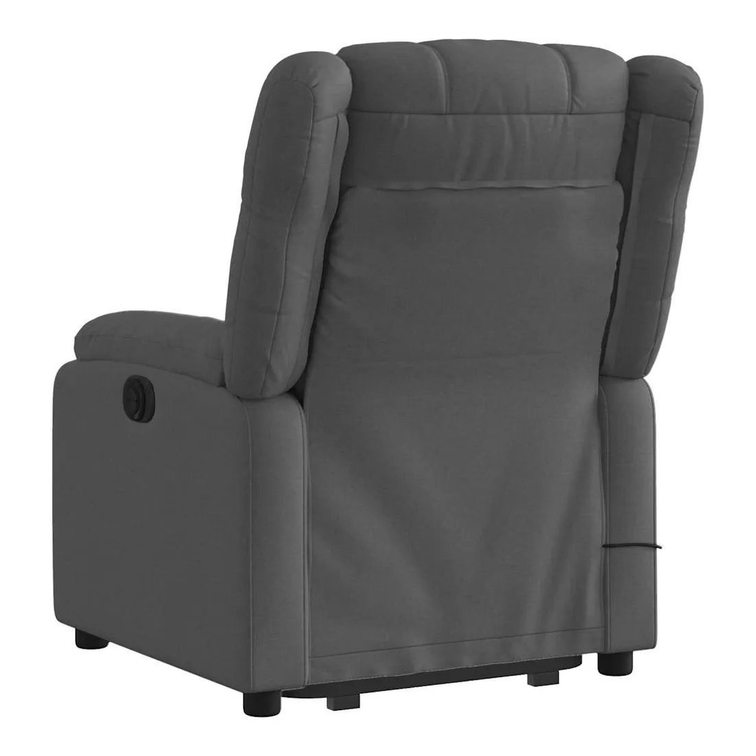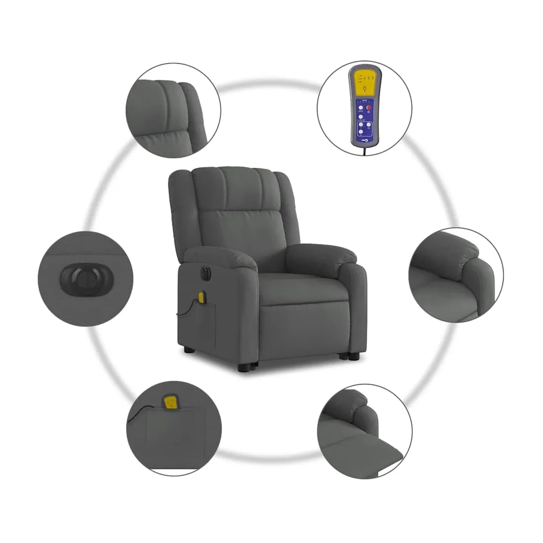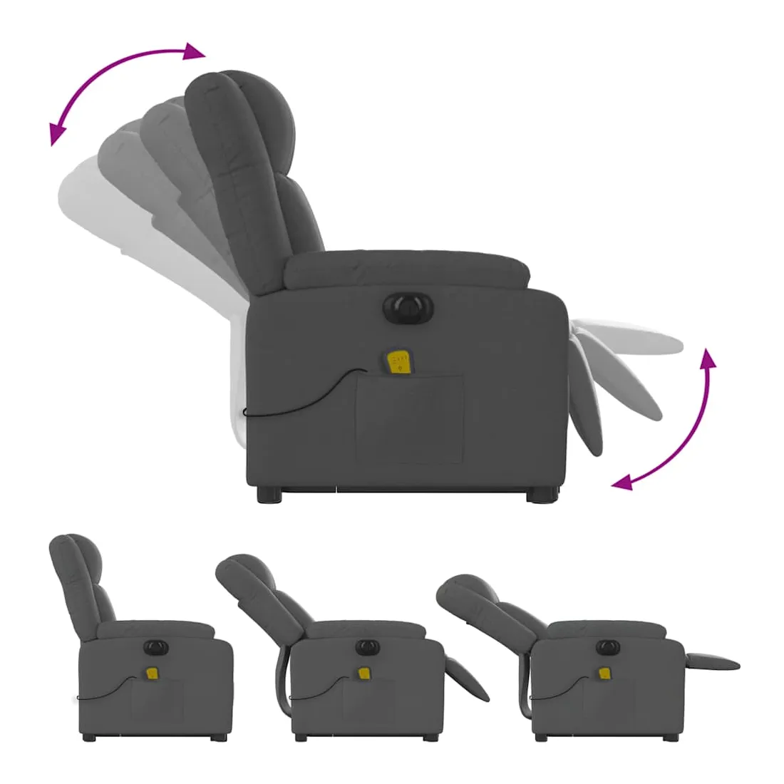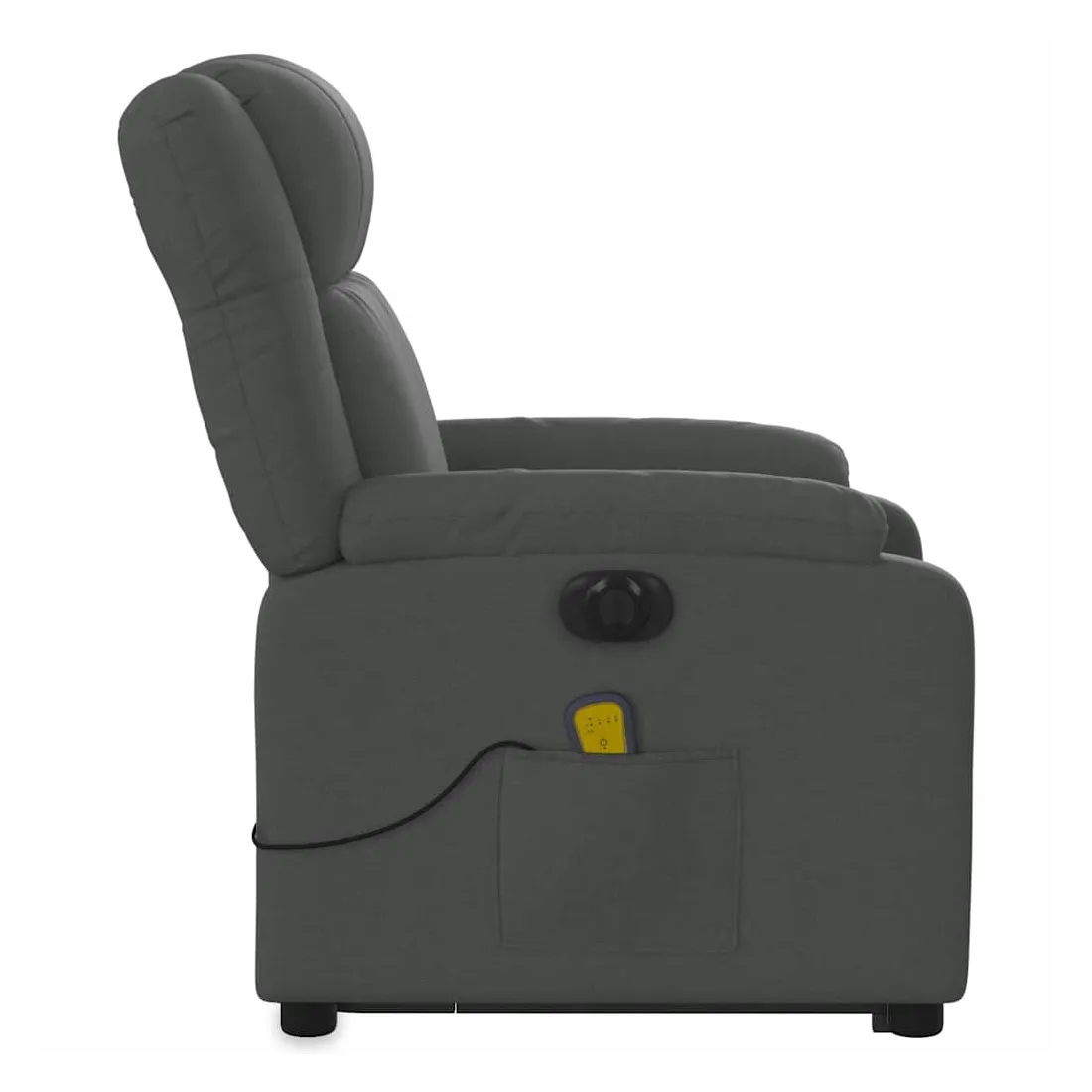 Asseyez-vous et détendez-vous dans ce fauteuil inclinable de massage électrique très confortable ! Fonction de levage électrique : ce fauteuil inclinable pour personnes âgées est équipé d'un moteur électrique pour la fonction de levage. Grâce à la fonction qui pousse toute la chaise vers le haut, vous pouvez facilement vous tenir debout sans stresser votre dos et vos genoux en appuyant simplement sur le bouton.Fonction d'inclinaison électrique : ce fauteuil inclinable est également équipé d'un moteur électrique qui permet de régler automatiquement le repose-pied et le dossier dans n'importe quelle position, selon votre confort, en appuyant simplement sur le bouton situé sur le côté du fauteuil. Cette fonction permet une inclinaison maximale de 135 degrés. En outre, le dossier peut revenir automatiquement à sa position d'origine par une simple pression sur le bouton.Fonction de vibration : les 6 points de massage vous permettent de faire l'expérience d'un massage mieux ciblé. De plus, la télécommande incluse vous permet de choisir différents programmes de massage. La fonction de massage est alimentée par le connecteur USB qui nécessite une source d'alimentation USB certifiée de 5 V (non fournie).Expérience d'assise confortable : le siège, le dossier et les larges accoudoirs bien rembourrés recouverts de tissu procurent une sensation confortable et chaleureuse, vous permettant de vous sentir enveloppé lorsque vous êtes assis. Le tissu présente un aspect simple et épuré et est respirant et durable.Poche latérale pratique : ce fauteuil est doté d'une poche latérale pour ranger votre télécommande ou garder vos objets essentiels à portée de main.Cadre solide et stable : le cadre en bois et en métal offre une structure solide et une grande stabilité. Ce fauteuil inclinable est confortable et durable.