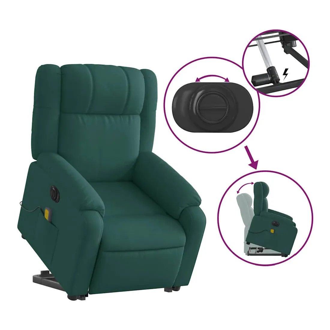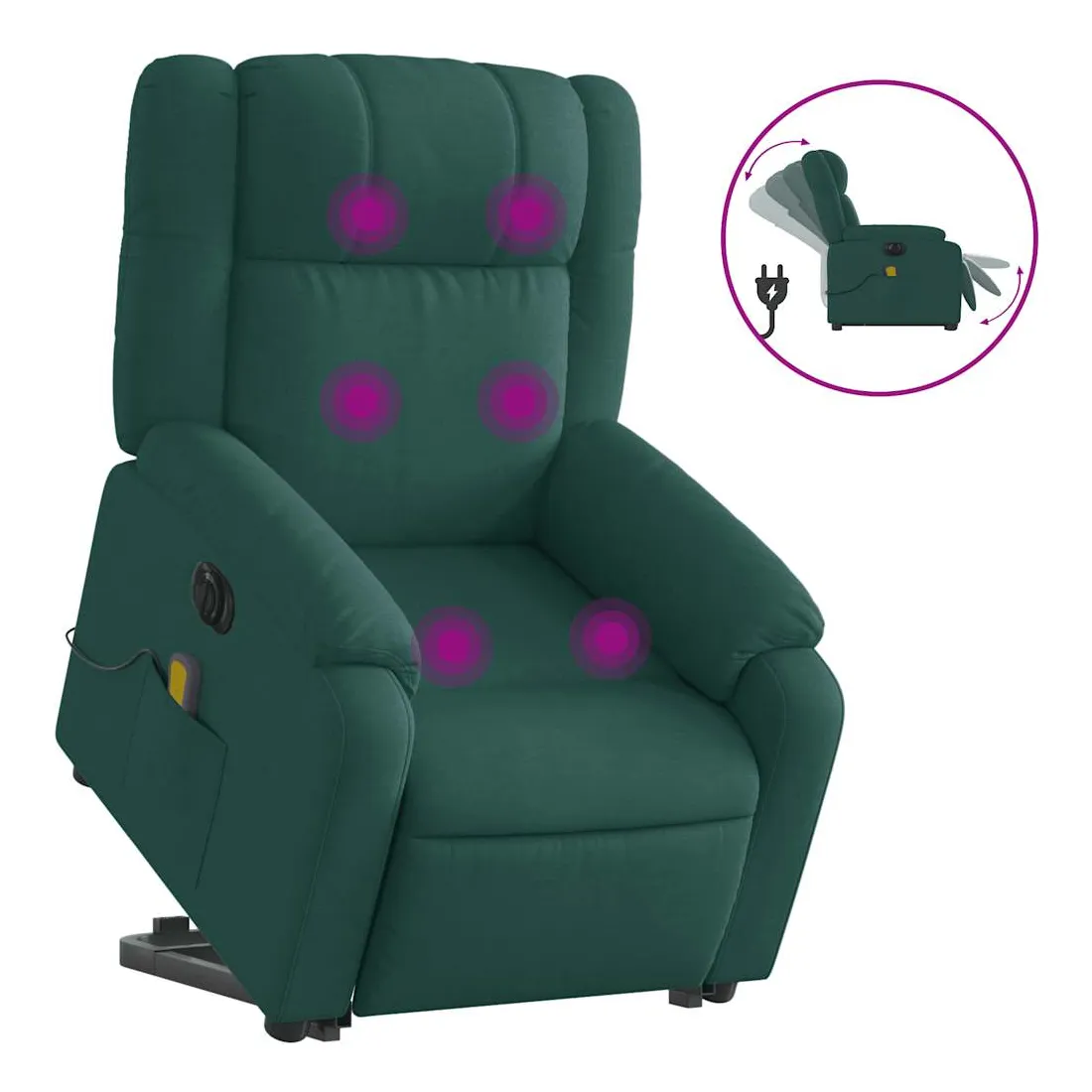 Asseyez-vous et détendez-vous dans ce fauteuil inclinable de massage électrique très confortable ! Fonction de levage électrique : ce fauteuil inclinable pour personnes âgées est équipé d'un moteur électrique pour la fonction de levage. Grâce à la fonction qui pousse toute la chaise vers le haut, vous pouvez facilement vous tenir debout sans stresser votre dos et vos genoux en appuyant simplement sur le bouton.Fonction d'inclinaison électrique : ce fauteuil inclinable est également équipé d'un moteur électrique qui permet de régler automatiquement le repose-pied et le dossier dans n'importe quelle position, selon votre confort, en appuyant simplement sur le bouton situé sur le côté du fauteuil. Cette fonction permet une inclinaison maximale de 135 degrés. En outre, le dossier peut revenir automatiquement à sa position d'origine par une simple pression sur le bouton.Fonction de vibration : les 6 points de massage vous permettent de faire l'expérience d'un massage mieux ciblé. De plus, la télécommande incluse vous permet de choisir différents programmes de massage. La fonction de massage est alimentée par le connecteur USB qui nécessite une source d'alimentation USB certifiée de 5 V (non fournie).Expérience d'assise confortable : le siège, le dossier et les larges accoudoirs bien rembourrés recouverts de tissu procurent une sensation confortable et chaleureuse, vous permettant de vous sentir enveloppé lorsque vous êtes assis. Le tissu présente un aspect simple et épuré et est respirant et durable.Poche latérale pratique : ce fauteuil est doté d'une poche latérale pour ranger votre télécommande ou garder vos objets essentiels à portée de main.Cadre solide et stable : le cadre en bois et en métal offre une structure solide et une grande stabilité. Ce fauteuil inclinable est confortable et durable.
