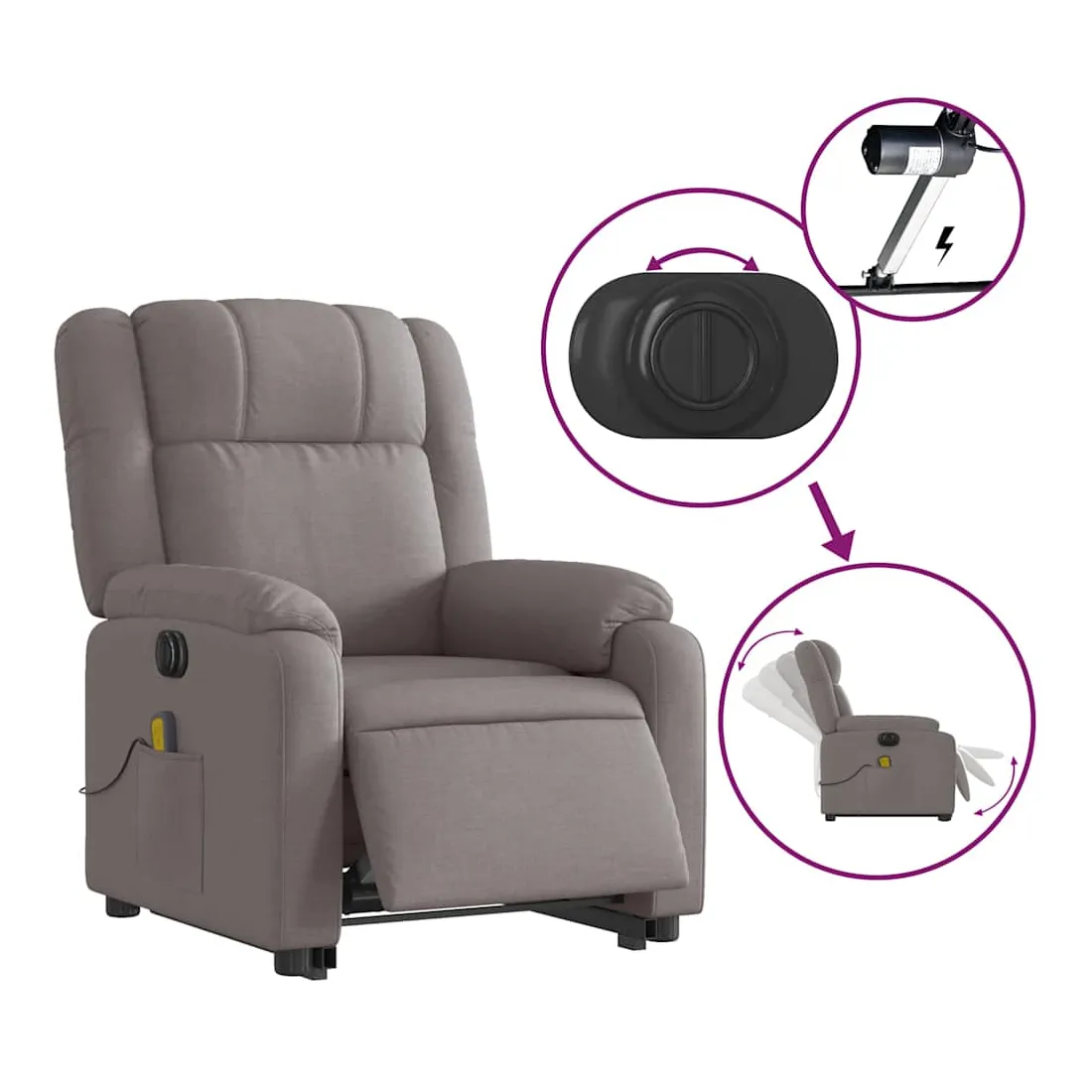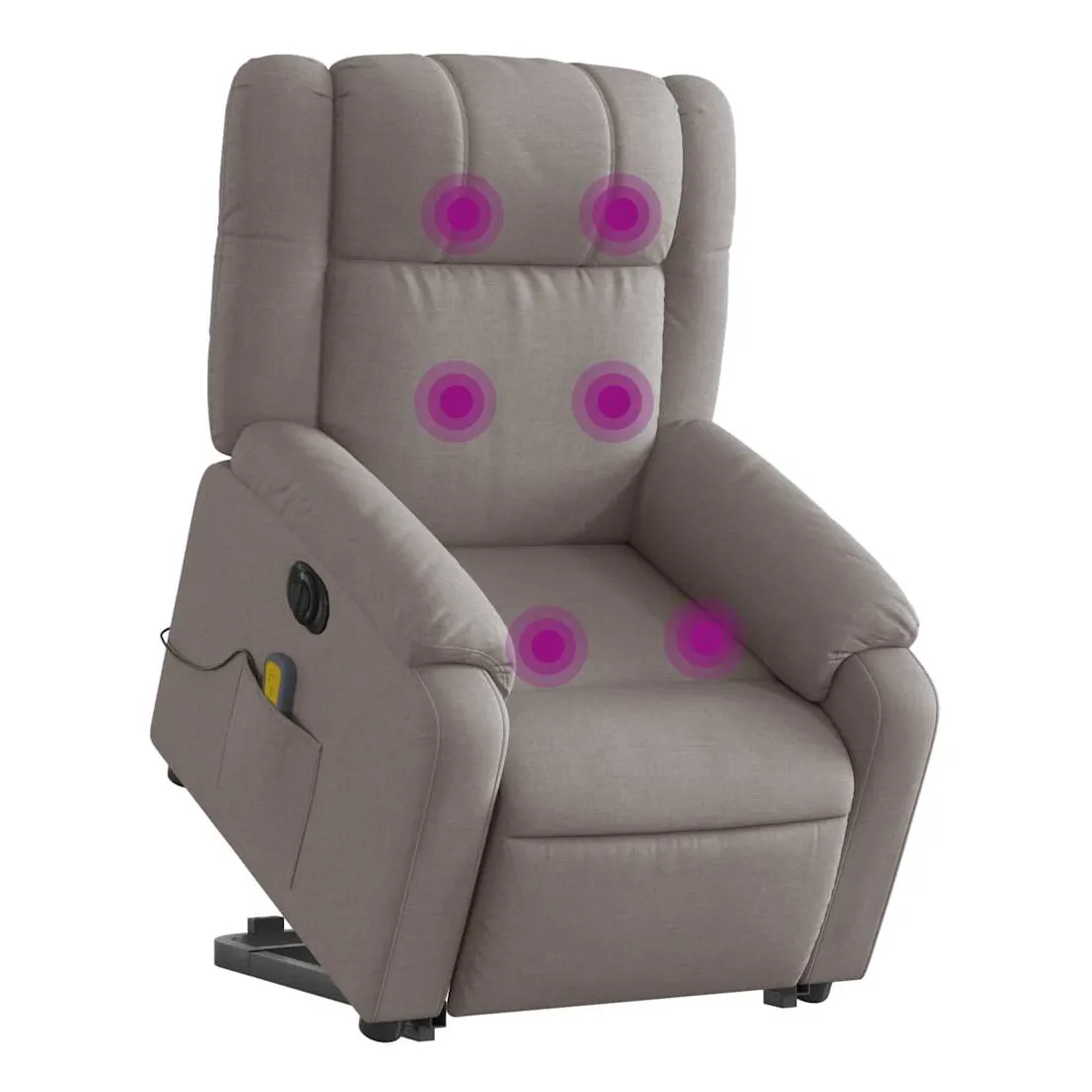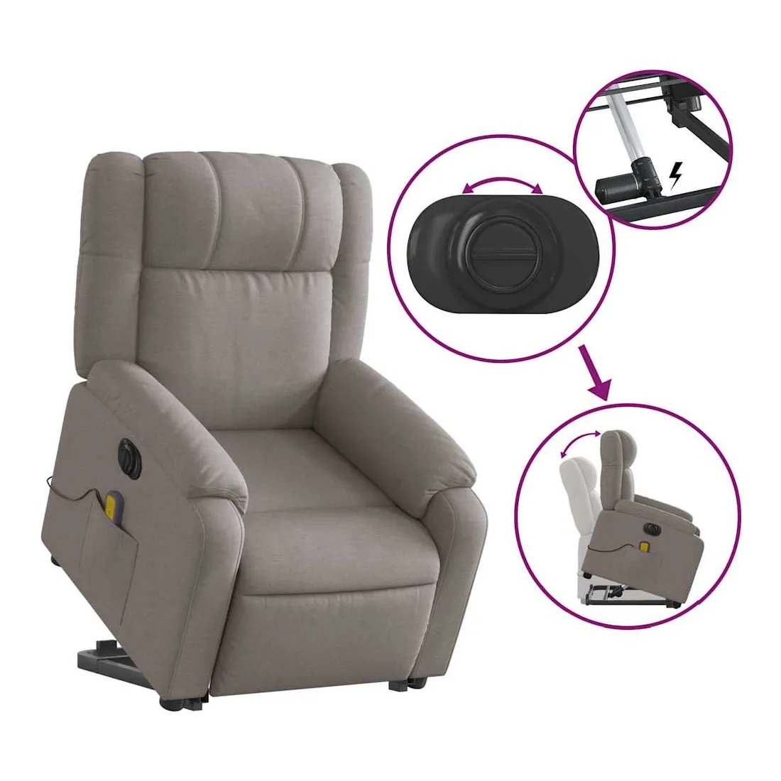 Asseyez-vous et détendez-vous dans ce fauteuil inclinable de massage électrique très confortable ! Fonction de levage électrique : ce fauteuil inclinable pour personnes âgées est équipé d'un moteur électrique pour la fonction de levage. Grâce à la fonction qui pousse toute la chaise vers le haut, vous pouvez facilement vous tenir debout sans stresser votre dos et vos genoux en appuyant simplement sur le bouton.Fonction d'inclinaison électrique : ce fauteuil inclinable est également équipé d'un moteur électrique qui permet de régler automatiquement le repose-pied et le dossier dans n'importe quelle position, selon votre confort, en appuyant simplement sur le bouton situé sur le côté du fauteuil. Cette fonction permet une inclinaison maximale de 135 degrés. En outre, le dossier peut revenir automatiquement à sa position d'origine par une simple pression sur le bouton.Fonction de vibration : les 6 points de massage vous permettent de faire l'expérience d'un massage mieux ciblé. De plus, la télécommande incluse vous permet de choisir différents programmes de massage. La fonction de massage est alimentée par le connecteur USB qui nécessite une source d'alimentation USB certifiée de 5 V (non fournie).Expérience d'assise confortable : le siège, le dossier et les larges accoudoirs bien rembourrés recouverts de tissu procurent une sensation confortable et chaleureuse, vous permettant de vous sentir enveloppé lorsque vous êtes assis. Le tissu présente un aspect simple et épuré et est respirant et durable.Poche latérale pratique : ce fauteuil est doté d'une poche latérale pour ranger votre télécommande ou garder vos objets essentiels à portée de main.Cadre solide et stable : le cadre en bois et en métal offre une structure solide et une grande stabilité. Ce fauteuil inclinable est confortable et durable.