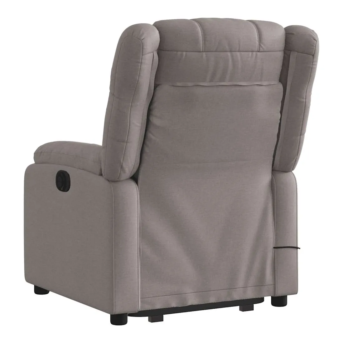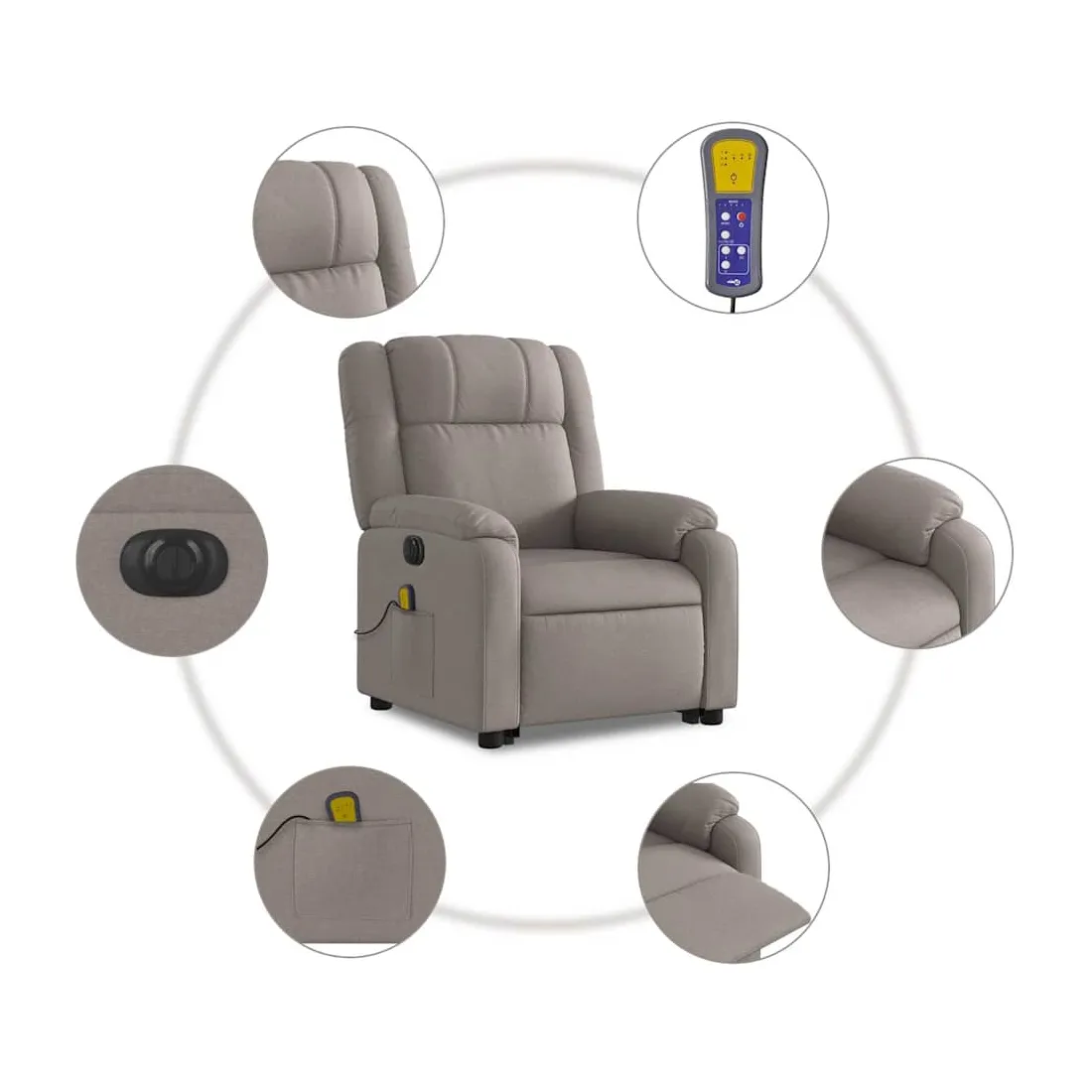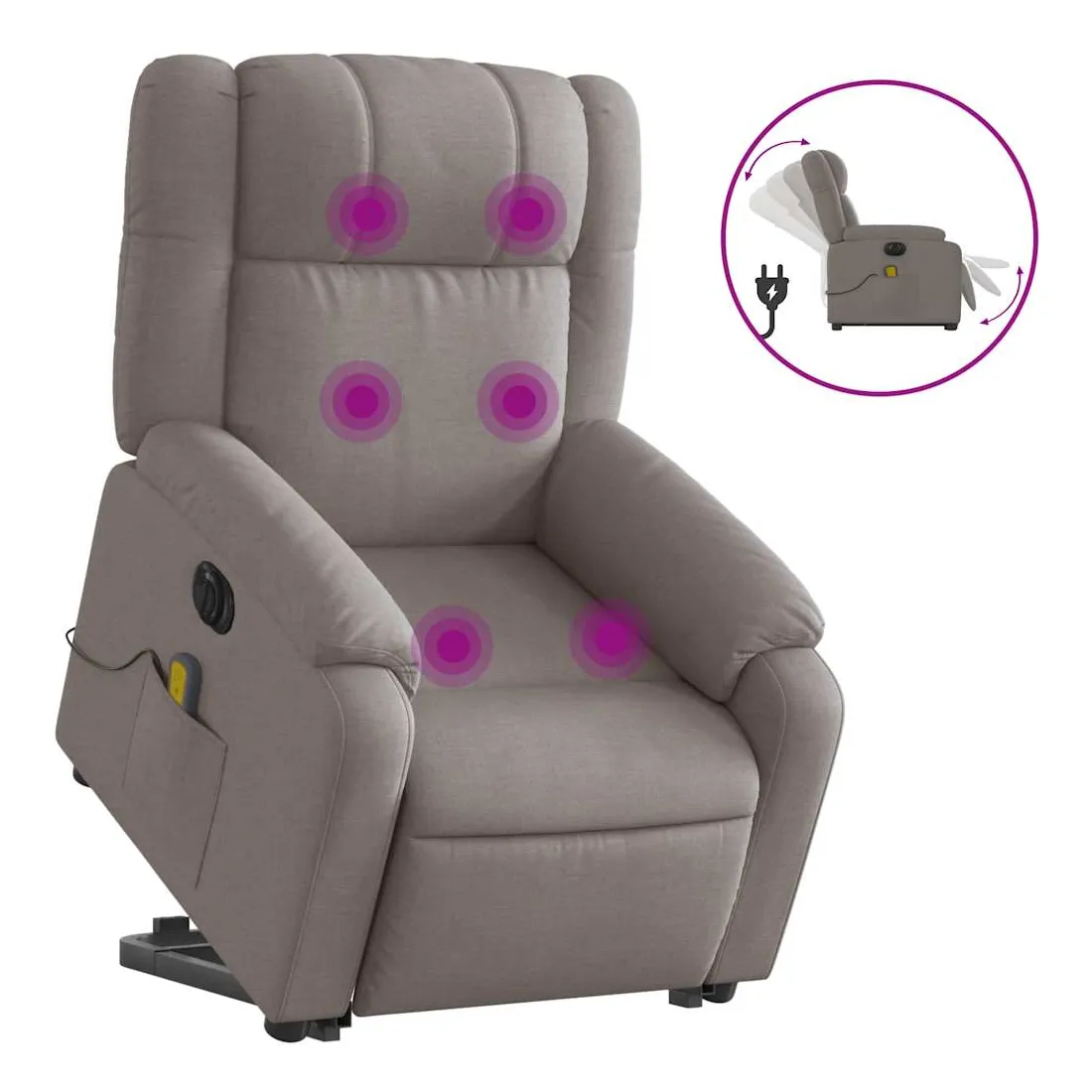Asseyez-vous et détendez-vous dans ce fauteuil inclinable de massage électrique très confortable ! Fonction de levage électrique : ce fauteuil inclinable pour personnes âgées est équipé d'un moteur électrique pour la fonction de levage. Grâce à la fonction qui pousse toute la chaise vers le haut, vous pouvez facilement vous tenir debout sans stresser votre dos et vos genoux en appuyant simplement sur le bouton.Fonction d'inclinaison électrique : ce fauteuil inclinable est également équipé d'un moteur électrique qui permet de régler automatiquement le repose-pied et le dossier dans n'importe quelle position, selon votre confort, en appuyant simplement sur le bouton situé sur le côté du fauteuil. Cette fonction permet une inclinaison maximale de 135 degrés. En outre, le dossier peut revenir automatiquement à sa position d'origine par une simple pression sur le bouton.Fonction de vibration : les 6 points de massage vous permettent de faire l'expérience d'un massage mieux ciblé. De plus, la télécommande incluse vous permet de choisir différents programmes de massage. La fonction de massage est alimentée par le connecteur USB qui nécessite une source d'alimentation USB certifiée de 5 V (non fournie).Expérience d'assise confortable : le siège, le dossier et les larges accoudoirs bien rembourrés recouverts de tissu procurent une sensation confortable et chaleureuse, vous permettant de vous sentir enveloppé lorsque vous êtes assis. Le tissu présente un aspect simple et épuré et est respirant et durable.Poche latérale pratique : ce fauteuil est doté d'une poche latérale pour ranger votre télécommande ou garder vos objets essentiels à portée de main.Cadre solide et stable : le cadre en bois et en métal offre une structure solide et une grande stabilité. Ce fauteuil inclinable est confortable et durable.