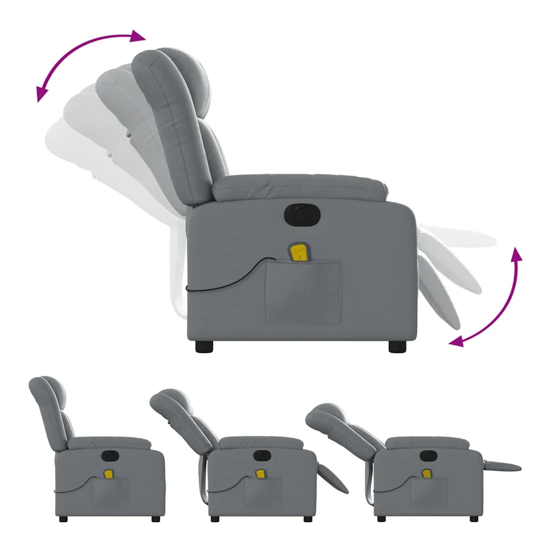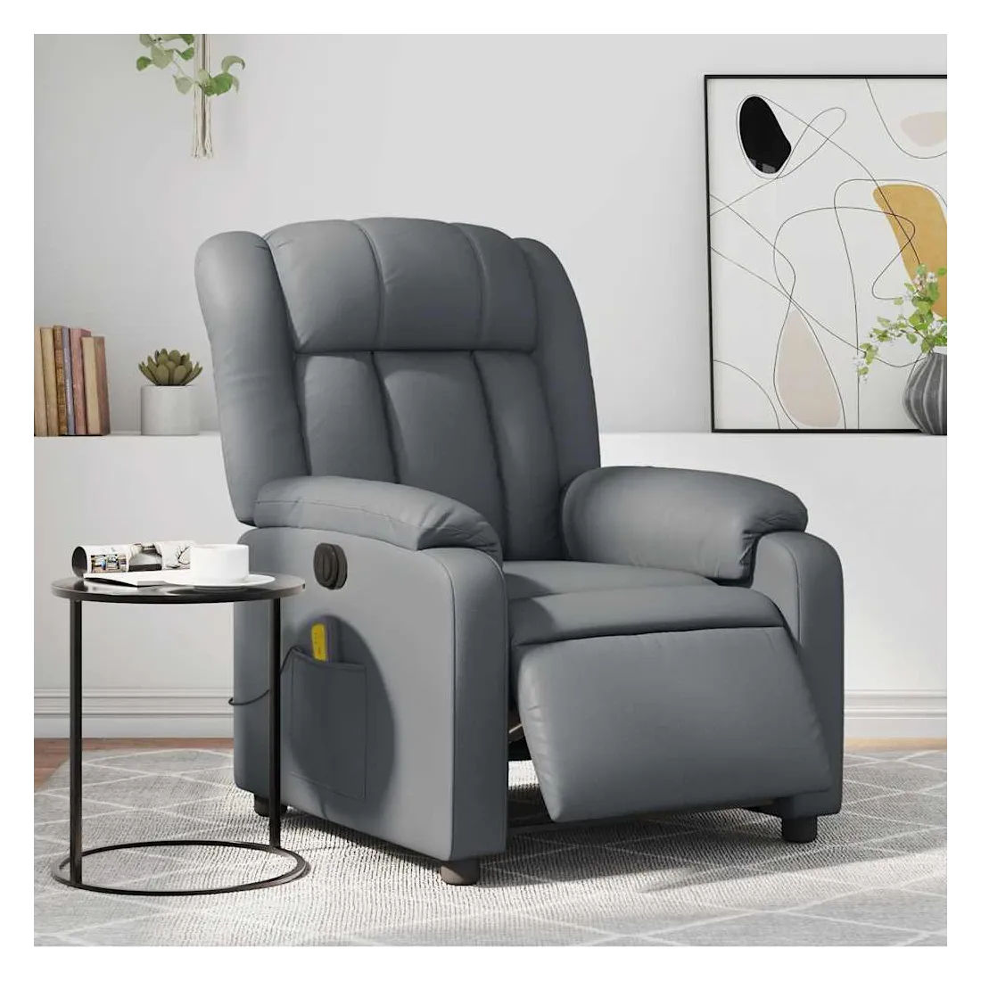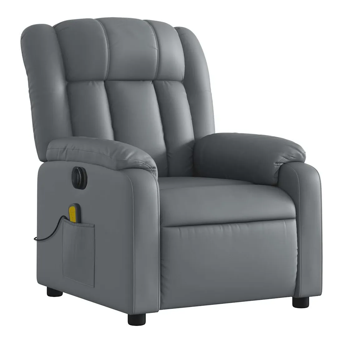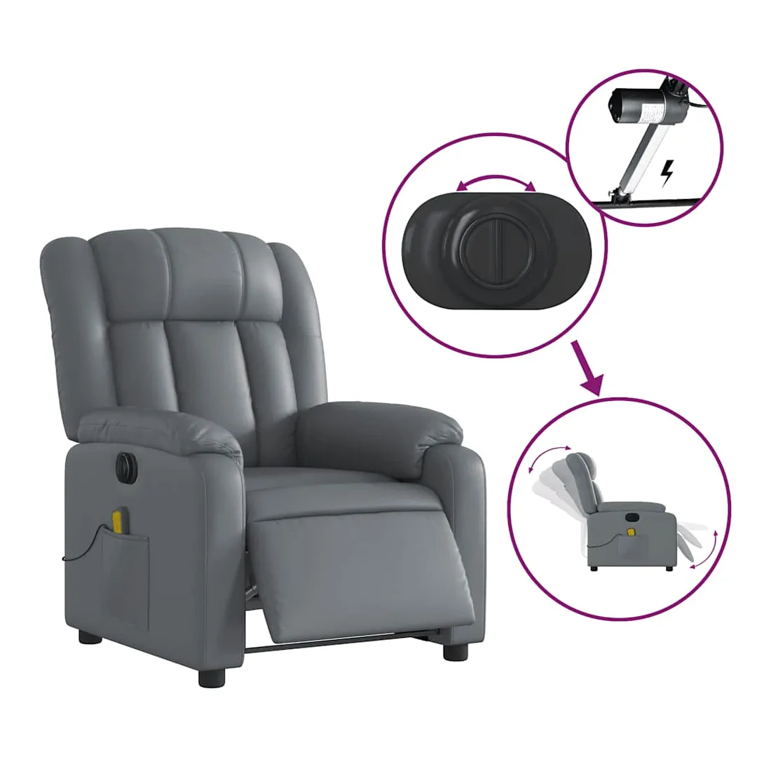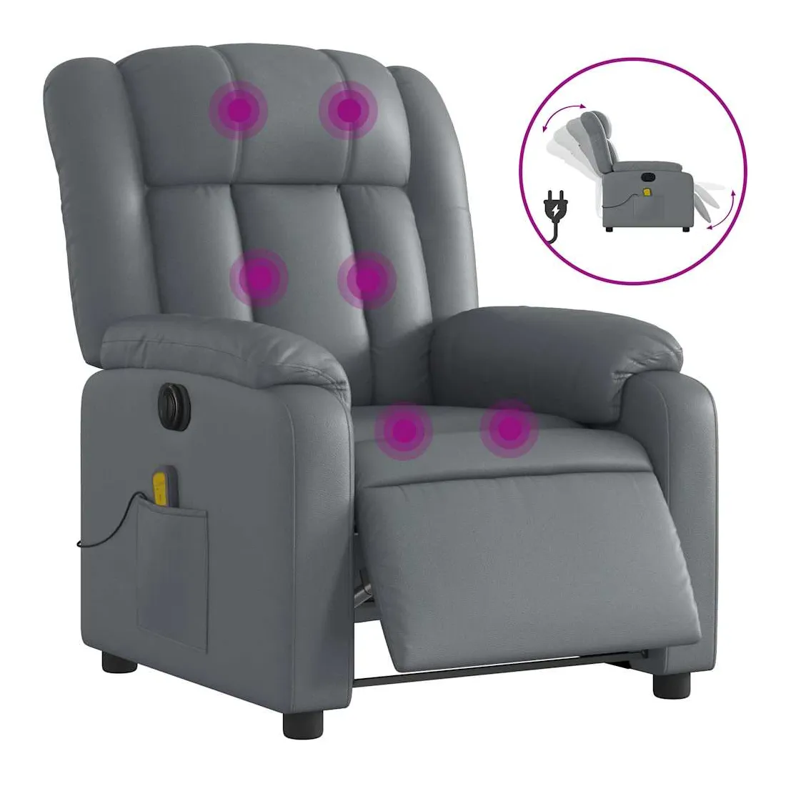 Asseyez-vous et détendez-vous dans ce fauteuil inclinable de massage électrique très confortable ! Fonction d'inclinaison électrique : ce fauteuil inclinable est équipé d'un moteur électrique qui permet de régler automatiquement le repose-pied et le dossier dans n'importe quelle position, selon votre confort, en appuyant simplement sur le bouton situé sur le côté du fauteuil. Cette fonction permet une inclinaison maximale de 135 degrés. En outre, le dossier peut revenir automatiquement à sa position d'origine par une simple pression sur le bouton.Fonction de vibration : les 6 points de massage vous permettent de faire l'expérience d'un massage mieux ciblé. De plus, la télécommande incluse vous permet de choisir différents programmes de massage. La fonction de massage est alimentée par le connecteur USB qui nécessite une source d'alimentation USB certifiée de 5 V (non fournie).Expérience de siège confortable : le siège, le dossier et les larges accoudoirs rembourrés épais recouverts de similicuir procurent une sensation confortable et chaleureuse, vous faisant vous sentir enlacé lorsque vous êtes assis. Le simili cuir est un matériau très résistant. Il est résistant aux taches, ce qui le rend facile à nettoyer avec un chiffon humide. La surface lisse donne également un aspect luxueux et la beauté du cuir véritable.Poche latérale pratique : ce fauteuil est doté d'une poche latérale pour ranger votre télécommande ou garder vos objets essentiels à portée de main.Cadre solide et stable : le cadre en bois et en métal offre une structure solide et une grande stabilité. Ce fauteuil inclinable est confortable et durable.