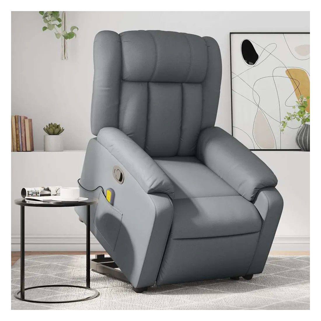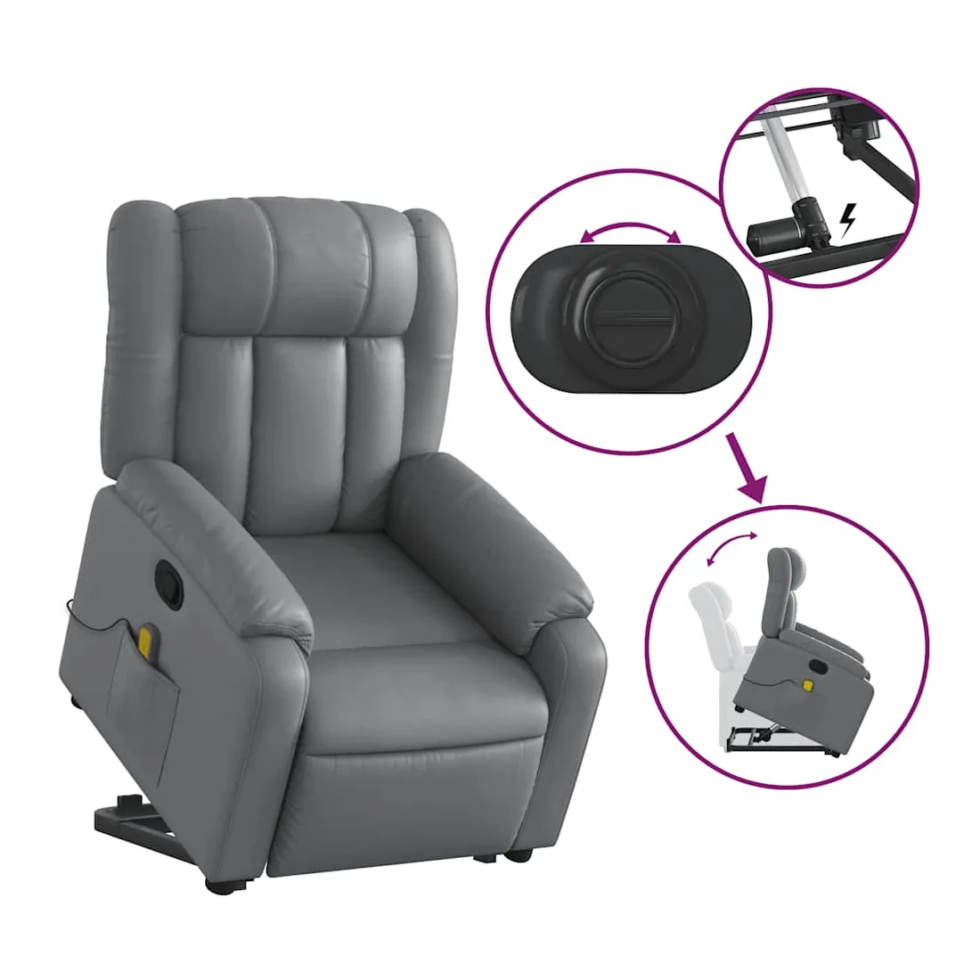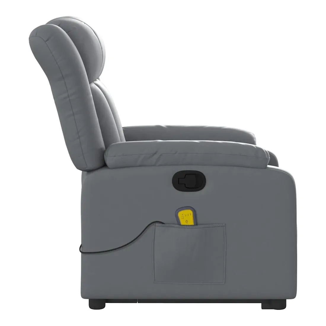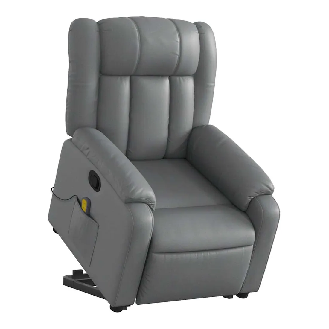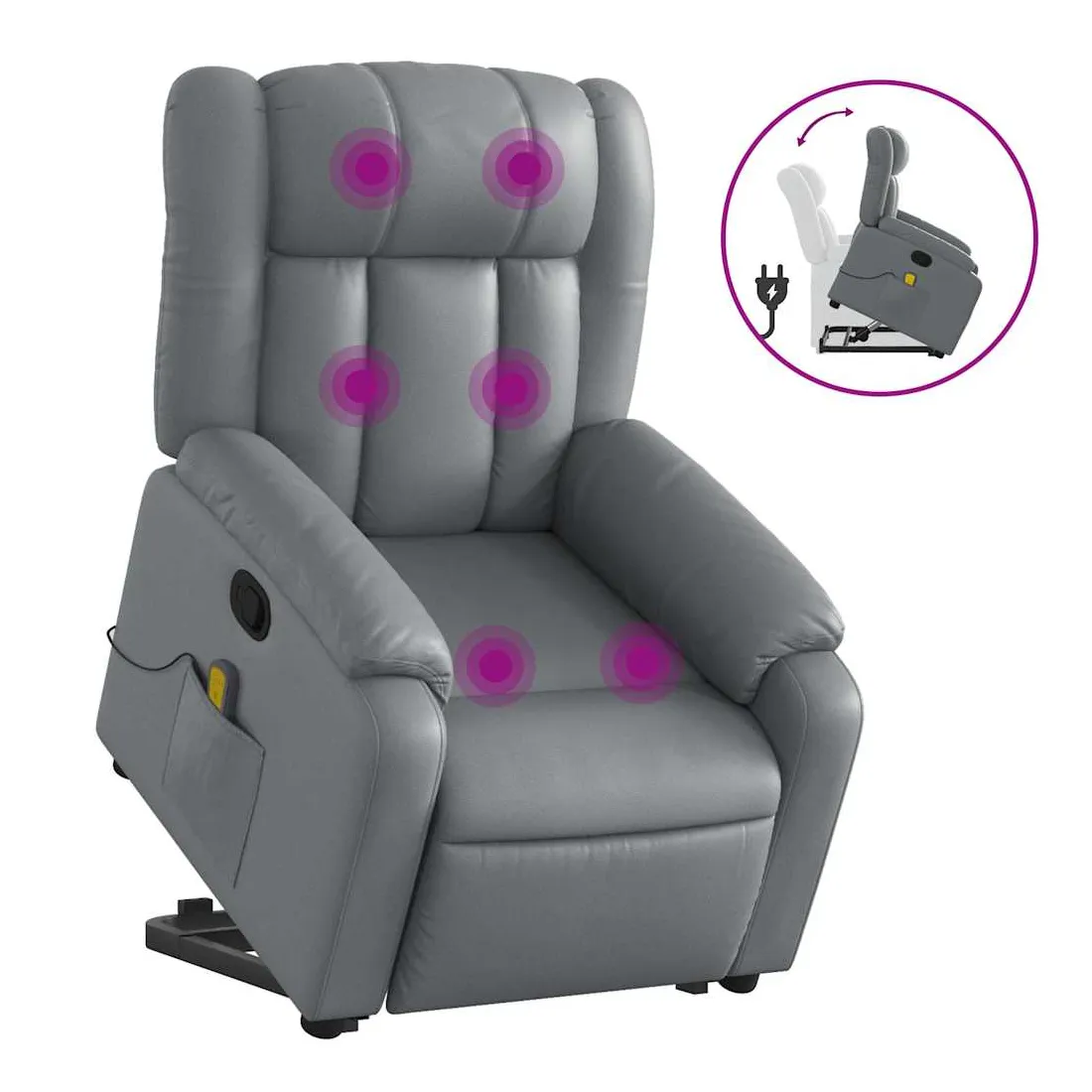 Asseyez-vous et détendez-vous dans ce fauteuil inclinable de massage très confortable ! Fonction de levage électrique : ce fauteuil inclinable pour personnes âgées est équipé d'un moteur électrique pour la fonction de levage. Grâce à la fonction qui pousse toute la chaise vers le haut, vous pouvez facilement vous tenir debout sans stresser votre dos et vos genoux en appuyant simplement sur le bouton.Fonction d'inclinaison manuelle : ce fauteuil inclinable est doté d'une poignée du côté droit. Vous pouvez régler manuellement le repose-pieds et le dossier dans n'importe quelle position selon votre confort en tirant simplement sur la poignée. Cette fonction permet une inclinaison maximale de 135 degrés. De plus, le dossier peut revenir rapidement à sa position d'origine en tirant simplement sur la poignée.Fonction de vibration : les 6 points de massage vous permettent de faire l'expérience d'un massage mieux ciblé. De plus, la télécommande incluse vous permet de choisir différents programmes de massage. La fonction de massage est alimentée par le connecteur USB qui nécessite une source d'alimentation USB certifiée de 5 V (non fournie).Expérience de siège confortable : le siège, le dossier et les larges accoudoirs rembourrés épais recouverts de similicuir procurent une sensation confortable et chaleureuse, vous faisant vous sentir enlacé lorsque vous êtes assis. Le simili cuir est un matériau très résistant. Il est résistant aux taches, ce qui le rend facile à nettoyer avec un chiffon humide. La surface lisse donne également un aspect luxueux et la beauté du cuir véritable.Poche latérale pratique : ce fauteuil est doté d'une poche latérale pour ranger votre télécommande ou garder vos objets essentiels à portée de main.Cadre solide et stable : le cadre en bois et en métal offre une structure solide et une grande stabilité. Ce fauteuil inclinable est confortable et durable.