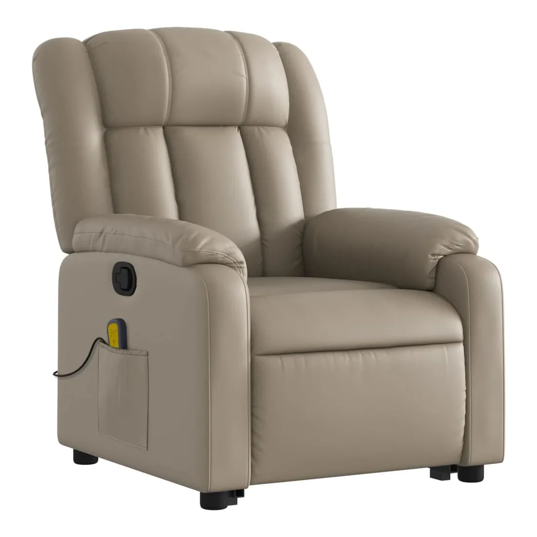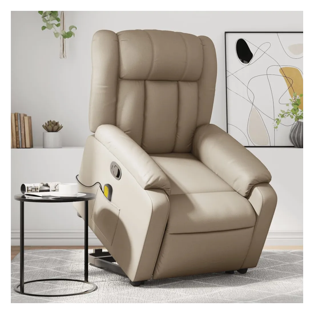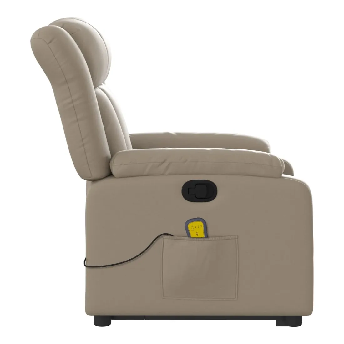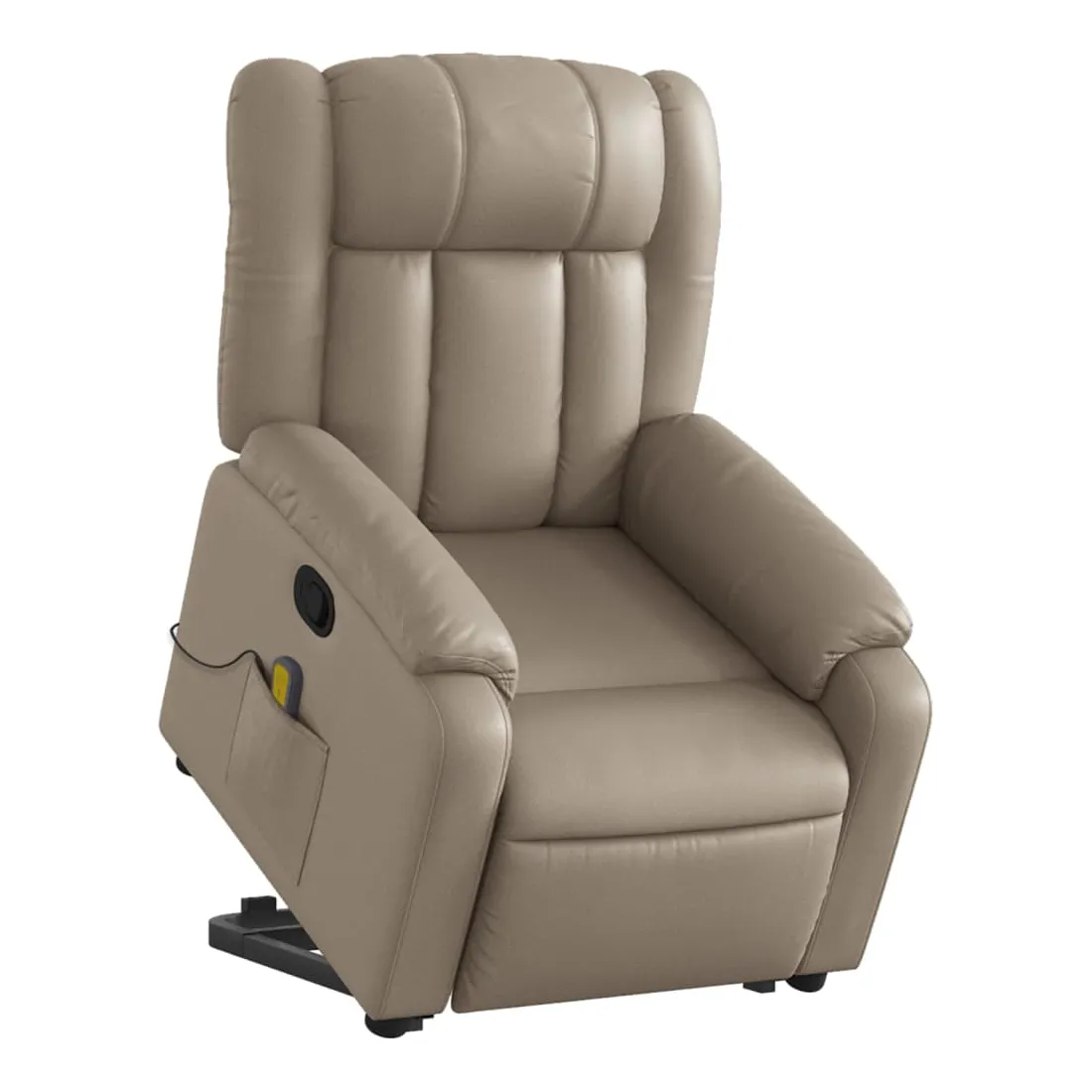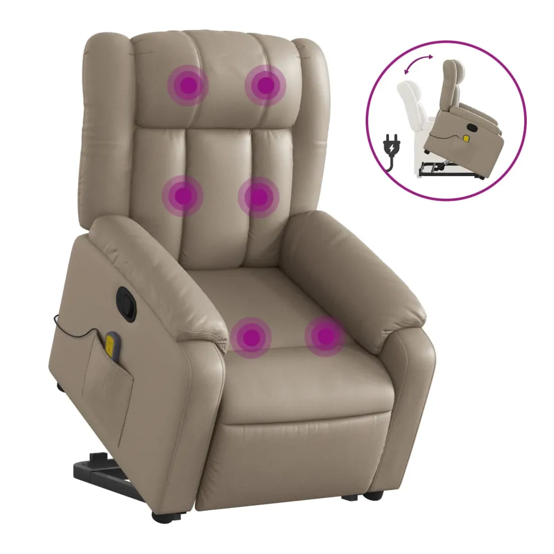Asseyez-vous et détendez-vous dans ce fauteuil inclinable de massage très confortable ! Fonction de levage électrique : ce fauteuil inclinable pour personnes âgées est équipé d'un moteur électrique pour la fonction de levage. Grâce à la fonction qui pousse toute la chaise vers le haut, vous pouvez facilement vous tenir debout sans stresser votre dos et vos genoux en appuyant simplement sur le bouton.Fonction d'inclinaison manuelle : ce fauteuil inclinable est doté d'une poignée du côté droit. Vous pouvez régler manuellement le repose-pieds et le dossier dans n'importe quelle position selon votre confort en tirant simplement sur la poignée. Cette fonction permet une inclinaison maximale de 135 degrés. De plus, le dossier peut revenir rapidement à sa position d'origine en tirant simplement sur la poignée.Fonction de vibration : les 6 points de massage vous permettent de faire l'expérience d'un massage mieux ciblé. De plus, la télécommande incluse vous permet de choisir différents programmes de massage. La fonction de massage est alimentée par le connecteur USB qui nécessite une source d'alimentation USB certifiée de 5 V (non fournie).Expérience de siège confortable : le siège, le dossier et les larges accoudoirs rembourrés épais recouverts de similicuir procurent une sensation confortable et chaleureuse, vous faisant vous sentir enlacé lorsque vous êtes assis. Le simili cuir est un matériau très résistant. Il est résistant aux taches, ce qui le rend facile à nettoyer avec un chiffon humide. La surface lisse donne également un aspect luxueux et la beauté du cuir véritable.Poche latérale pratique : ce fauteuil est doté d'une poche latérale pour ranger votre télécommande ou garder vos objets essentiels à portée de main.Cadre solide et stable : le cadre en bois et en métal offre une structure solide et une grande stabilité. Ce fauteuil inclinable est confortable et durable.