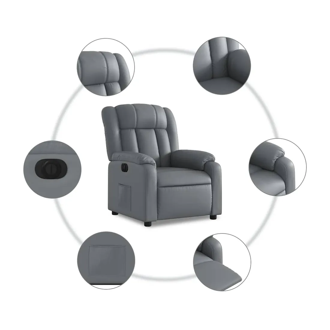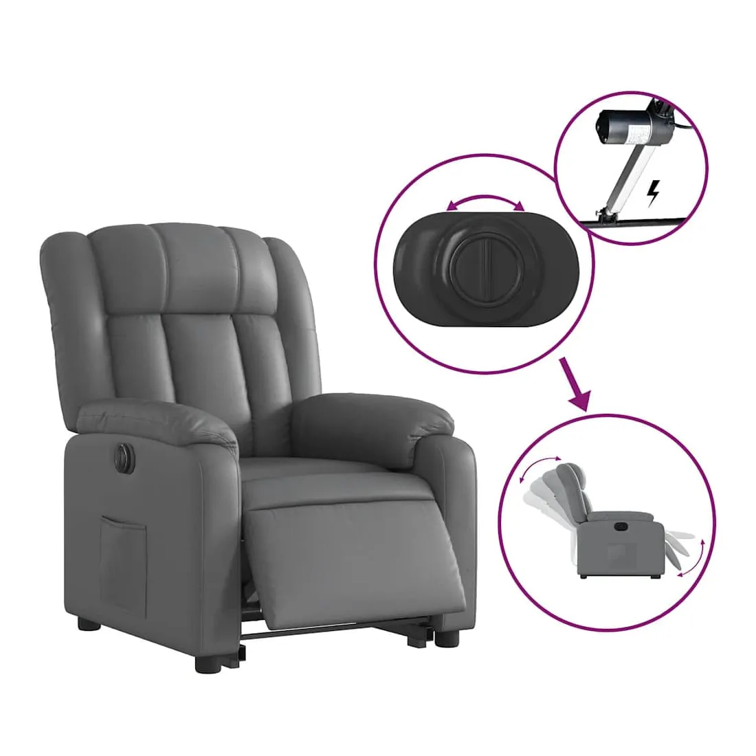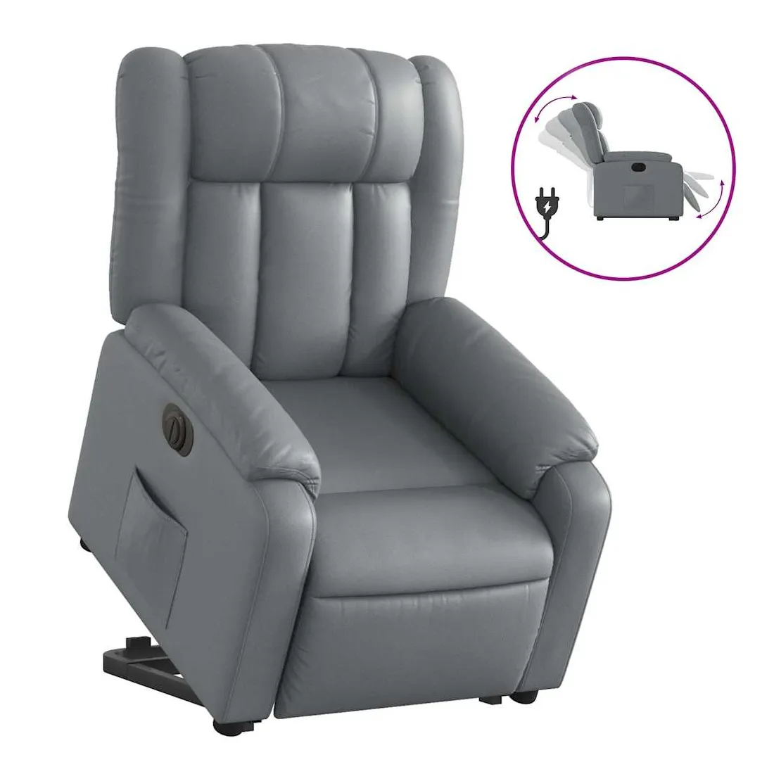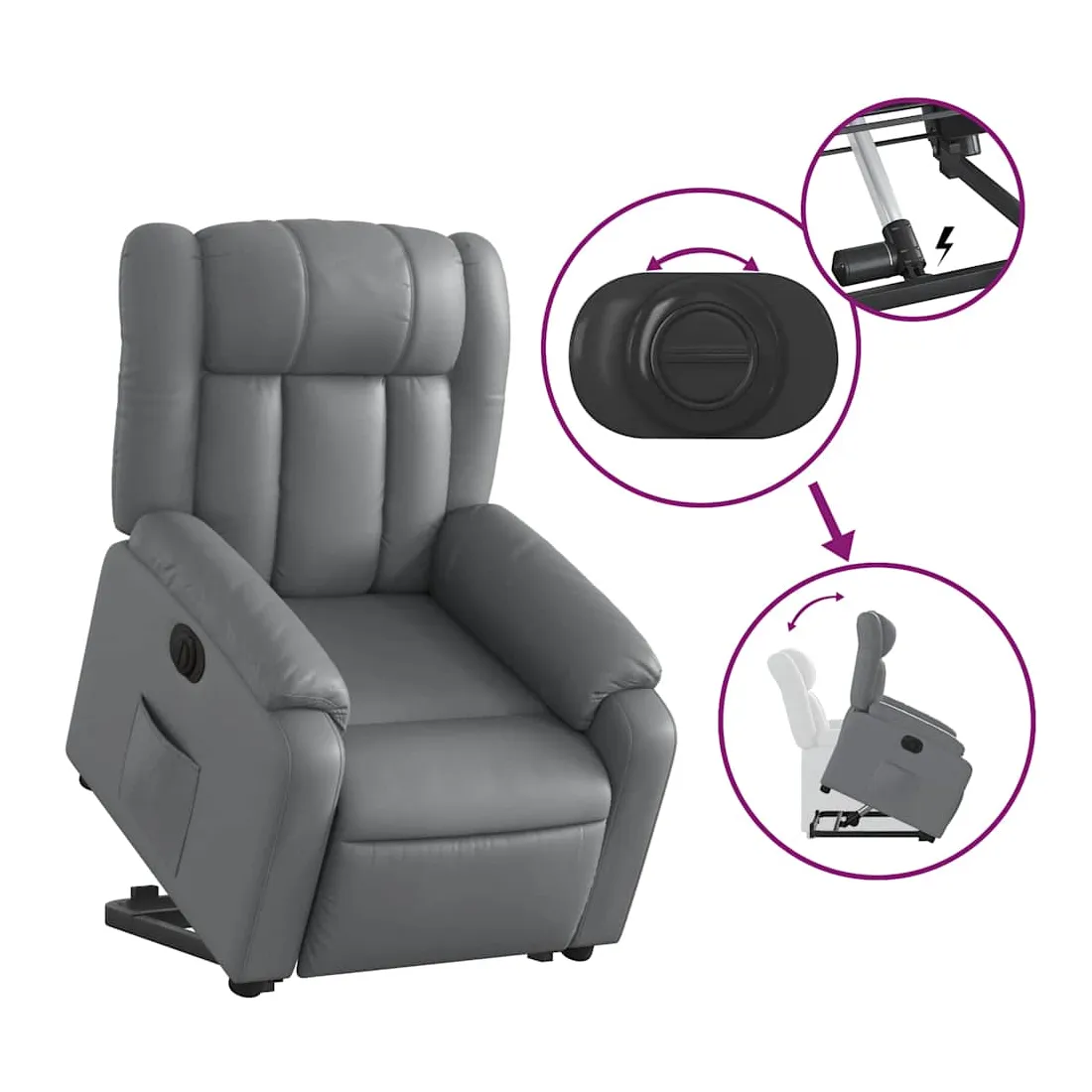 Asseyez-vous et détendez-vous dans ce fauteuil inclinable électrique très confortable ! Fonction de levage électrique : ce fauteuil inclinable pour personnes âgées est équipé d'un moteur électrique pour la fonction de levage. Grâce à la fonction qui pousse toute la chaise vers le haut, vous pouvez facilement vous tenir debout sans stresser votre dos et vos genoux en appuyant simplement sur le bouton.Fonction d'inclinaison électrique : ce fauteuil inclinable est également équipé d'un moteur électrique qui permet de régler automatiquement le repose-pied et le dossier dans n'importe quelle position, selon votre confort, en appuyant simplement sur le bouton situé sur le côté du fauteuil. Cette fonction permet une inclinaison maximale de 135 degrés. En outre, le dossier peut revenir automatiquement à sa position d'origine par une simple pression sur le bouton.Expérience de siège confortable : le siège, le dossier et les larges accoudoirs rembourrés épais recouverts de similicuir procurent une sensation confortable et chaleureuse, vous faisant vous sentir enlacé lorsque vous êtes assis. Le simili cuir est un matériau très résistant. Il est résistant aux taches, ce qui le rend facile à nettoyer avec un chiffon humide. La surface lisse donne également un aspect luxueux et la beauté du cuir véritable.Poche latérale pratique : ce fauteuil est doté d'une poche latérale pour vous permettre de garder vos objets essentiels à portée de main.Cadre solide et stable : le cadre en bois et en métal offre une structure solide et une grande stabilité. Ce fauteuil inclinable est confortable et durable.
