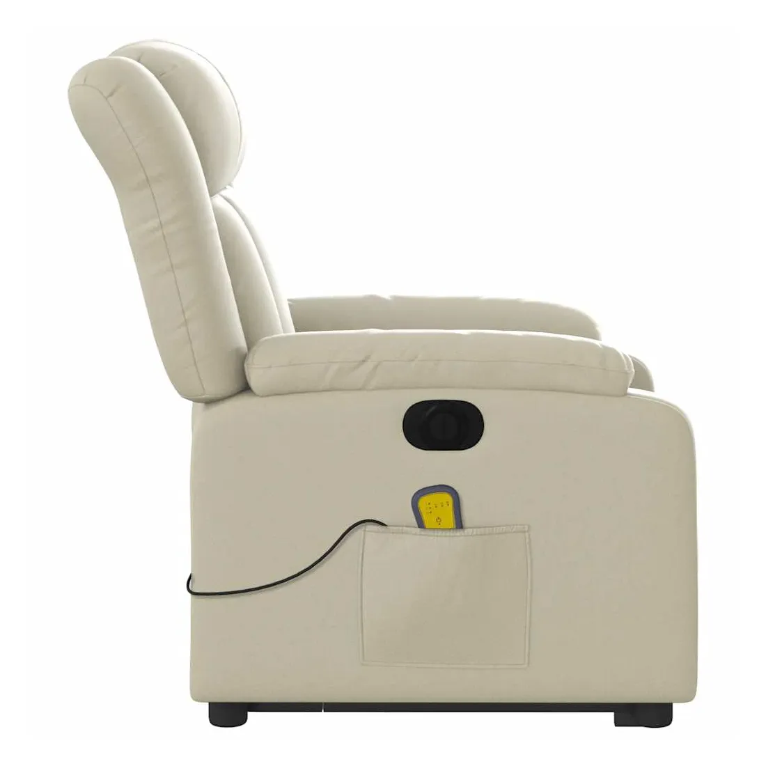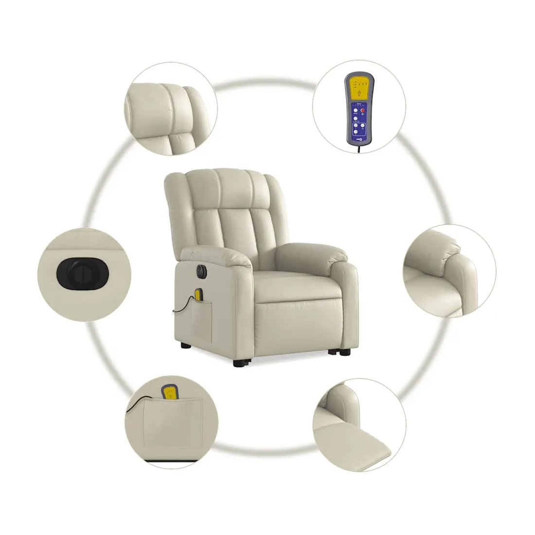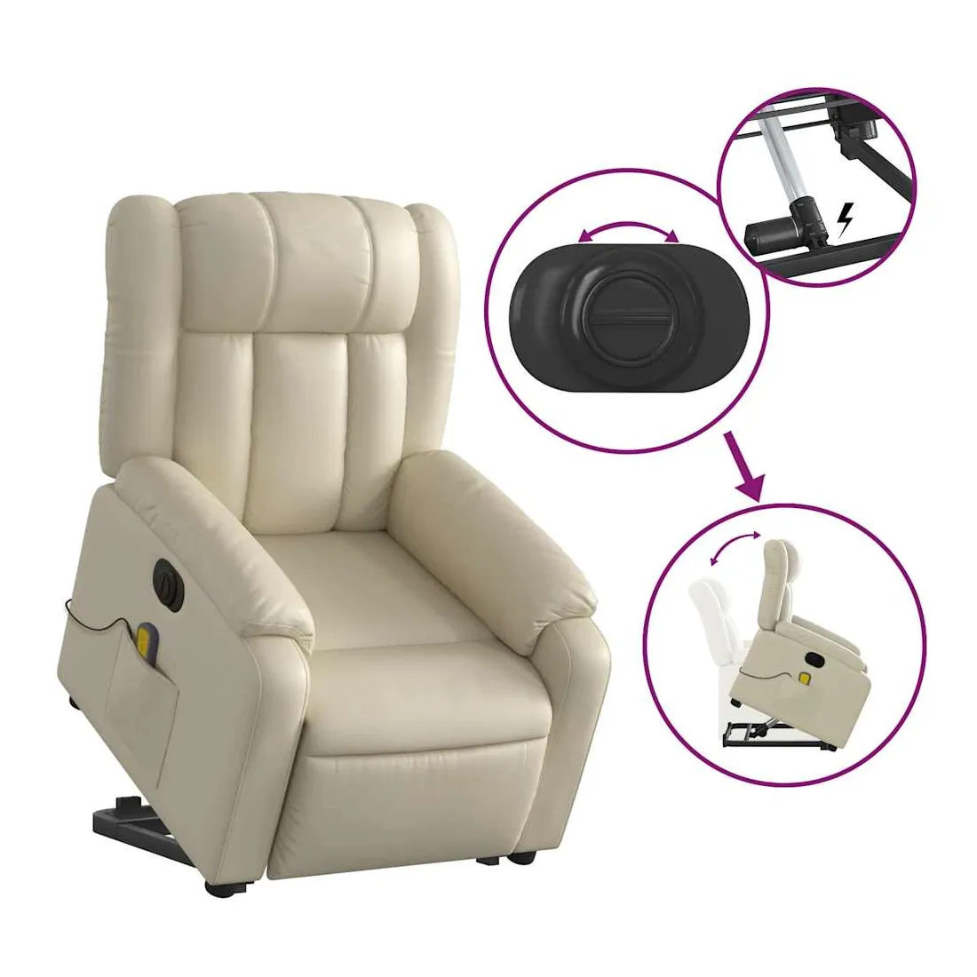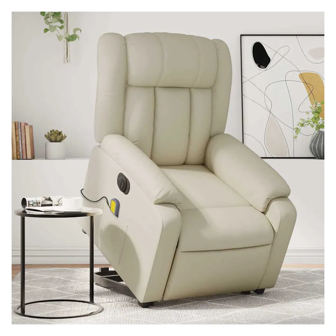 Asseyez-vous et détendez-vous dans ce fauteuil inclinable de massage électrique très confortable ! Fonction de levage électrique : ce fauteuil inclinable pour personnes âgées est équipé d'un moteur électrique pour la fonction de levage. Grâce à la fonction qui pousse toute la chaise vers le haut, vous pouvez facilement vous tenir debout sans stresser votre dos et vos genoux en appuyant simplement sur le bouton.Fonction d'inclinaison électrique : ce fauteuil inclinable est également équipé d'un moteur électrique qui permet de régler automatiquement le repose-pied et le dossier dans n'importe quelle position, selon votre confort, en appuyant simplement sur le bouton situé sur le côté du fauteuil. Cette fonction permet une inclinaison maximale de 135 degrés. En outre, le dossier peut revenir automatiquement à sa position d'origine par une simple pression sur le bouton.Fonction de vibration : les 6 points de massage vous permettent de faire l'expérience d'un massage mieux ciblé. De plus, la télécommande incluse vous permet de choisir différents programmes de massage. La fonction de massage est alimentée par le connecteur USB qui nécessite une source d'alimentation USB certifiée de 5 V (non fournie).Expérience de siège confortable : le siège, le dossier et les larges accoudoirs rembourrés épais recouverts de similicuir procurent une sensation confortable et chaleureuse, vous faisant vous sentir enlacé lorsque vous êtes assis. Le simili cuir est un matériau très résistant. Il est résistant aux taches, ce qui le rend facile à nettoyer avec un chiffon humide. La surface lisse donne également un aspect luxueux et la beauté du cuir véritable.Poche latérale pratique : ce fauteuil est doté d'une poche latérale pour ranger votre télécommande ou garder vos objets essentiels à portée de main.Cadre solide et stable : le cadre en bois et en métal offre une structure solide et une grande stabilité. Ce fauteuil inclinable est confortable et durable.