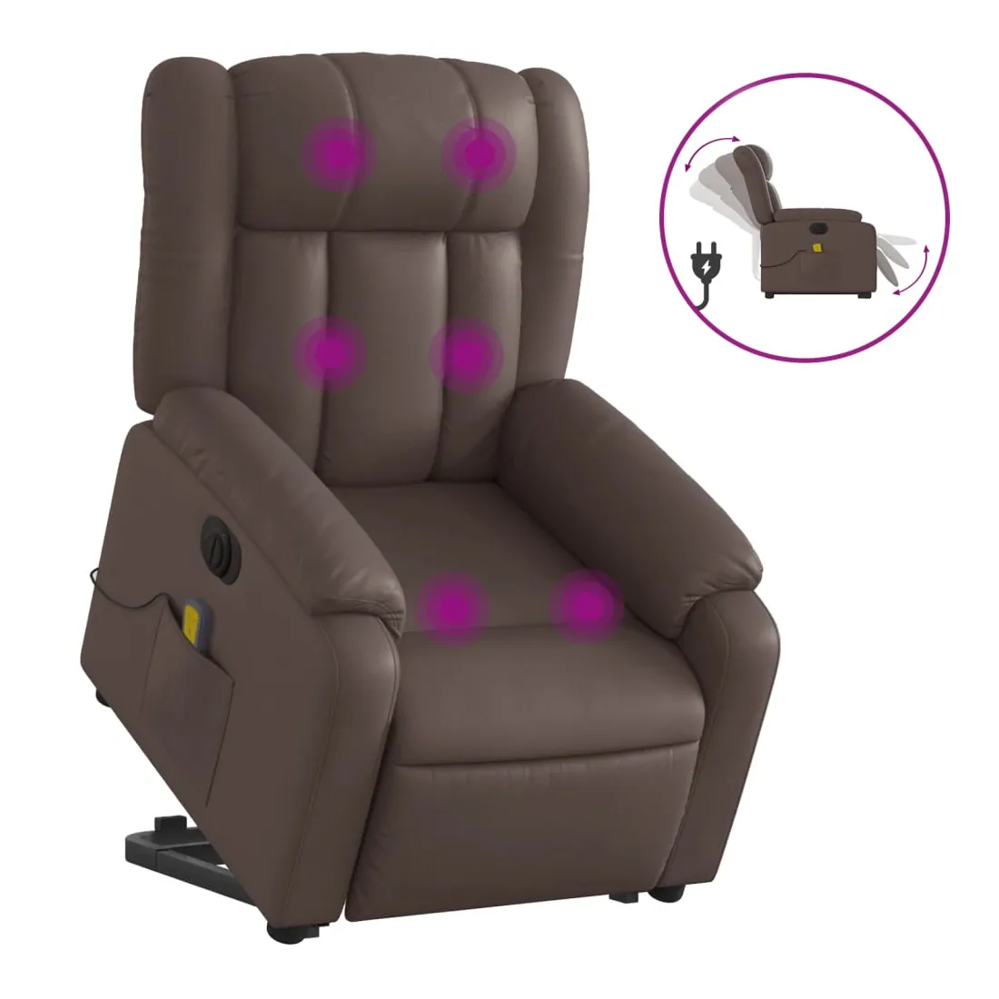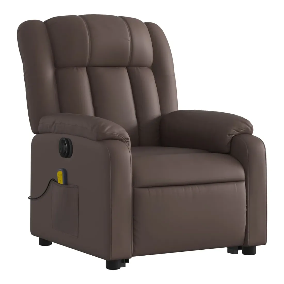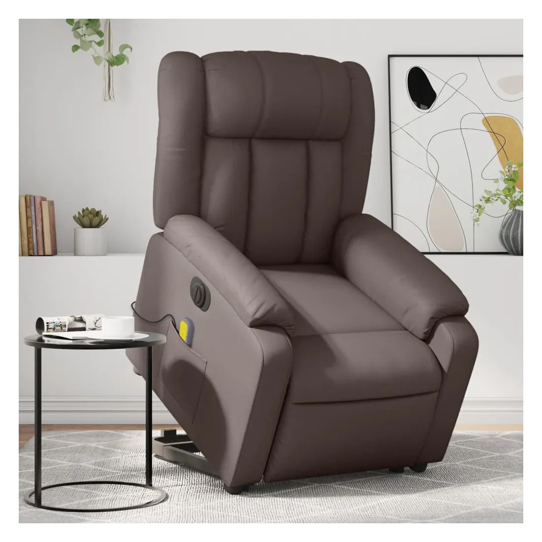 Asseyez-vous et détendez-vous dans ce fauteuil inclinable de massage électrique très confortable ! Fonction de levage électrique : ce fauteuil inclinable pour personnes âgées est équipé d'un moteur électrique pour la fonction de levage. Grâce à la fonction qui pousse toute la chaise vers le haut, vous pouvez facilement vous tenir debout sans stresser votre dos et vos genoux en appuyant simplement sur le bouton.Fonction d'inclinaison électrique : ce fauteuil inclinable est également équipé d'un moteur électrique qui permet de régler automatiquement le repose-pied et le dossier dans n'importe quelle position, selon votre confort, en appuyant simplement sur le bouton situé sur le côté du fauteuil. Cette fonction permet une inclinaison maximale de 135 degrés. En outre, le dossier peut revenir automatiquement à sa position d'origine par une simple pression sur le bouton.Fonction de vibration : les 6 points de massage vous permettent de faire l'expérience d'un massage mieux ciblé. De plus, la télécommande incluse vous permet de choisir différents programmes de massage. La fonction de massage est alimentée par le connecteur USB qui nécessite une source d'alimentation USB certifiée de 5 V (non fournie).Expérience de siège confortable : le siège, le dossier et les larges accoudoirs rembourrés épais recouverts de similicuir procurent une sensation confortable et chaleureuse, vous faisant vous sentir enlacé lorsque vous êtes assis. Le simili cuir est un matériau très résistant. Il est résistant aux taches, ce qui le rend facile à nettoyer avec un chiffon humide. La surface lisse donne également un aspect luxueux et la beauté du cuir véritable.Poche latérale pratique : ce fauteuil est doté d'une poche latérale pour ranger votre télécommande ou garder vos objets essentiels à portée de main.Cadre solide et stable : le cadre en bois et en métal offre une structure solide et une grande stabilité. Ce fauteuil inclinable est confortable et durable.