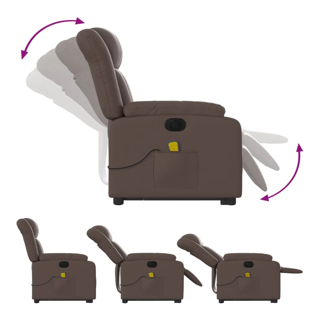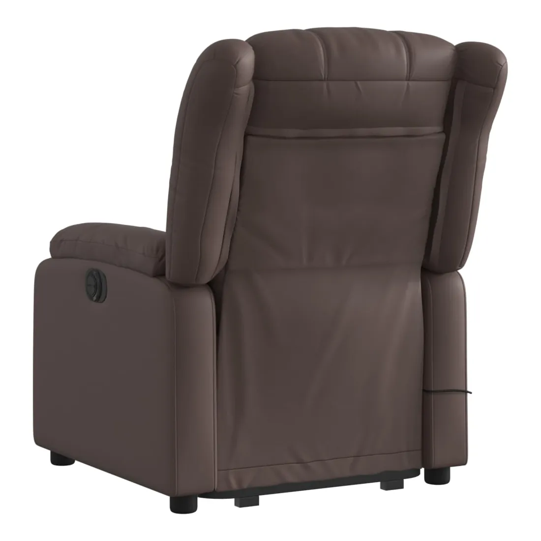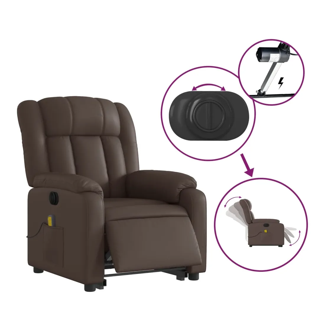 Asseyez-vous et détendez-vous dans ce fauteuil inclinable de massage électrique très confortable ! Fonction de levage électrique : ce fauteuil inclinable pour personnes âgées est équipé d'un moteur électrique pour la fonction de levage. Grâce à la fonction qui pousse toute la chaise vers le haut, vous pouvez facilement vous tenir debout sans stresser votre dos et vos genoux en appuyant simplement sur le bouton.Fonction d'inclinaison électrique : ce fauteuil inclinable est également équipé d'un moteur électrique qui permet de régler automatiquement le repose-pied et le dossier dans n'importe quelle position, selon votre confort, en appuyant simplement sur le bouton situé sur le côté du fauteuil. Cette fonction permet une inclinaison maximale de 135 degrés. En outre, le dossier peut revenir automatiquement à sa position d'origine par une simple pression sur le bouton.Fonction de vibration : les 6 points de massage vous permettent de faire l'expérience d'un massage mieux ciblé. De plus, la télécommande incluse vous permet de choisir différents programmes de massage. La fonction de massage est alimentée par le connecteur USB qui nécessite une source d'alimentation USB certifiée de 5 V (non fournie).Expérience de siège confortable : le siège, le dossier et les larges accoudoirs rembourrés épais recouverts de similicuir procurent une sensation confortable et chaleureuse, vous faisant vous sentir enlacé lorsque vous êtes assis. Le simili cuir est un matériau très résistant. Il est résistant aux taches, ce qui le rend facile à nettoyer avec un chiffon humide. La surface lisse donne également un aspect luxueux et la beauté du cuir véritable.Poche latérale pratique : ce fauteuil est doté d'une poche latérale pour ranger votre télécommande ou garder vos objets essentiels à portée de main.Cadre solide et stable : le cadre en bois et en métal offre une structure solide et une grande stabilité. Ce fauteuil inclinable est confortable et durable.
