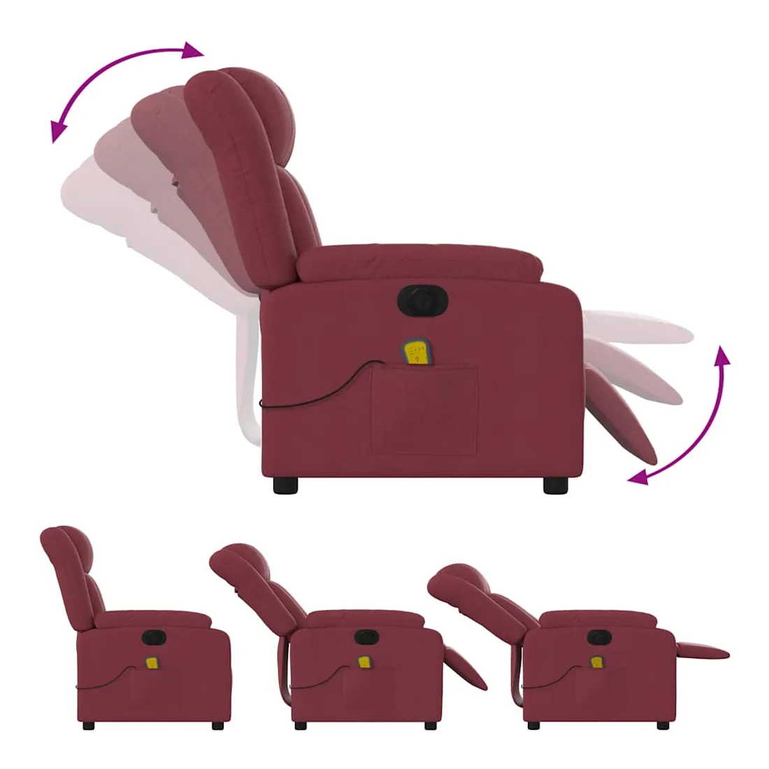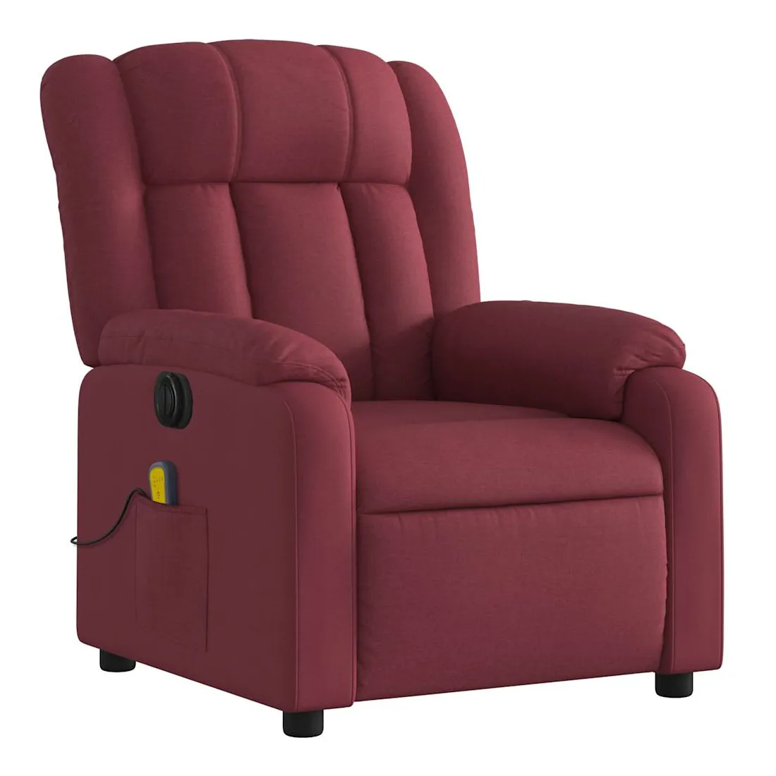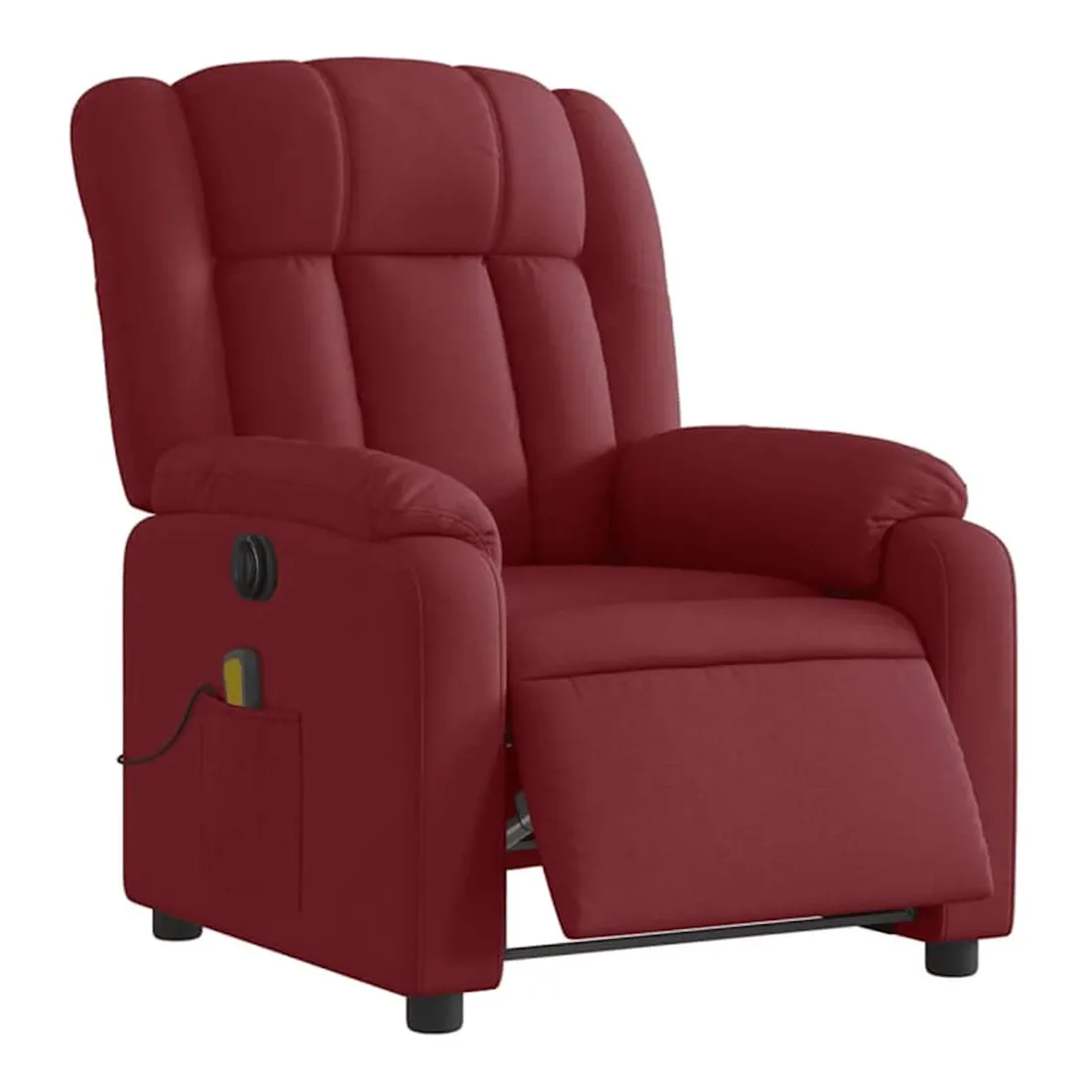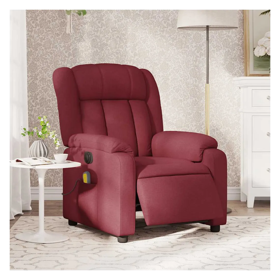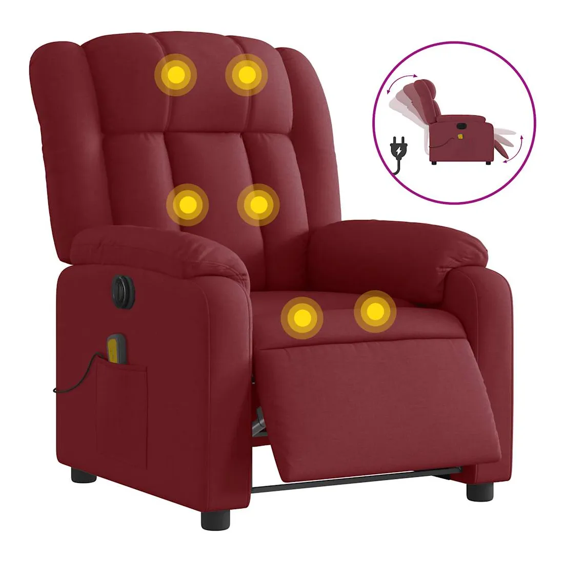 Asseyez-vous et détendez-vous dans ce fauteuil inclinable de massage électrique très confortable ! Fonction d'inclinaison électrique : ce fauteuil inclinable est équipé d'un moteur électrique qui permet de régler automatiquement le repose-pied et le dossier dans n'importe quelle position, selon votre confort, en appuyant simplement sur le bouton situé sur le côté du fauteuil. Cette fonction permet une inclinaison maximale de 135 degrés. En outre, le dossier peut revenir automatiquement à sa position d'origine par une simple pression sur le bouton. Fonction de vibration : les 6 points de massage vous permettent de faire l'expérience d'un massage mieux ciblé. De plus, la télécommande incluse vous permet de choisir différents programmes de massage. La fonction de massage est alimentée par le connecteur USB qui nécessite une source d'alimentation USB certifiée de 5 V (non fournie). Expérience d'assise confortable : le siège, le dossier et les larges accoudoirs bien rembourrés recouverts de tissu procurent une sensation confortable et chaleureuse, vous permettant de vous sentir enveloppé lorsque vous êtes assis. Le tissu présente un aspect simple et épuré et est respirant et durable. Poche latérale pratique : ce fauteuil est doté d'une poche latérale pour ranger votre télécommande ou garder vos objets essentiels à portée de main. Cadre solide et stable : le cadre en bois et en métal offre une structure solide et une grande stabilité. Ce fauteuil inclinable est confortable et durable.