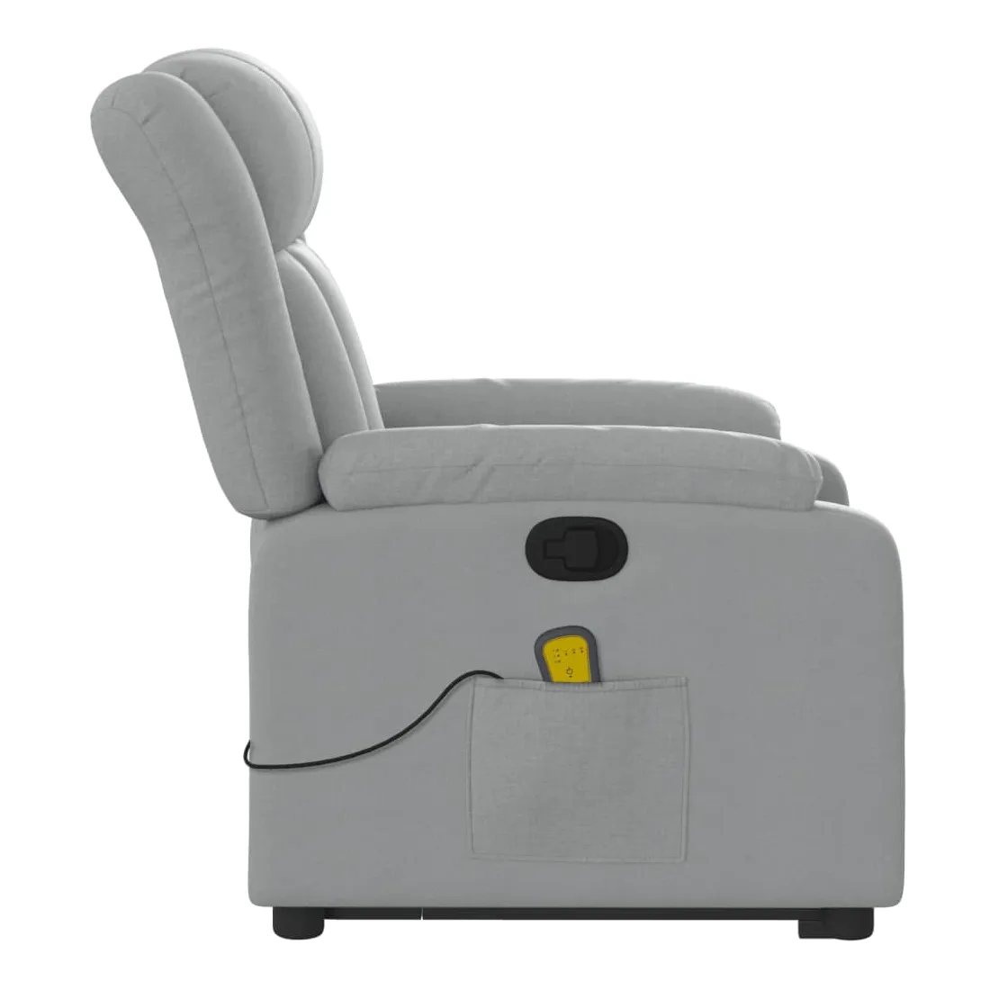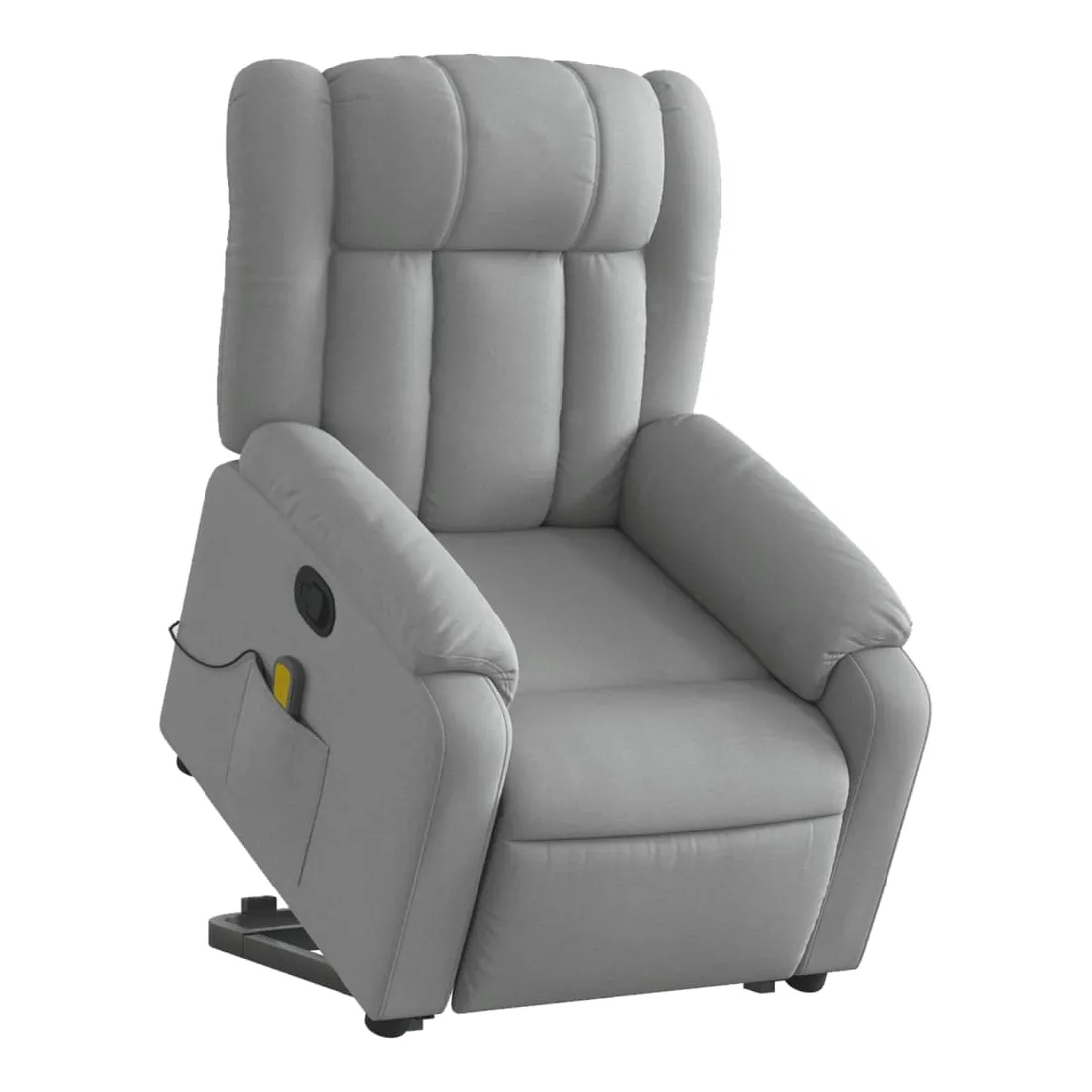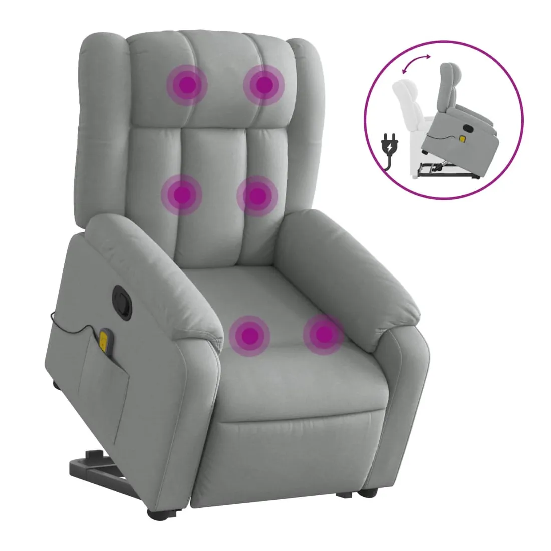 Asseyez-vous et détendez-vous dans ce fauteuil inclinable de massage très confortable ! Fonction de levage électrique : ce fauteuil inclinable pour personnes âgées est équipé d'un moteur électrique pour la fonction de levage. Grâce à la fonction qui pousse toute la chaise vers le haut, vous pouvez facilement vous tenir debout sans stresser votre dos et vos genoux en appuyant simplement sur le bouton. Fonction d'inclinaison manuelle : ce fauteuil inclinable est doté d'une poignée du côté droit. Vous pouvez régler manuellement le repose-pieds et le dossier dans n'importe quelle position selon votre confort en tirant simplement sur la poignée. Cette fonction permet une inclinaison maximale de 135 degrés. De plus, le dossier peut revenir rapidement à sa position d'origine en tirant simplement sur la poignée. Fonction de vibration : les 6 points de massage vous permettent de faire l'expérience d'un massage mieux ciblé. De plus, la télécommande incluse vous permet de choisir différents programmes de massage. La fonction de massage est alimentée par le connecteur USB qui nécessite une source d'alimentation USB certifiée de 5 V (non fournie). Expérience d'assise confortable : le siège, le dossier et les larges accoudoirs bien rembourrés recouverts de tissu procurent une sensation confortable et chaleureuse, vous permettant de vous sentir enveloppé lorsque vous êtes assis. Le tissu présente un aspect simple et épuré et est respirant et durable. Poche latérale pratique : ce fauteuil est doté d'une poche latérale pour ranger votre télécommande ou garder vos objets essentiels à portée de main. Cadre solide et stable : le cadre en bois et en métal offre une structure solide et une grande stabilité. Ce fauteuil inclinable est confortable et durable.