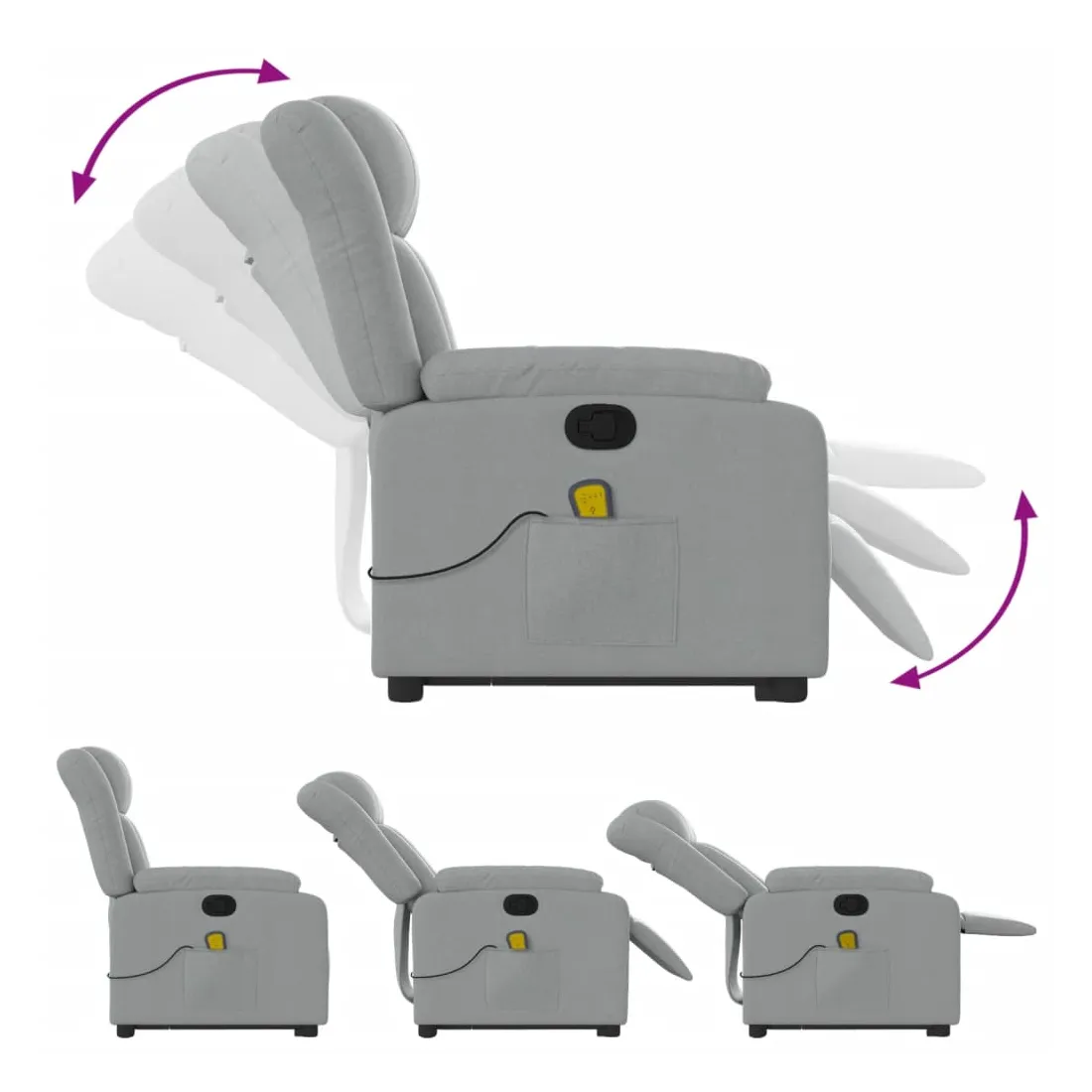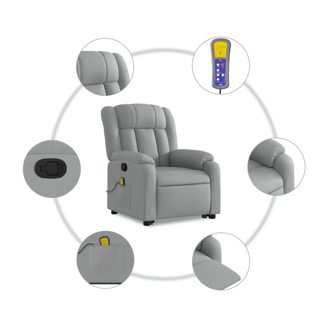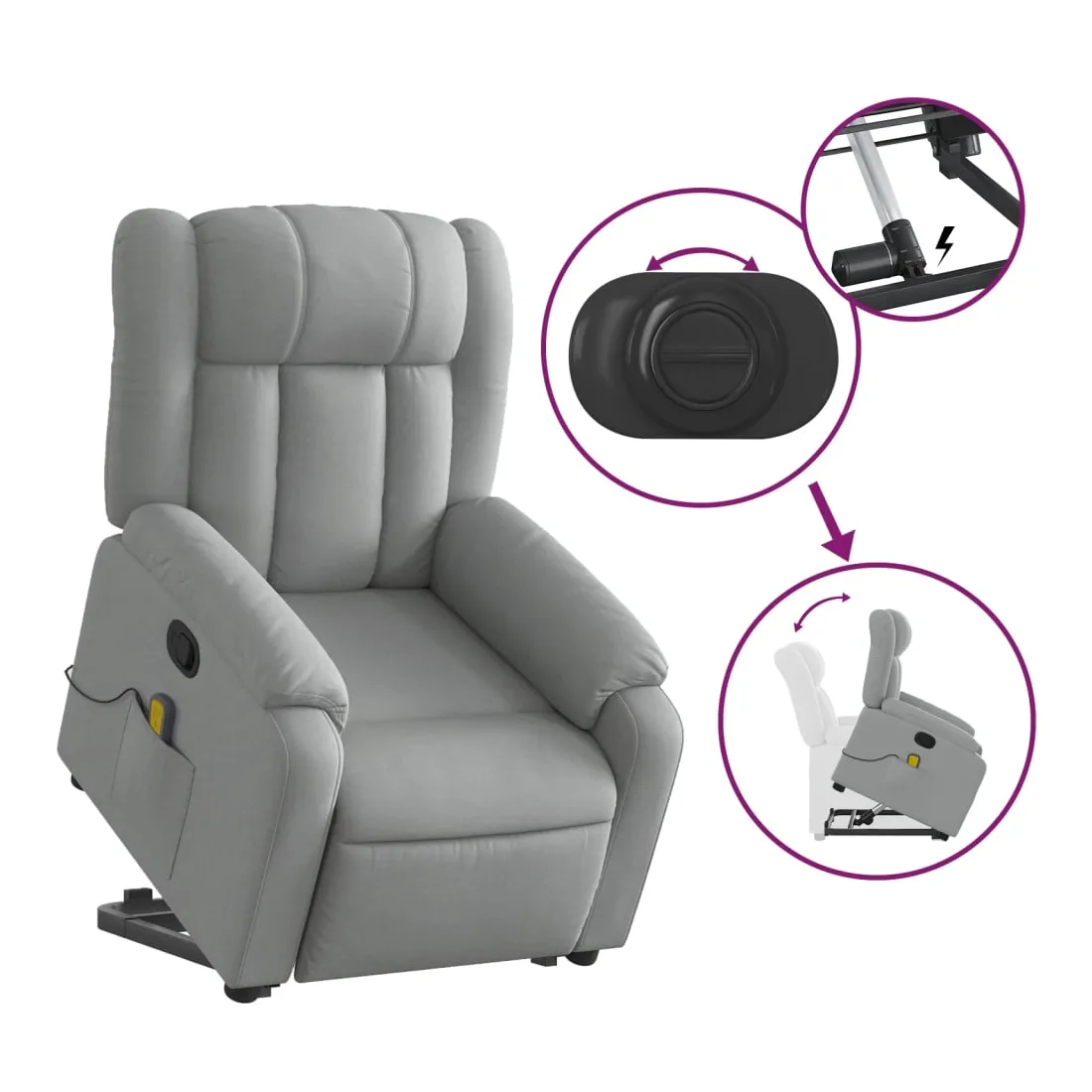 Asseyez-vous et détendez-vous dans ce fauteuil inclinable de massage très confortable ! Fonction de levage électrique : ce fauteuil inclinable pour personnes âgées est équipé d'un moteur électrique pour la fonction de levage. Grâce à la fonction qui pousse toute la chaise vers le haut, vous pouvez facilement vous tenir debout sans stresser votre dos et vos genoux en appuyant simplement sur le bouton. Fonction d'inclinaison manuelle : ce fauteuil inclinable est doté d'une poignée du côté droit. Vous pouvez régler manuellement le repose-pieds et le dossier dans n'importe quelle position selon votre confort en tirant simplement sur la poignée. Cette fonction permet une inclinaison maximale de 135 degrés. De plus, le dossier peut revenir rapidement à sa position d'origine en tirant simplement sur la poignée. Fonction de vibration : les 6 points de massage vous permettent de faire l'expérience d'un massage mieux ciblé. De plus, la télécommande incluse vous permet de choisir différents programmes de massage. La fonction de massage est alimentée par le connecteur USB qui nécessite une source d'alimentation USB certifiée de 5 V (non fournie). Expérience d'assise confortable : le siège, le dossier et les larges accoudoirs bien rembourrés recouverts de tissu procurent une sensation confortable et chaleureuse, vous permettant de vous sentir enveloppé lorsque vous êtes assis. Le tissu présente un aspect simple et épuré et est respirant et durable. Poche latérale pratique : ce fauteuil est doté d'une poche latérale pour ranger votre télécommande ou garder vos objets essentiels à portée de main. Cadre solide et stable : le cadre en bois et en métal offre une structure solide et une grande stabilité. Ce fauteuil inclinable est confortable et durable.