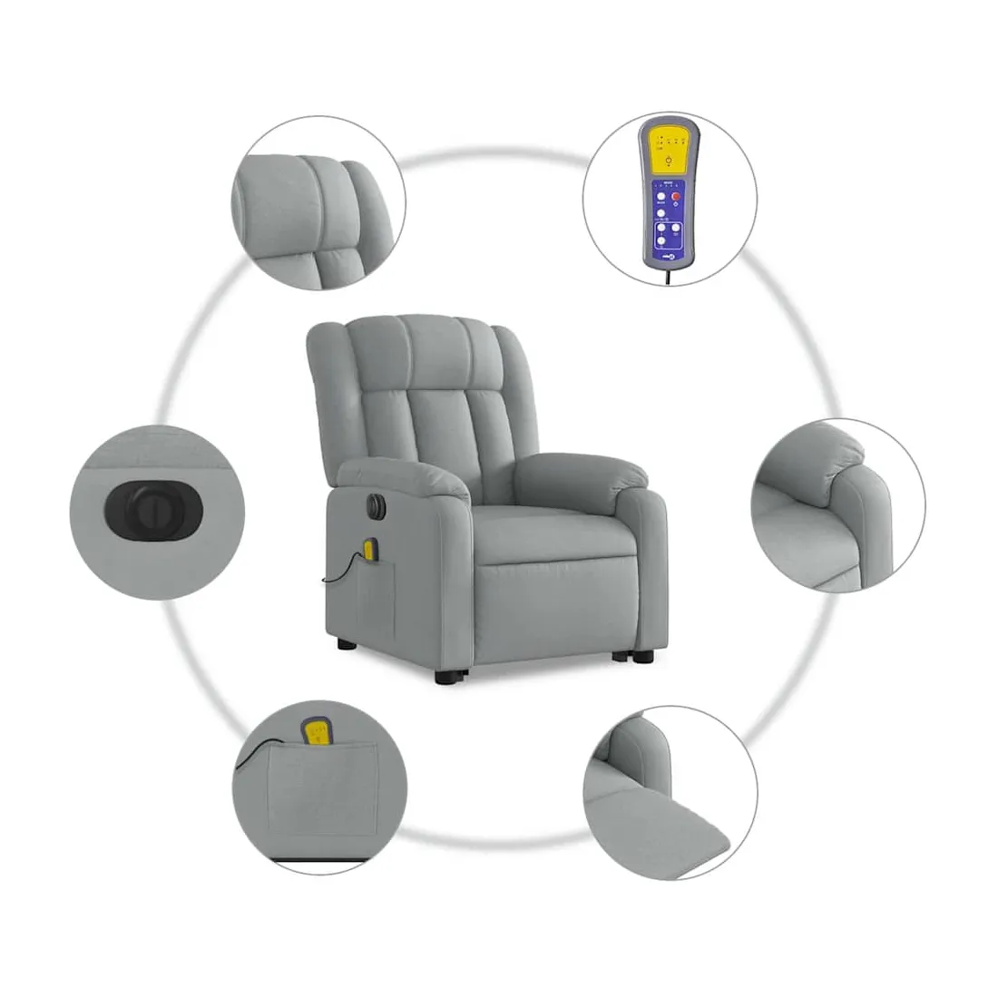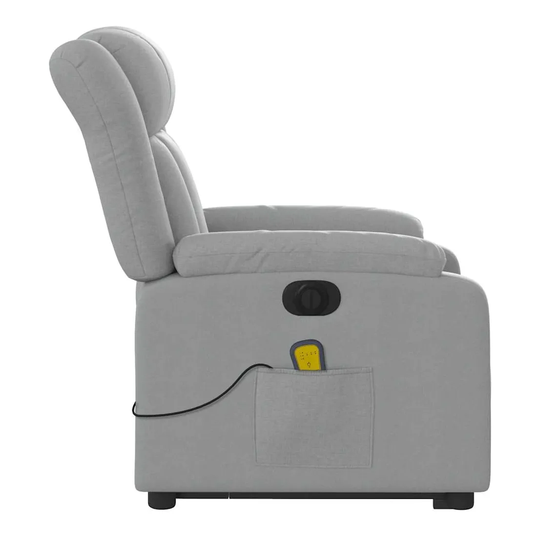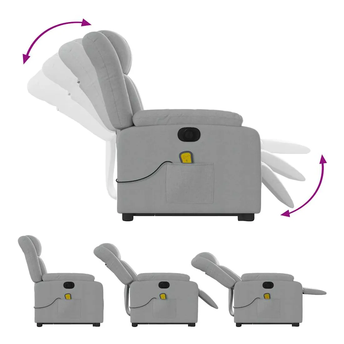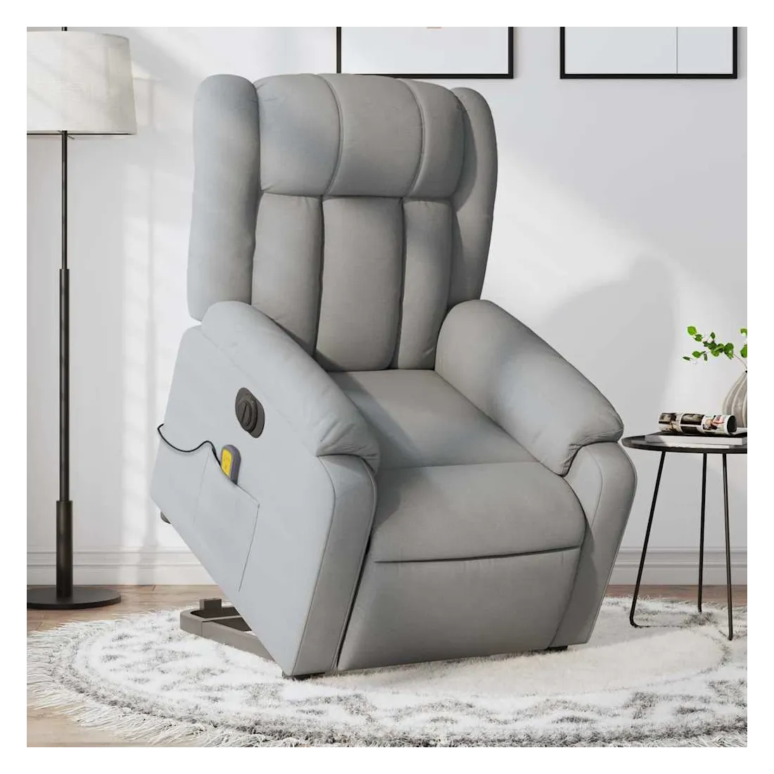 Asseyez-vous et détendez-vous dans ce fauteuil inclinable de massage électrique très confortable ! Fonction de levage électrique : ce fauteuil inclinable pour personnes âgées est équipé d'un moteur électrique pour la fonction de levage. Grâce à la fonction qui pousse toute la chaise vers le haut, vous pouvez facilement vous tenir debout sans stresser votre dos et vos genoux en appuyant simplement sur le bouton. Fonction d'inclinaison électrique : ce fauteuil inclinable est également équipé d'un moteur électrique qui permet de régler automatiquement le repose-pied et le dossier dans n'importe quelle position, selon votre confort, en appuyant simplement sur le bouton situé sur le côté du fauteuil. Cette fonction permet une inclinaison maximale de 135 degrés. En outre, le dossier peut revenir automatiquement à sa position d'origine par une simple pression sur le bouton. Fonction de vibration : les 6 points de massage vous permettent de faire l'expérience d'un massage mieux ciblé. De plus, la télécommande incluse vous permet de choisir différents programmes de massage. La fonction de massage est alimentée par le connecteur USB qui nécessite une source d'alimentation USB certifiée de 5 V (non fournie). Expérience d'assise confortable : le siège, le dossier et les larges accoudoirs bien rembourrés recouverts de tissu procurent une sensation confortable et chaleureuse, vous permettant de vous sentir enveloppé lorsque vous êtes assis. Le tissu présente un aspect simple et épuré et est respirant et durable. Poche latérale pratique : ce fauteuil est doté d'une poche latérale pour ranger votre télécommande ou garder vos objets essentiels à portée de main. Cadre solide et stable : le cadre en bois et en métal offre une structure solide et une grande stabilité. Ce fauteuil inclinable est confortable et durable.