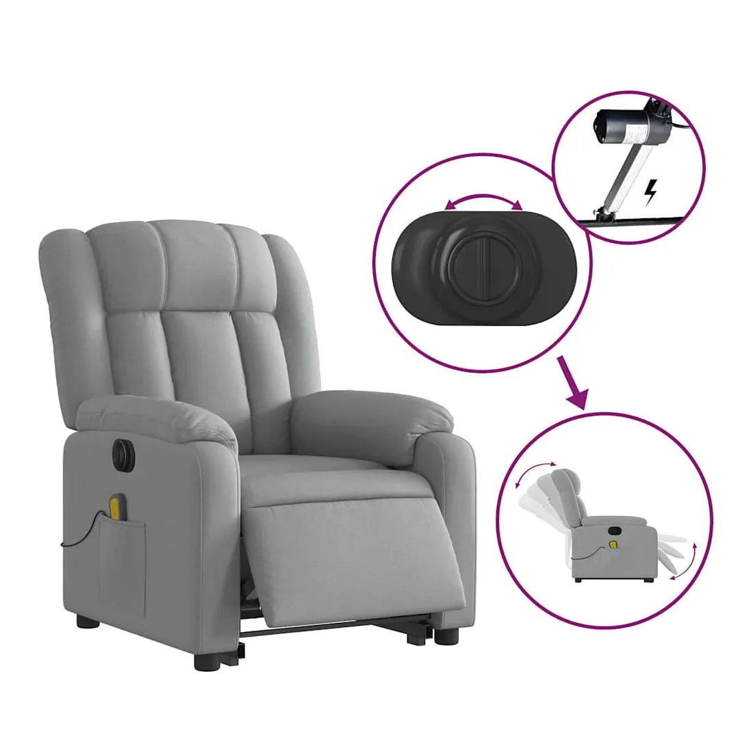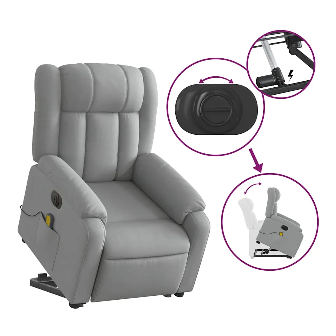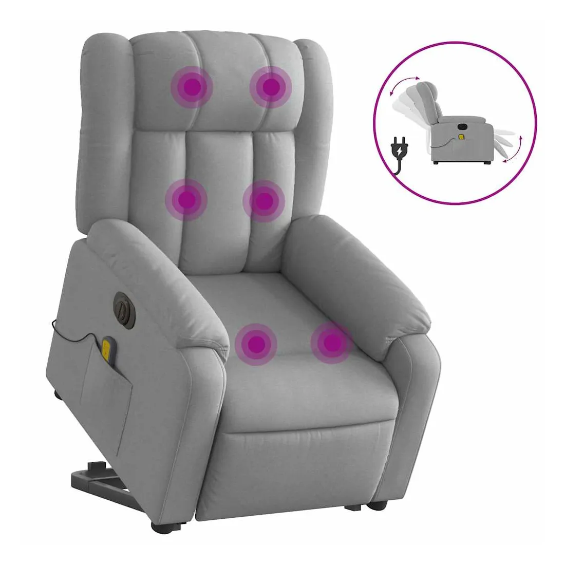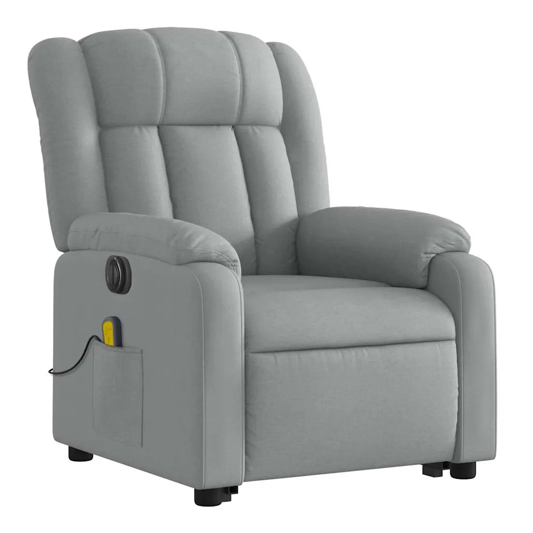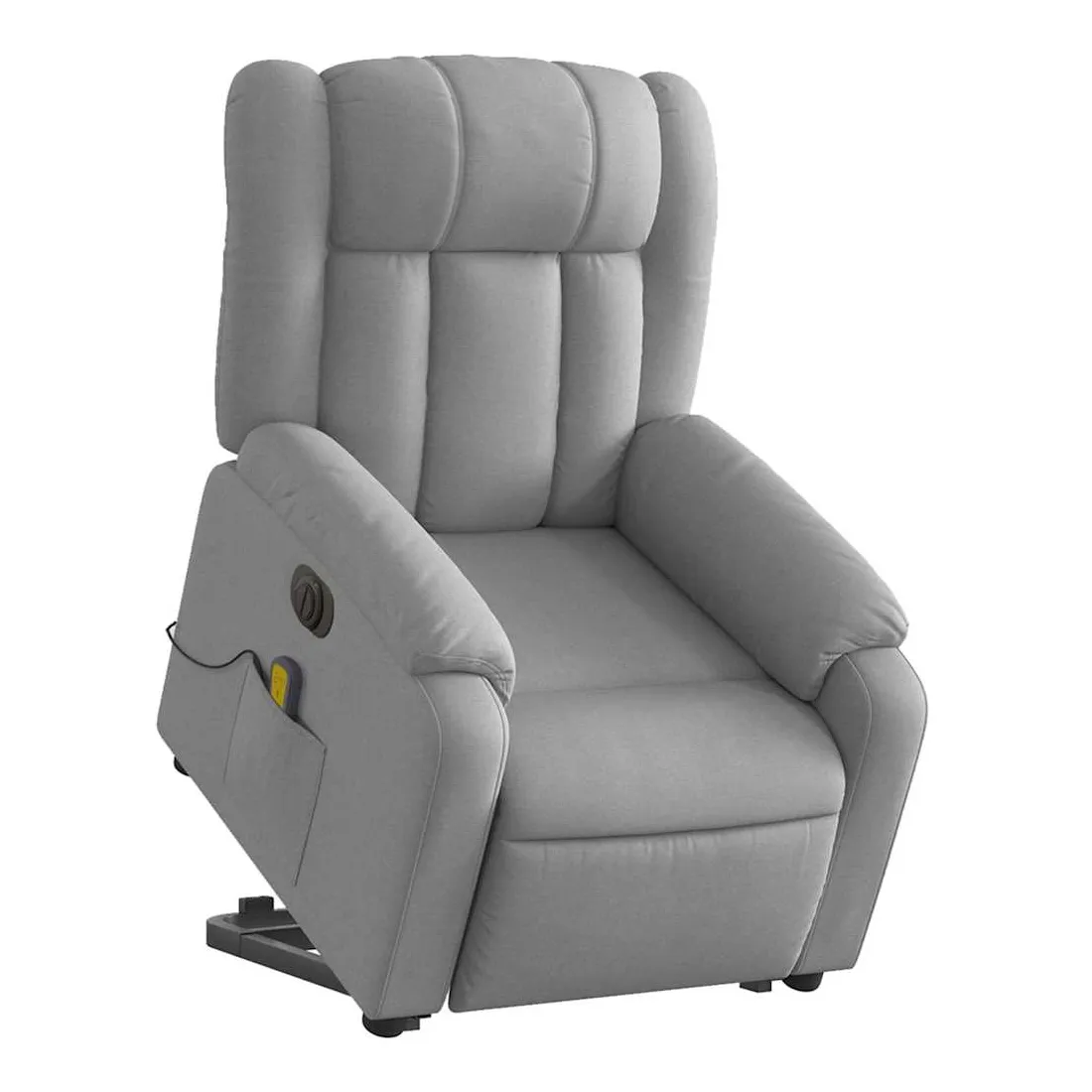 Asseyez-vous et détendez-vous dans ce fauteuil inclinable de massage électrique très confortable ! Fonction de levage électrique : ce fauteuil inclinable pour personnes âgées est équipé d'un moteur électrique pour la fonction de levage. Grâce à la fonction qui pousse toute la chaise vers le haut, vous pouvez facilement vous tenir debout sans stresser votre dos et vos genoux en appuyant simplement sur le bouton. Fonction d'inclinaison électrique : ce fauteuil inclinable est également équipé d'un moteur électrique qui permet de régler automatiquement le repose-pied et le dossier dans n'importe quelle position, selon votre confort, en appuyant simplement sur le bouton situé sur le côté du fauteuil. Cette fonction permet une inclinaison maximale de 135 degrés. En outre, le dossier peut revenir automatiquement à sa position d'origine par une simple pression sur le bouton. Fonction de vibration : les 6 points de massage vous permettent de faire l'expérience d'un massage mieux ciblé. De plus, la télécommande incluse vous permet de choisir différents programmes de massage. La fonction de massage est alimentée par le connecteur USB qui nécessite une source d'alimentation USB certifiée de 5 V (non fournie). Expérience d'assise confortable : le siège, le dossier et les larges accoudoirs bien rembourrés recouverts de tissu procurent une sensation confortable et chaleureuse, vous permettant de vous sentir enveloppé lorsque vous êtes assis. Le tissu présente un aspect simple et épuré et est respirant et durable. Poche latérale pratique : ce fauteuil est doté d'une poche latérale pour ranger votre télécommande ou garder vos objets essentiels à portée de main. Cadre solide et stable : le cadre en bois et en métal offre une structure solide et une grande stabilité. Ce fauteuil inclinable est confortable et durable.