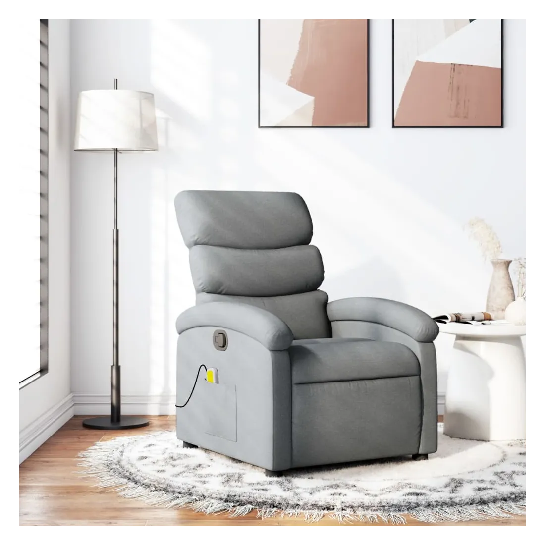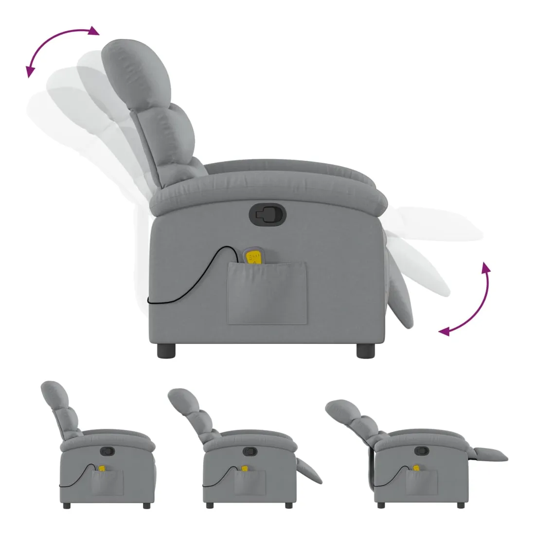 Asseyez-vous et détendez-vous dans ce fauteuil inclinable de massage très confortable ! Fonction d'inclinaison manuelle : ce fauteuil inclinable est doté d'une poignée du côté droit. Vous pouvez régler manuellement le repose-pieds et le dossier dans n'importe quelle position selon votre confort en tirant simplement sur la poignée. Cette fonction permet une inclinaison maximale de 135 degrés. De plus, le dossier peut revenir rapidement à sa position d'origine en tirant simplement sur la poignée.Fonction de vibration : les 6 points de massage vous permettent de faire l'expérience d'un massage mieux ciblé. De plus, la télécommande incluse vous permet de choisir différents programmes de massage. La fonction de massage est alimentée par le connecteur USB, mais la source d'alimentation USB 5V certifiée n'est pas incluse.Expérience d'assise confortable : le siège, le dossier et les larges accoudoirs bien rembourrés recouverts de tissu procurent une sensation confortable et chaleureuse, vous permettant de vous sentir enveloppé lorsque vous êtes assis. Le tissu présente un aspect simple et épuré et est respirant et durable.Poche latérale pratique : ce fauteuil est doté d'une poche latérale pour ranger votre télécommande ou garder vos objets essentiels à portée de main.Cadre solide et stable : le cadre en bois et en métal offre une structure solide et une grande stabilité. Ce fauteuil inclinable est confortable et durable.