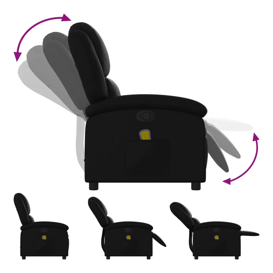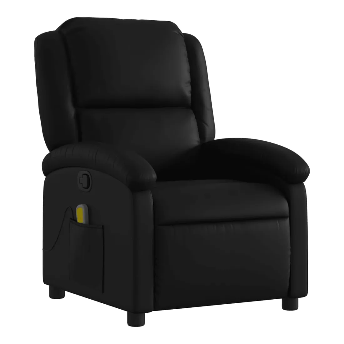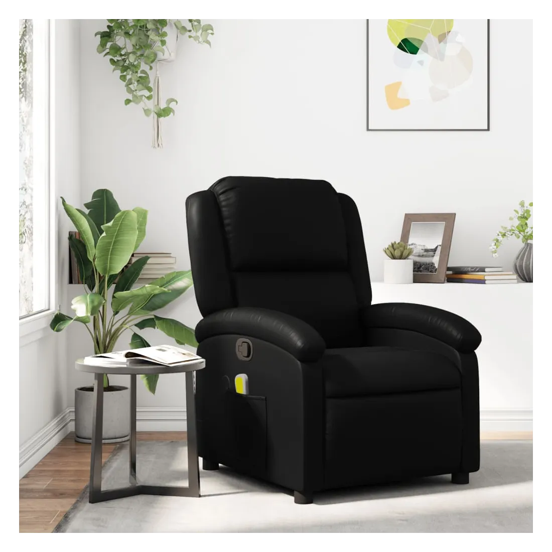 Asseyez-vous et détendez-vous dans ce fauteuil inclinable de massage très confortable ! Fonction d'inclinaison manuelle : ce fauteuil inclinable est doté d'un bouton du côté droit. Vous pouvez régler manuellement le repose-pieds et le dossier dans n'importe quelle position selon votre confort en tirant simplement sur la poignée. Cette fonction permet une inclinaison maximale de 135 degrés. De plus, le dossier peut revenir rapidement à sa position d'origine en tirant simplement sur la poignée.Fonction de vibration : les 6 points de massage vous permettent de faire l'expérience d'un massage mieux ciblé. De plus, la télécommande incluse vous permet de choisir différents programmes de massage. La fonction de massage est alimentée par le connecteur USB, mais la source d'alimentation USB 5V certifiée n'est pas incluse.Expérience de siège confortable : le siège, le dossier et les larges accoudoirs rembourrés épais recouverts de similicuir procurent une sensation confortable, vous faisant vous sentir enlacé lorsque vous êtes assis. Le similicuir est un matériau très résistant. Il est résistant aux taches, ce qui le rend facile à nettoyer avec un chiffon humide. La surface lisse donne également un aspect luxueux et la beauté du cuir véritable.Poche latérale pratique : ce fauteuil est doté d'une poche latérale pour ranger votre télécommande ou garder vos objets essentiels à portée de main.Cadre solide et stable : le cadre en bois et en métal offre une structure solide et une grande stabilité. Ce fauteuil inclinable est confortable et durable.