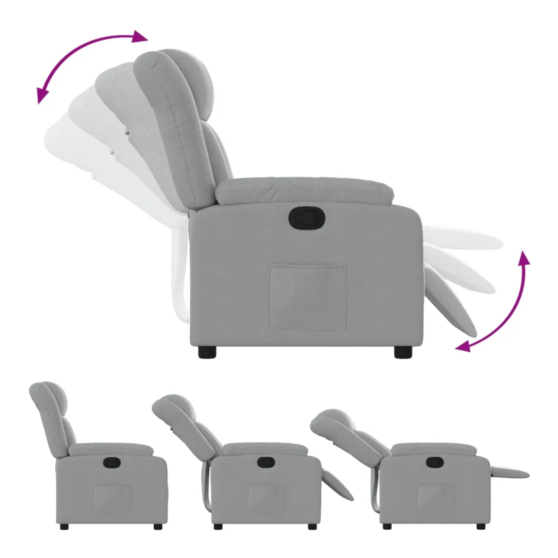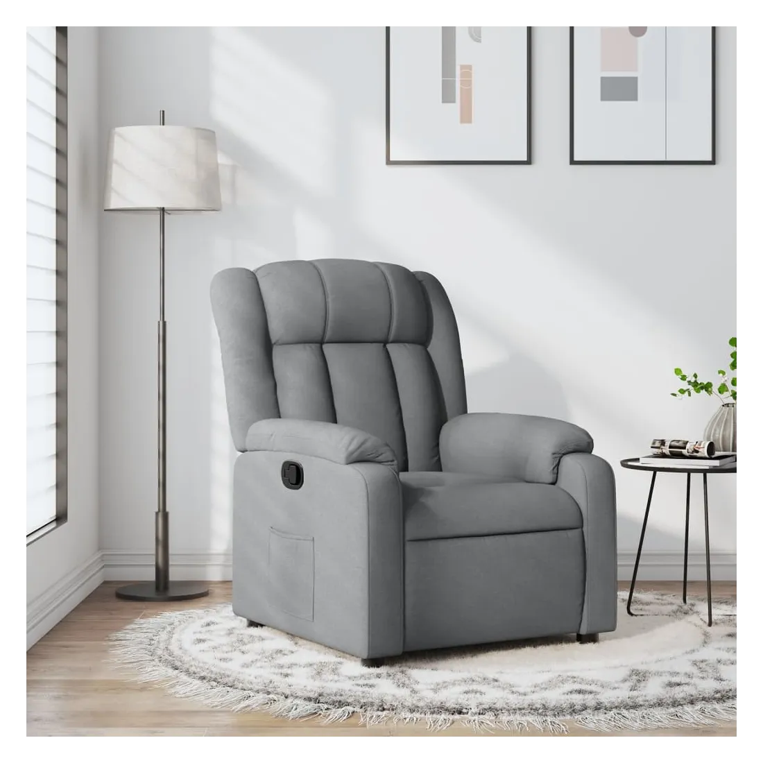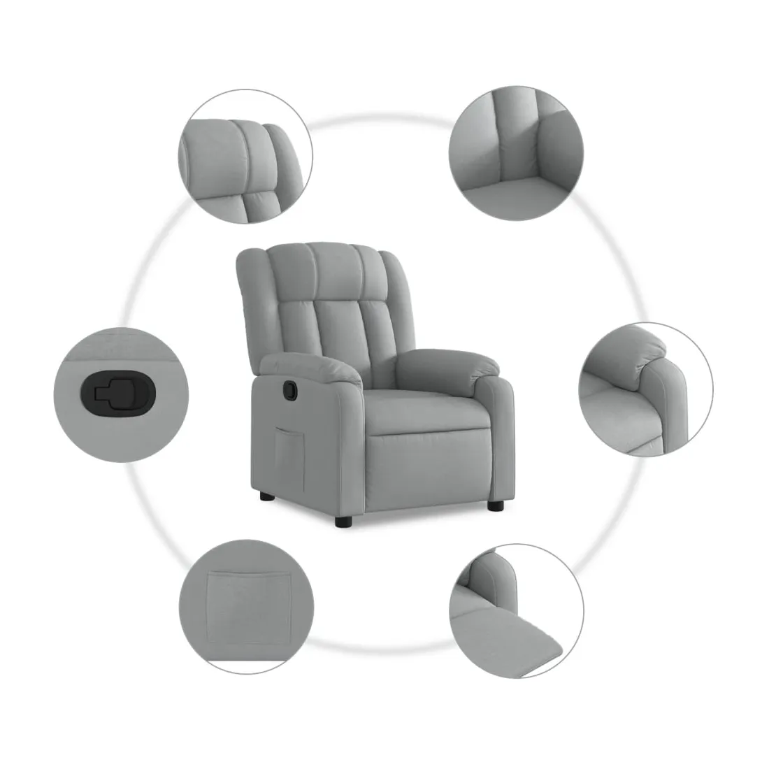 Asseyez-vous et laissez-vous emporter par ce fauteuil inclinable ultra-confortable ! Fonction d'inclinaison manuelle : Ce fauteuil inclinable est doté d'une poignée sur le côté droit. Vous pouvez régler manuellement le repose-pieds et le dossier à votre convenance d'une simple traction sur la poignée. Cette fonction permet une inclinaison maximale de 135 degrés. De plus, le dossier peut revenir rapidement à sa position initiale d'une simple traction sur la poignée.Assise confortable : L'assise, le dossier et les larges accoudoirs rembourrés et recouverts de tissu offrent une sensation de confort et de chaleur, vous permettant de vous sentir bien installé. Le tissu, au look simple et épuré, est respirant et durable.Poche latérale pratique : Ce fauteuil est doté d'une poche latérale pour garder vos objets essentiels à portée de main.Cadre solide et stable : Le cadre en bois et en métal offre une structure solide et stable. Ce fauteuil inclinable est confortable et durable.