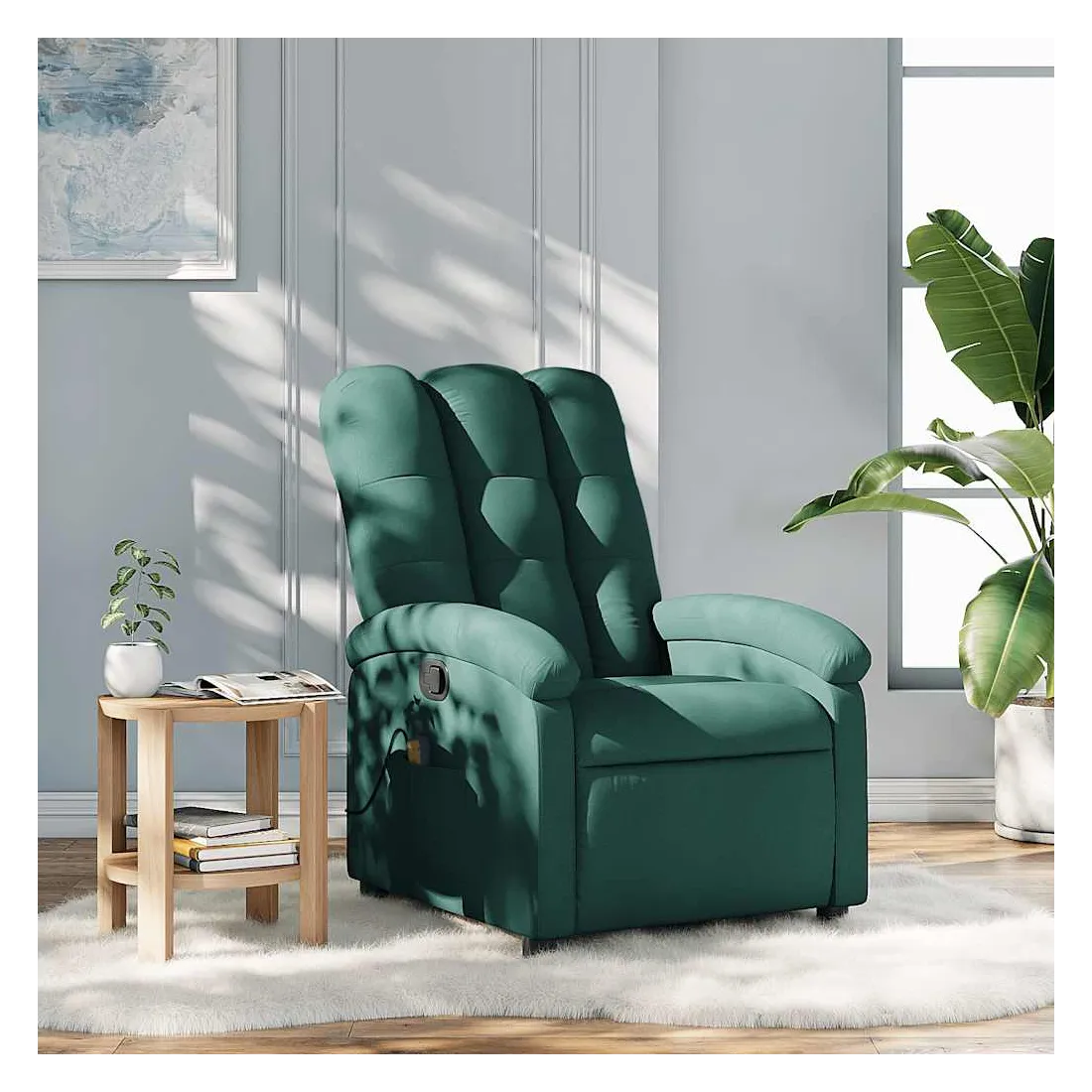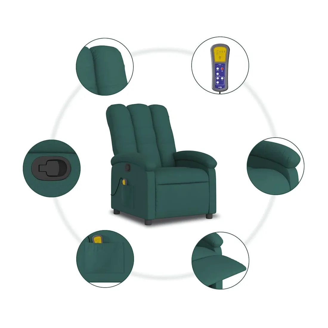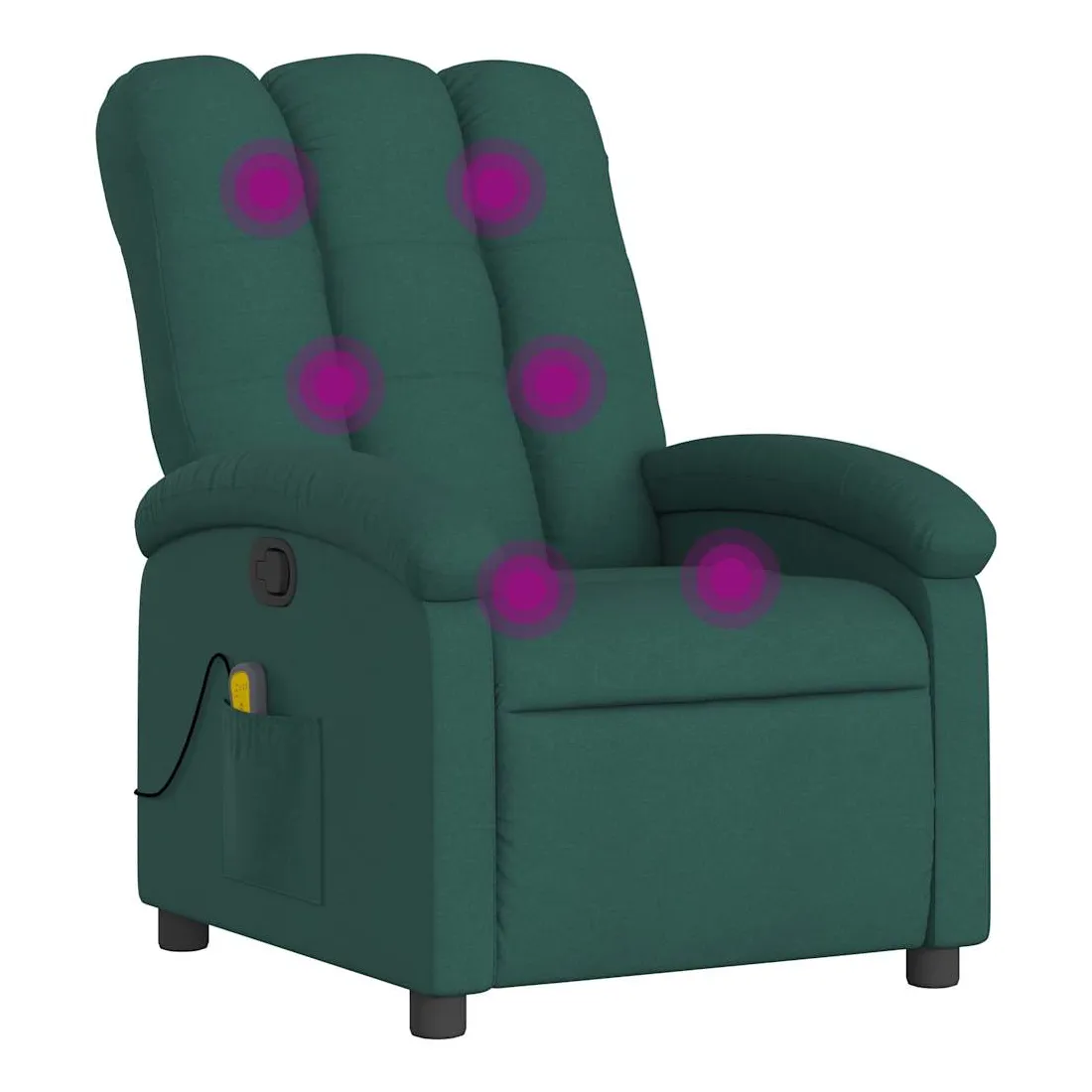 Asseyez-vous et détendez-vous dans ce fauteuil inclinable de massage très confortable ! Fonction d'inclinaison manuelle : ce fauteuil inclinable est doté d'une poignée du côté droit. Vous pouvez régler manuellement le repose-pieds et le dossier dans n'importe quelle position selon votre confort en tirant simplement sur la poignée. Cette fonction permet une inclinaison maximale de 135 degrés. De plus, le dossier peut revenir rapidement à sa position d'origine en tirant simplement sur la poignée.Fonction de vibration : les 6 points de massage vous permettent de faire l'expérience d'un massage mieux ciblé. De plus, la télécommande incluse vous permet de choisir différents programmes de massage. La fonction de massage est alimentée par le connecteur USB, mais la source d'alimentation USB 5V certifiée n'est pas incluse.Expérience d'assise confortable : le siège, le dossier et les larges accoudoirs bien rembourrés recouverts de tissu procurent une sensation confortable et chaleureuse, vous permettant de vous sentir enveloppé lorsque vous êtes assis. Le tissu présente un aspect simple et épuré et est respirant et durable.Poche latérale pratique : ce fauteuil est doté d'une poche latérale pour ranger votre télécommande ou garder vos objets essentiels à portée de main.Cadre solide et stable : le cadre en bois et en métal offre une structure solide et une grande stabilité. Ce fauteuil inclinable est confortable et durable.