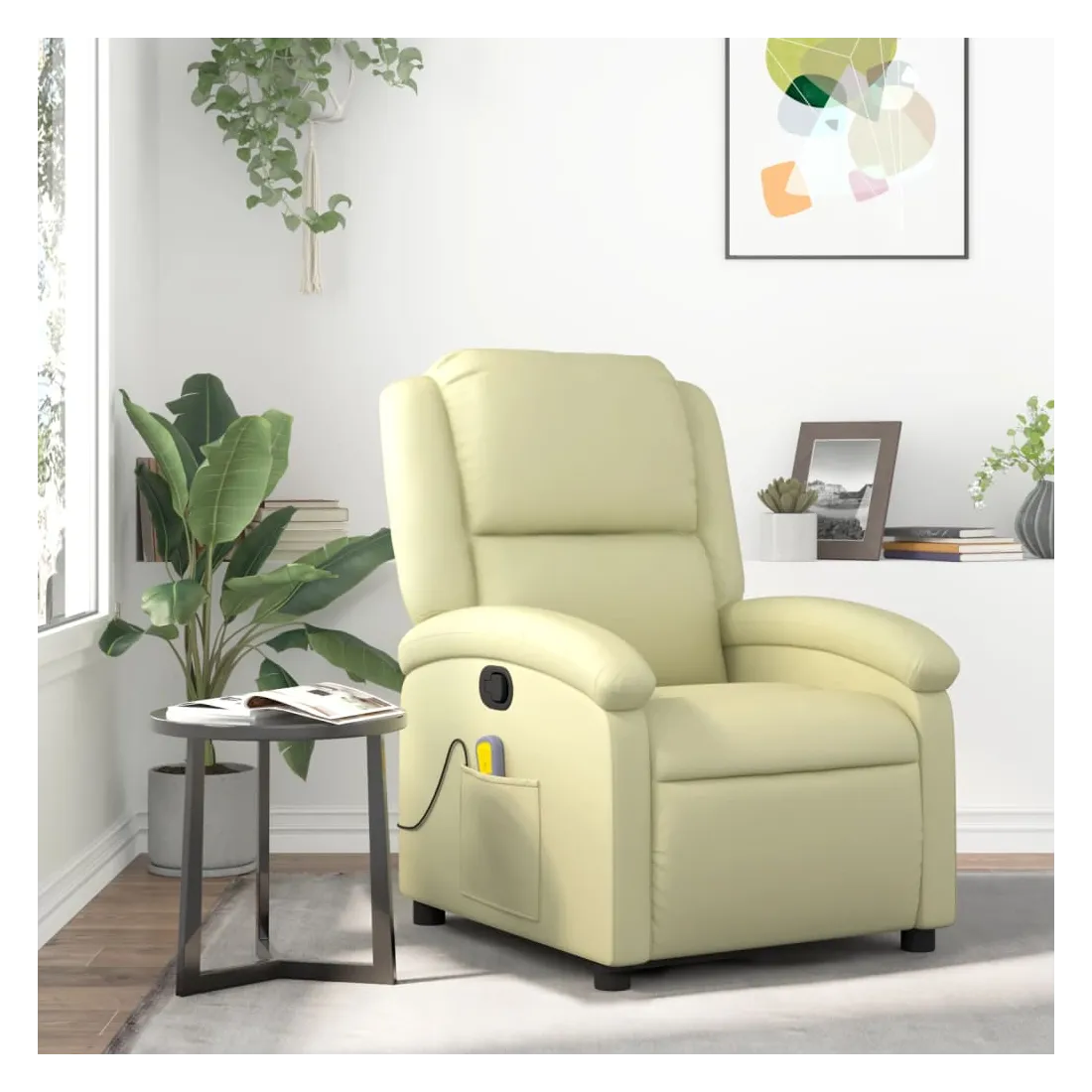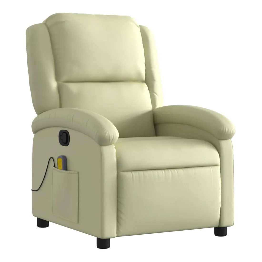 Asseyez-vous et détendez-vous dans ce fauteuil inclinable de massage très confortable ! Fonction d'inclinaison manuelle : ce fauteuil inclinable est doté d'un bouton du côté droit. Vous pouvez régler manuellement le repose-pieds et le dossier dans n'importe quelle position selon votre confort en tirant simplement sur la poignée. Cette fonction permet une inclinaison maximale de 135 degrés. De plus, le dossier peut revenir rapidement à sa position d'origine en tirant simplement sur la poignée.Fonction de vibration : les 6 points de massage vous permettent de faire l'expérience d'un massage mieux ciblé. De plus, la télécommande incluse vous permet de choisir différents programmes de massage. La fonction de massage est alimentée par le connecteur USB, mais la source d'alimentation USB 5V certifiée n'est pas incluse.Expérience de siège confortable : le siège, le dossier et les larges accoudoirs rembourrés épais recouverts de cuir véritable procurent une sensation confortable, vous faisant vous sentir enlacé lorsque vous êtes assis. Le cuir véritable est un matériau naturellement intemporel. Il peut durer toute une vie avec des soins et un entretien appropriés. La surface lisse lui donne également un aspect élégant tout en garantissant un confort optimal.Poche latérale pratique : ce fauteuil est doté d'une poche latérale pour ranger votre télécommande ou garder vos objets essentiels à portée de main.Cadre solide et stable : le cadre en bois et en métal offre une structure solide et une grande stabilité. Ce fauteuil inclinable est confortable et durable.