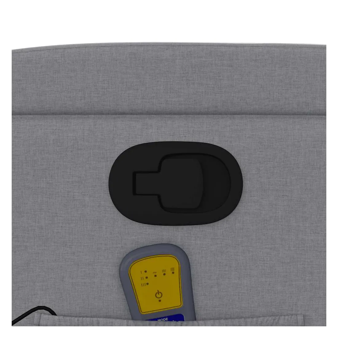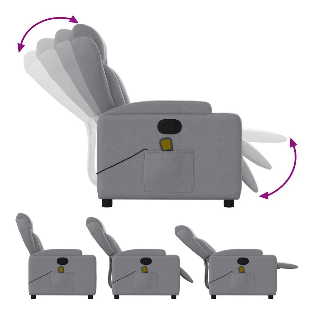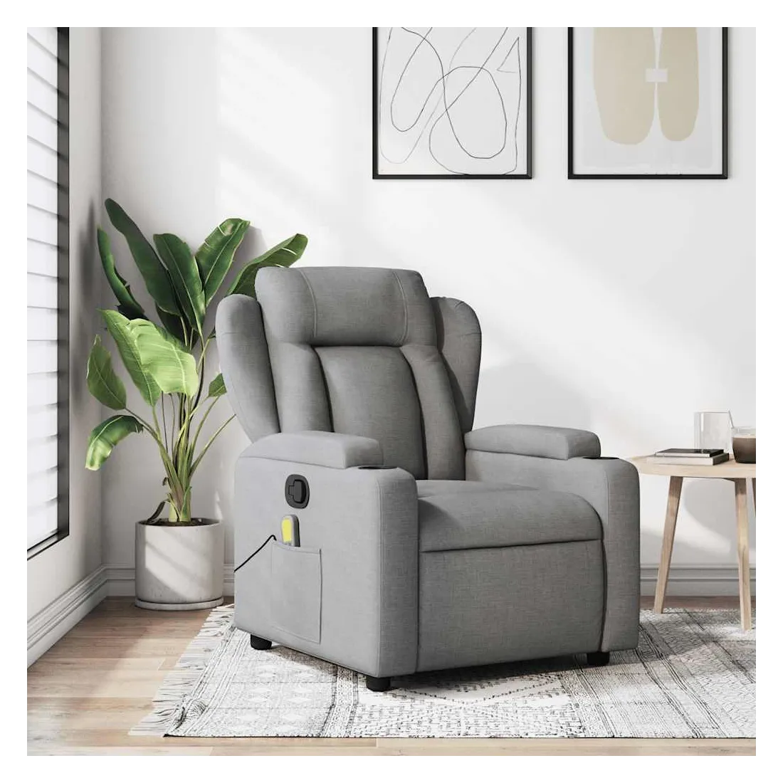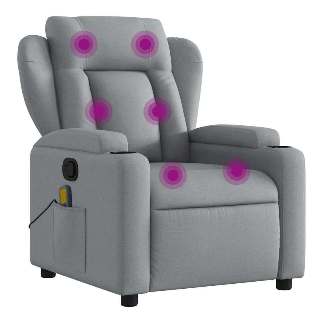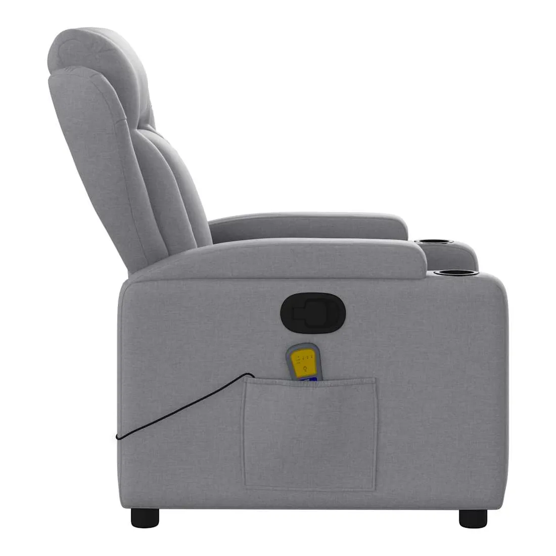 Asseyez-vous et détendez-vous dans ce fauteuil inclinable de massage très confortable ! Fonction d'inclinaison manuelle : ce fauteuil inclinable est doté d'une poignée du côté droit. Vous pouvez régler manuellement le repose-pieds et le dossier dans n'importe quelle position selon votre confort en tirant simplement sur la poignée. Cette fonction permet une inclinaison maximale de 135 degrés. De plus, le dossier peut revenir rapidement à sa position d'origine en tirant simplement sur la poignée.Fonction de vibration : les 6 points de massage vous permettent de faire l'expérience d'un massage mieux ciblé. De plus, la télécommande incluse vous permet de choisir différents programmes de massage. La fonction de massage est alimentée par le connecteur USB, mais la source d'alimentation USB 5V certifiée n'est pas incluse.Expérience d'assise confortable : le siège, le dossier et les larges accoudoirs bien rembourrés recouverts de tissu procurent une sensation confortable et chaleureuse, vous permettant de vous sentir enveloppé lorsque vous êtes assis. Le tissu présente un aspect simple et épuré et est respirant et durable.Porte-gobelets et poche latérale pratiques : ce fauteuil dispose de deux porte-gobelets pratiques pour vos boissons et d'une poche latérale pour votre télécommande ou pour garder vos objets essentiels à portée de main.Cadre solide et stable : le cadre en bois et en métal offre une structure solide et une grande stabilité. Ce fauteuil inclinable est confortable et durable.