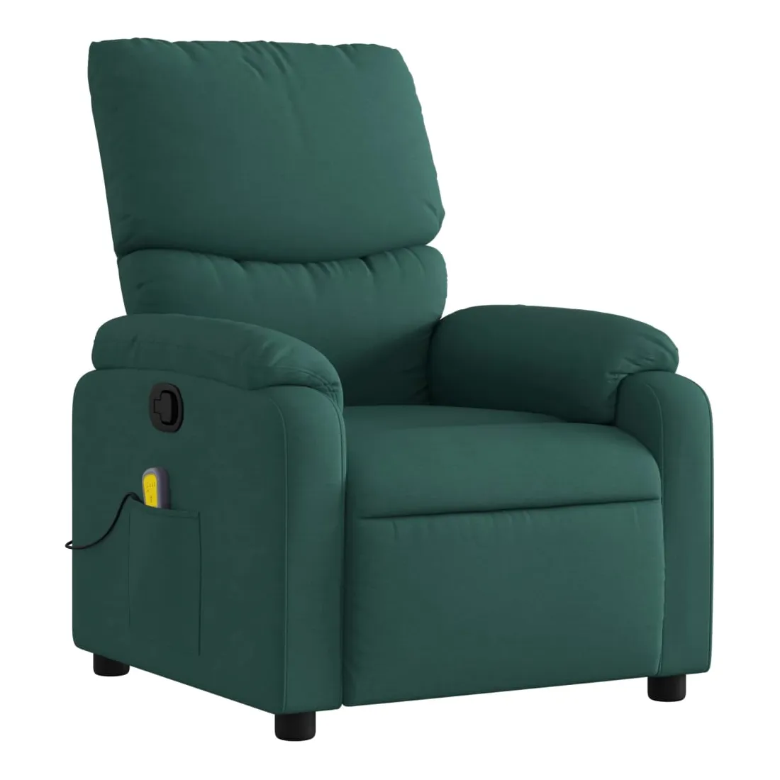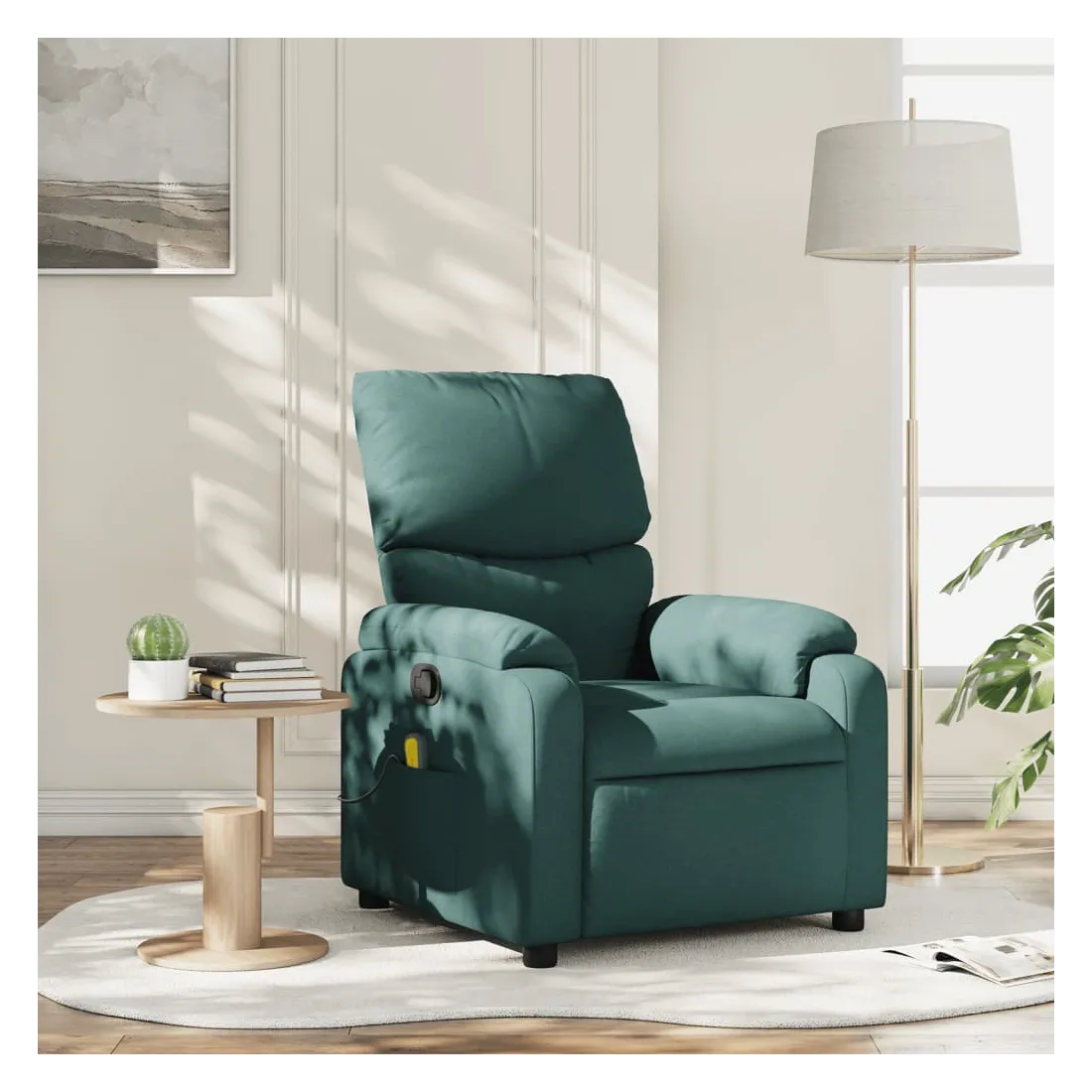 Asseyez-vous et détendez-vous dans ce fauteuil inclinable de massage très confortable ! Fonction d'inclinaison manuelle : ce fauteuil inclinable est doté d'une poignée du côté droit. Vous pouvez régler manuellement le repose-pieds et le dossier dans n'importe quelle position selon votre confort en tirant simplement sur la poignée. Cette fonction permet une inclinaison maximale de 135 degrés. De plus, le dossier peut revenir rapidement à sa position d'origine en tirant simplement sur la poignée.Fonction de vibration : les 6 points de massage vous permettent de faire l'expérience d'un massage mieux ciblé. De plus, la télécommande incluse vous permet de choisir différents programmes de massage. La fonction de massage est alimentée par le connecteur USB, mais la source d'alimentation USB 5V certifiée n'est pas incluse.Expérience d'assise confortable : le siège, le dossier et les larges accoudoirs bien rembourrés recouverts de tissu procurent une sensation confortable et chaleureuse, vous permettant de vous sentir enveloppé lorsque vous êtes assis. Le tissu présente un aspect simple et épuré et est respirant et durable.Poche latérale pratique : ce fauteuil est doté d'une poche latérale pour ranger votre télécommande ou garder vos objets essentiels à portée de main.Cadre solide et stable : le cadre en bois et en métal offre une structure solide et une grande stabilité. Ce fauteuil inclinable est confortable et durable.