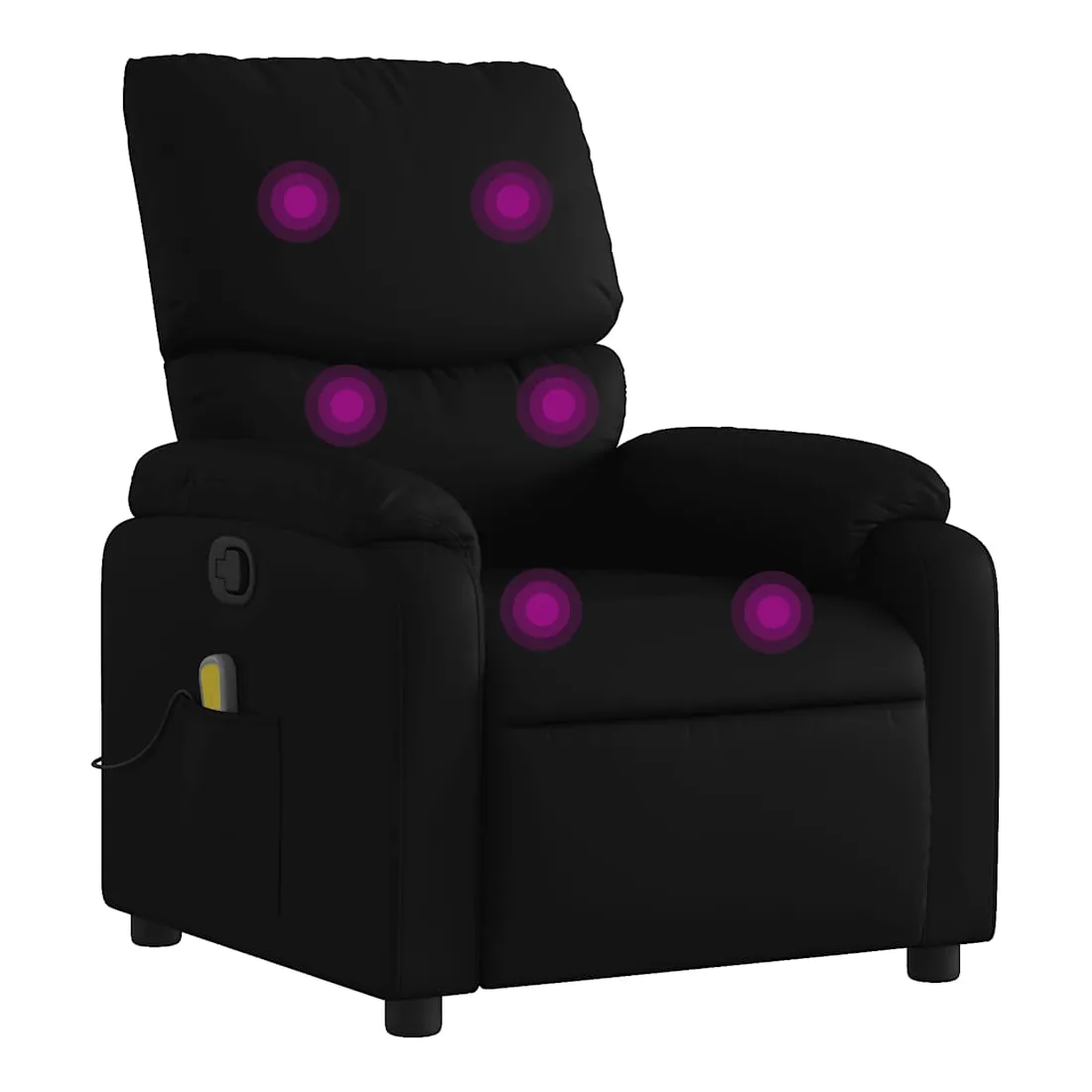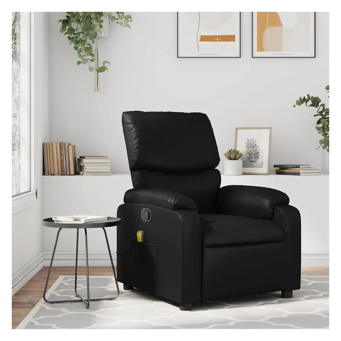 Asseyez-vous et détendez-vous dans ce fauteuil inclinable de massage très confortable ! Fonction d'inclinaison manuelle : ce fauteuil inclinable est doté d'une poignée du côté droit. Vous pouvez régler manuellement le repose-pieds et le dossier dans n'importe quelle position selon votre confort en tirant simplement sur la poignée. Cette fonction permet une inclinaison maximale de 135 degrés. De plus, le dossier peut revenir rapidement à sa position d'origine en tirant simplement sur la poignée.Fonction de vibration : les 6 points de massage vous permettent de faire l'expérience d'un massage mieux ciblé. De plus, la télécommande incluse vous permet de choisir différents programmes de massage. La fonction de massage est alimentée par le connecteur USB, mais la source d'alimentation USB 5V certifiée n'est pas incluse.Expérience de siège confortable : le siège, le dossier et les larges accoudoirs rembourrés épais recouverts de similicuir procurent une sensation confortable, vous faisant vous sentir enlacé lorsque vous êtes assis. Le similicuir est un matériau très résistant. Il est résistant aux taches, ce qui le rend facile à nettoyer avec un chiffon humide. La surface lisse donne également un aspect luxueux et la beauté du cuir véritable.Poche latérale pratique : ce fauteuil est doté d'une poche latérale pour ranger votre télécommande ou garder vos objets essentiels à portée de main.Cadre solide et stable : le cadre en bois et en métal offre une structure solide et une grande stabilité. Ce fauteuil inclinable est confortable et durable.