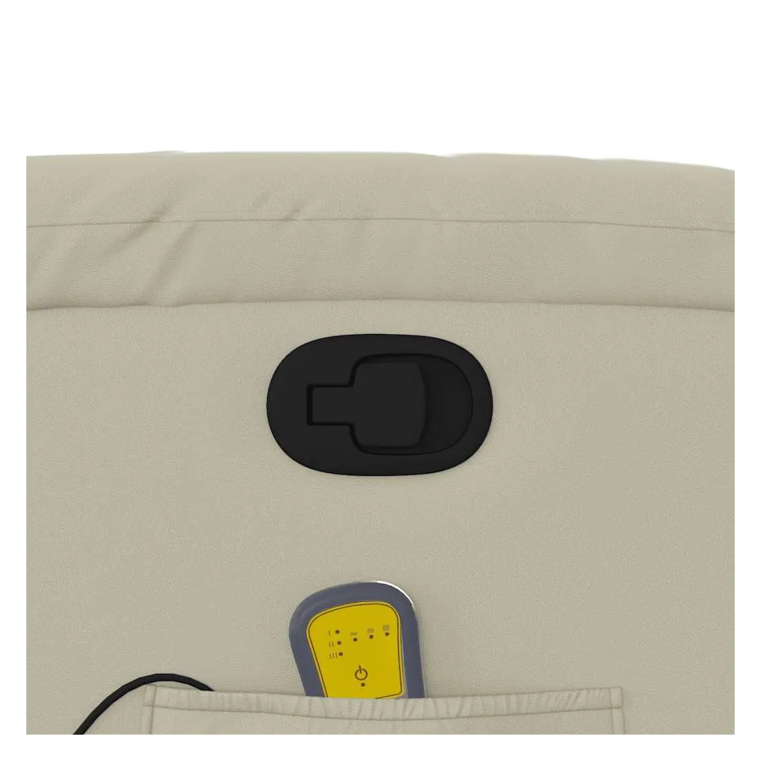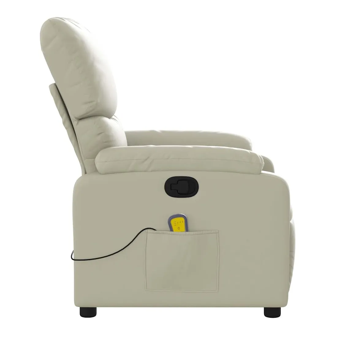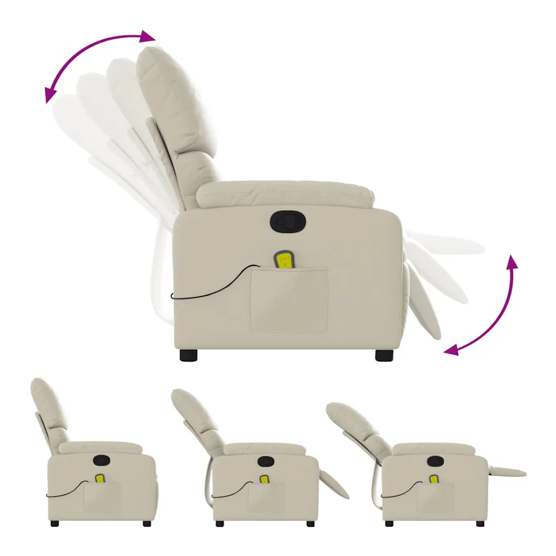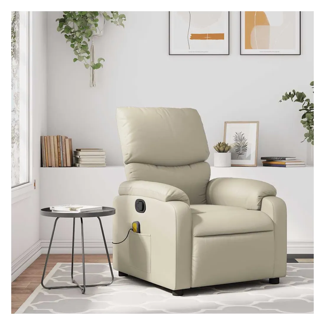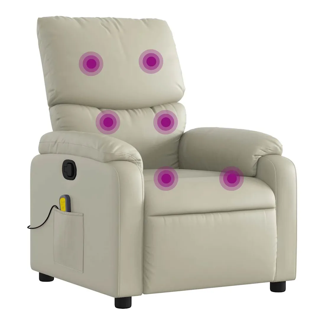 Asseyez-vous et détendez-vous dans ce fauteuil inclinable de massage très confortable ! Fonction d'inclinaison manuelle : ce fauteuil inclinable est doté d'une poignée du côté droit. Vous pouvez régler manuellement le repose-pieds et le dossier dans n'importe quelle position selon votre confort en tirant simplement sur la poignée. Cette fonction permet une inclinaison maximale de 135 degrés. De plus, le dossier peut revenir rapidement à sa position d'origine en tirant simplement sur la poignée.Fonction de vibration : les 6 points de massage vous permettent de faire l'expérience d'un massage mieux ciblé. De plus, la télécommande incluse vous permet de choisir différents programmes de massage. La fonction de massage est alimentée par le connecteur USB, mais la source d'alimentation USB 5V certifiée n'est pas incluse.Expérience de siège confortable : le siège, le dossier et les larges accoudoirs rembourrés épais recouverts de similicuir procurent une sensation confortable, vous faisant vous sentir enlacé lorsque vous êtes assis. Le similicuir est un matériau très résistant. Il est résistant aux taches, ce qui le rend facile à nettoyer avec un chiffon humide. La surface lisse donne également un aspect luxueux et la beauté du cuir véritable.Poche latérale pratique : ce fauteuil est doté d'une poche latérale pour ranger votre télécommande ou garder vos objets essentiels à portée de main.Cadre solide et stable : le cadre en bois et en métal offre une structure solide et une grande stabilité. Ce fauteuil inclinable est confortable et durable.
