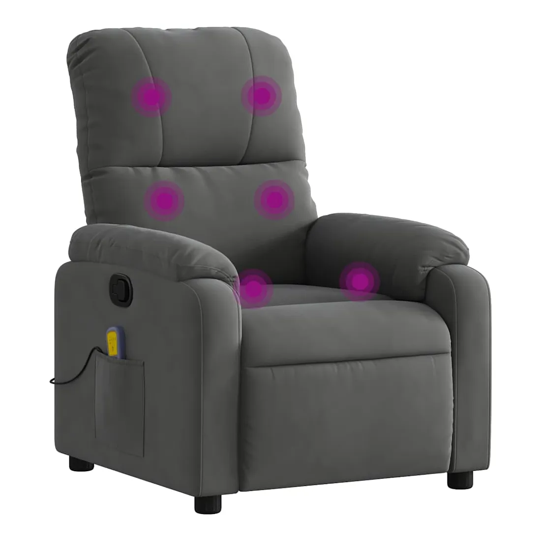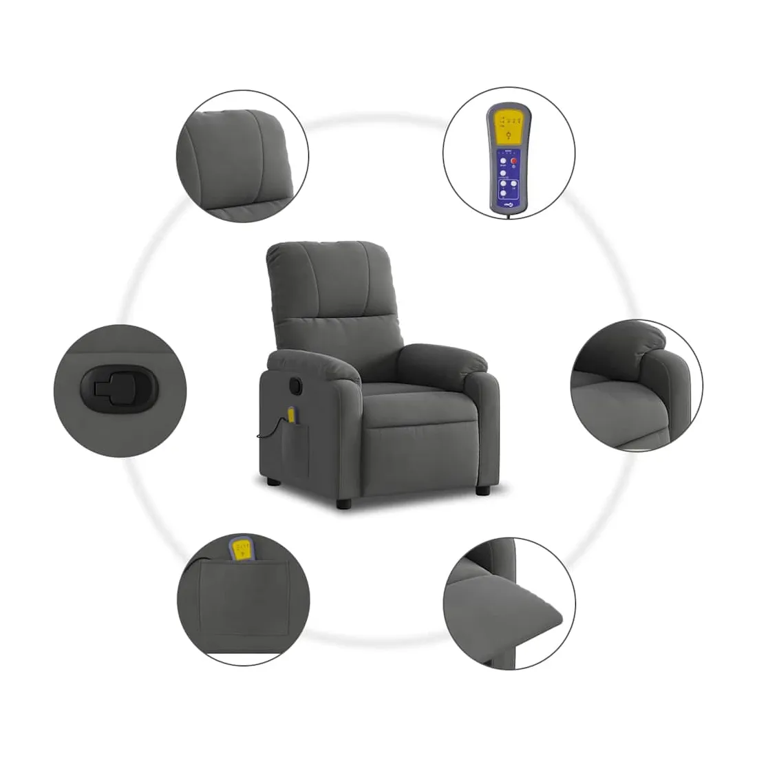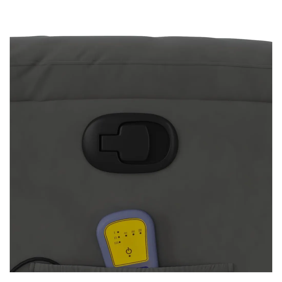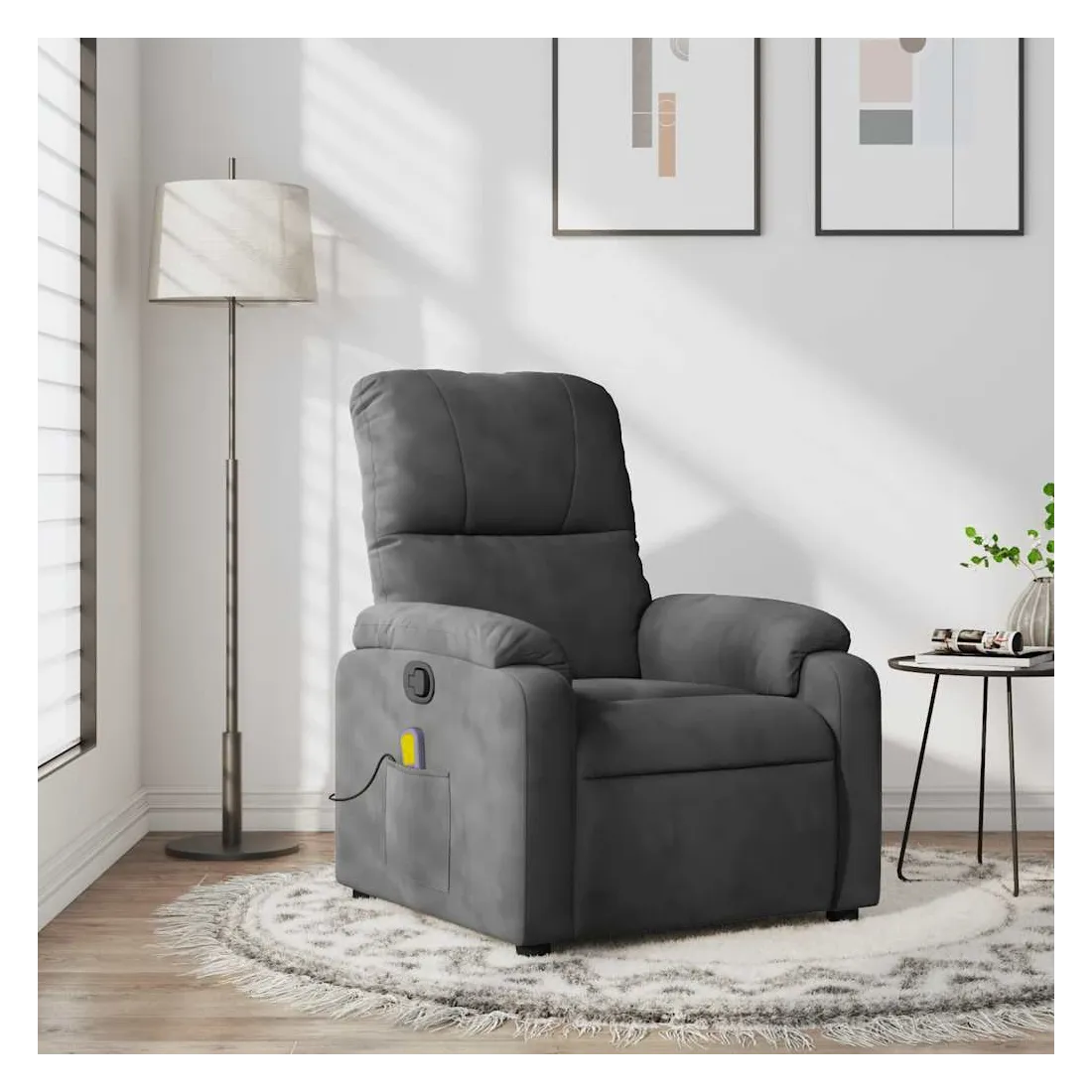 Asseyez-vous et détendez-vous dans ce fauteuil inclinable de massage très confortable ! Fonction d'inclinaison manuelle : ce fauteuil inclinable est doté d'une poignée du côté droit. Vous pouvez régler manuellement le repose-pieds et le dossier dans n'importe quelle position selon votre confort en tirant simplement sur la poignée. Cette fonction permet une inclinaison maximale de 135 degrés. De plus, le dossier peut revenir rapidement à sa position d'origine en tirant simplement sur la poignée.Fonction de vibration : les 6 points de massage vous permettent de faire l'expérience d'un massage mieux ciblé. De plus, la télécommande incluse vous permet de choisir différents programmes de massage. La fonction de massage est alimentée par le connecteur USB, mais la source d'alimentation USB 5V certifiée n'est pas incluse.Expérience d'assise confortable : l'assise, le dossier et les larges accoudoirs recouverts de microfibres et dotés d'un rembourrage épais procurent une sensation de confort et de chaleur, vous permettant de vous sentir enveloppé lorsque vous êtes assis. La microfibre est un tissu synthétique composé de fibres ultrafines, particulièrement imperméables aux taches. La microfibre est un excellent choix pour le revêtement des meubles en raison de sa durabilité et de sa facilité d'entretien.Poche latérale pratique : ce fauteuil est doté d'une poche latérale pour ranger votre télécommande ou garder vos objets essentiels à portée de main.Cadre solide et stable : le cadre en bois et en métal offre une structure solide et une grande stabilité. Ce fauteuil inclinable est confortable et durable.