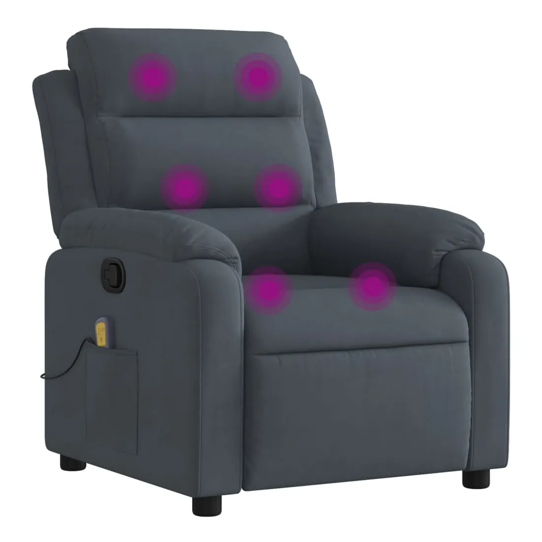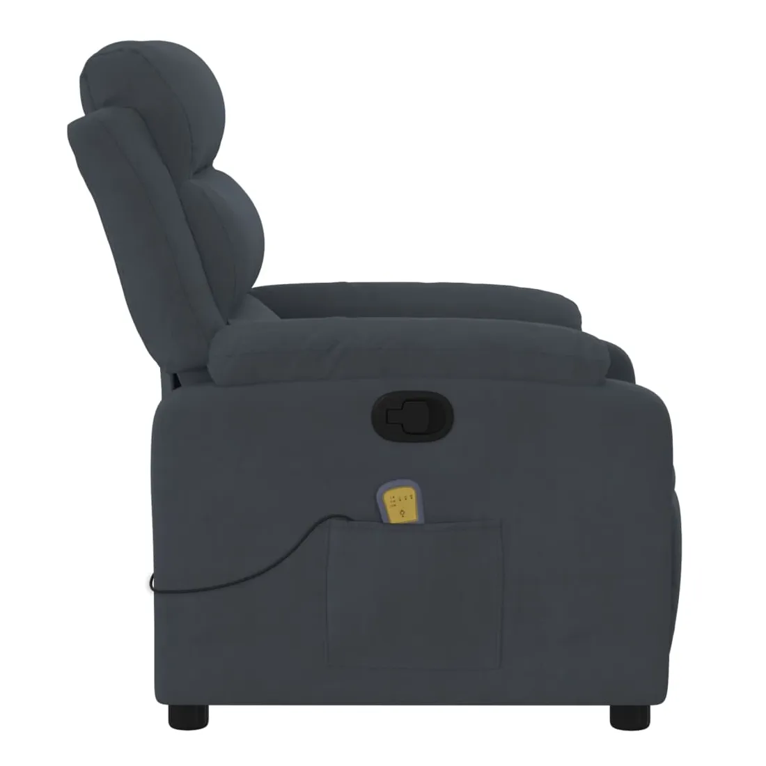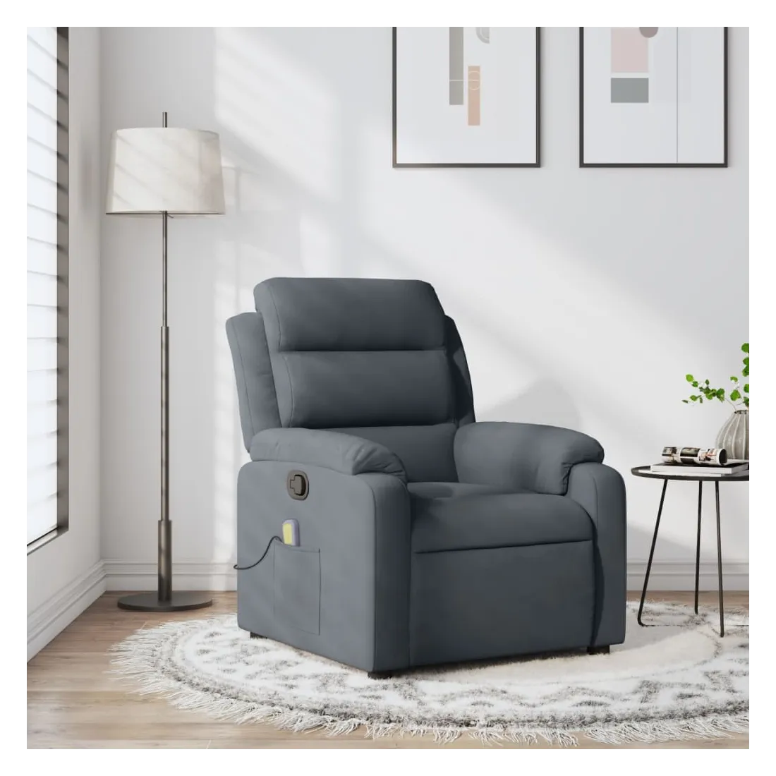 Asseyez-vous et détendez-vous dans ce fauteuil inclinable de massage très confortable ! Fonction d'inclinaison manuelle : ce fauteuil inclinable est doté d'une poignée du côté droit. Vous pouvez régler manuellement le repose-pieds et le dossier dans n'importe quelle position selon votre confort en tirant simplement sur la poignée. Cette fonction permet une inclinaison maximale de 135 degrés. De plus, le dossier peut revenir rapidement à sa position d'origine en tirant simplement sur la poignée.Fonction de vibration : les 6 points de massage vous permettent de faire l'expérience d'un massage mieux ciblé. De plus, la télécommande incluse vous permet de choisir différents programmes de massage. La fonction de massage est alimentée par le connecteur USB, mais la source d'alimentation USB 5V certifiée n'est pas incluse.Expérience d'assise confortable : le siège, le dossier et les larges accoudoirs rembourrés épais recouverts de velours procurent une sensation confortable et chaleureuse, vous faisant vous sentir enlacé lorsque vous êtes assis. Le velours est un tissu doux et confortable qui est agréable sur la peau.Poche latérale pratique : ce fauteuil est doté d'une poche latérale pour ranger votre télécommande ou garder vos objets essentiels à portée de main.Cadre solide et stable : le cadre en bois et en métal offre une structure solide et une grande stabilité. Ce fauteuil inclinable est confortable et durable.