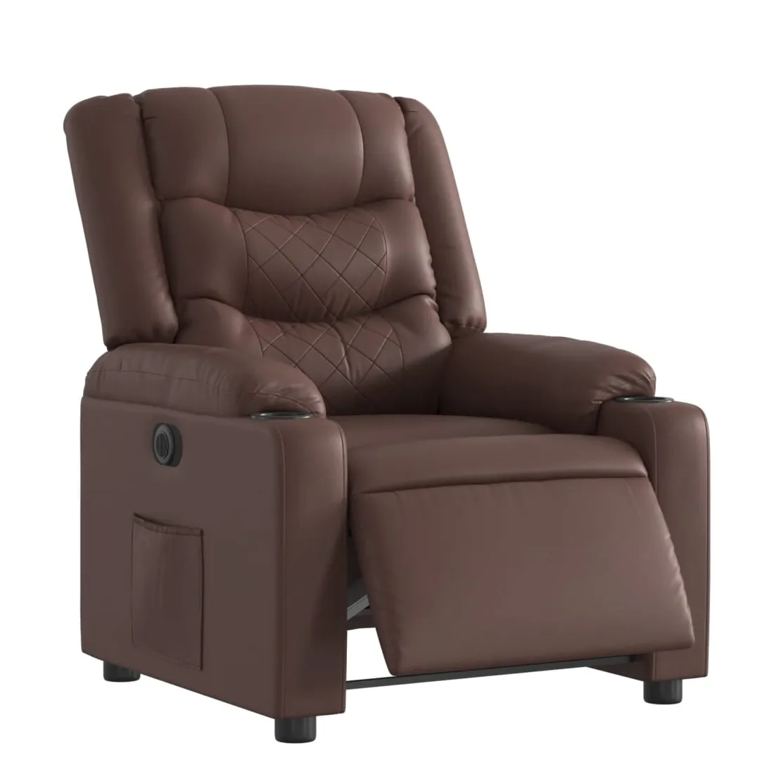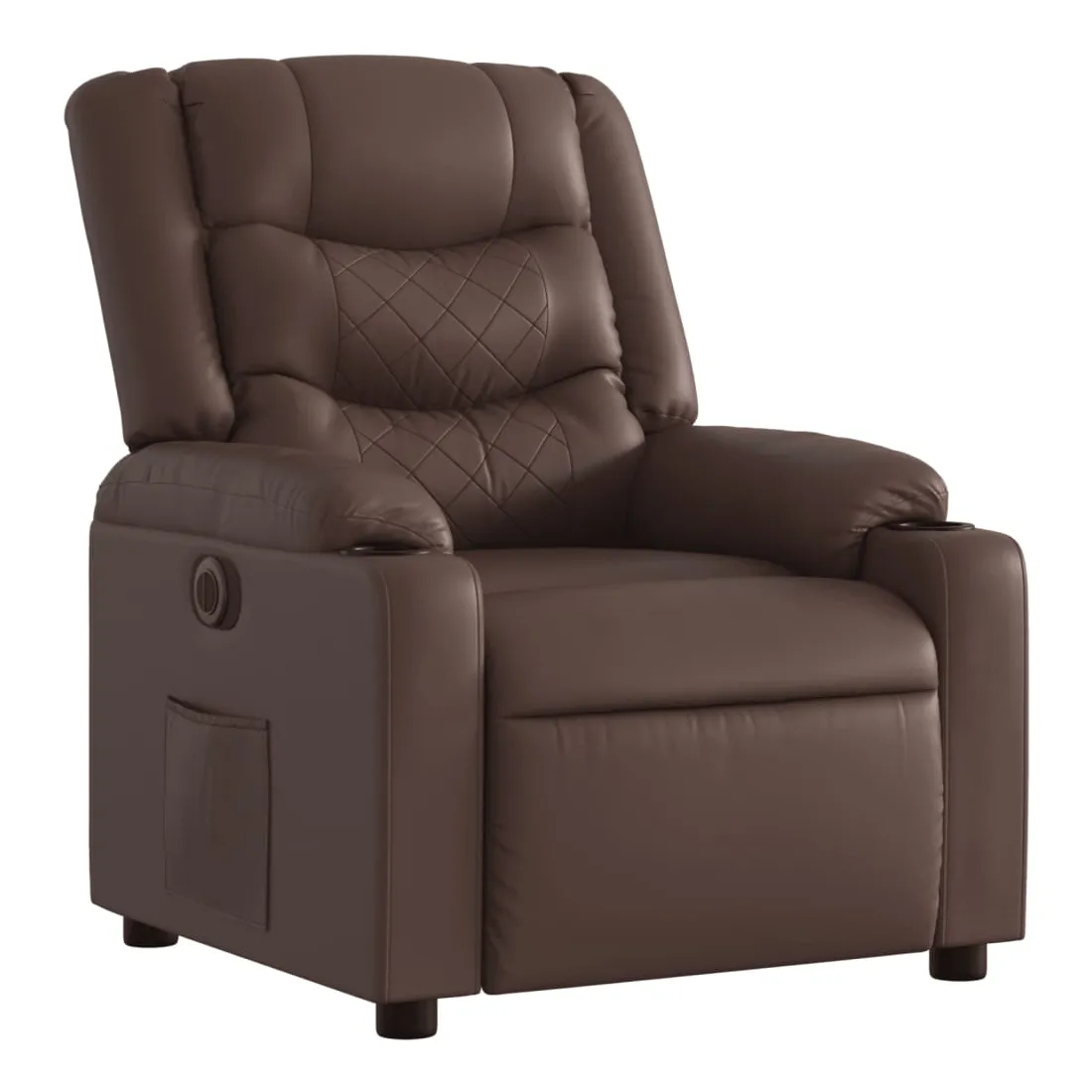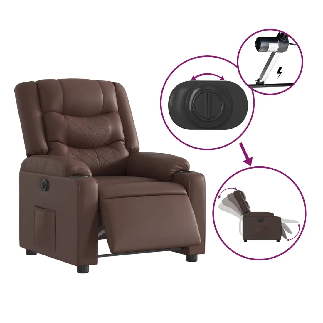 Asseyez-vous et détendez-vous dans ce fauteuil inclinable électrique très confortable ! Fonction d'inclinaison électrique : ce fauteuil inclinable est équipé d'un moteur électrique qui permet de régler automatiquement le repose-pied et le dossier dans n'importe quelle position, selon votre confort, en appuyant simplement sur le bouton situé sur le côté du fauteuil. Cette fonction permet une inclinaison maximale de 135 degrés. En outre, le dossier peut revenir automatiquement à sa position d'origine par une simple pression sur le bouton.Expérience de siège confortable : le siège, le dossier et les larges accoudoirs rembourrés épais recouverts de similicuir procurent une sensation confortable, vous faisant vous sentir enlacé lorsque vous êtes assis. Le similicuir est un matériau très résistant. Il est résistant aux taches, ce qui le rend facile à nettoyer avec un chiffon humide. La surface lisse donne également un aspect luxueux et la beauté du cuir véritable.Poche latérale pratique : ce fauteuil est doté d'une poche latérale pour vous permettre de garder vos objets essentiels à portée de main.Cadre solide et stable : le cadre en bois et en métal offre une structure solide et une grande stabilité. Ce fauteuil inclinable est confortable et durable.
