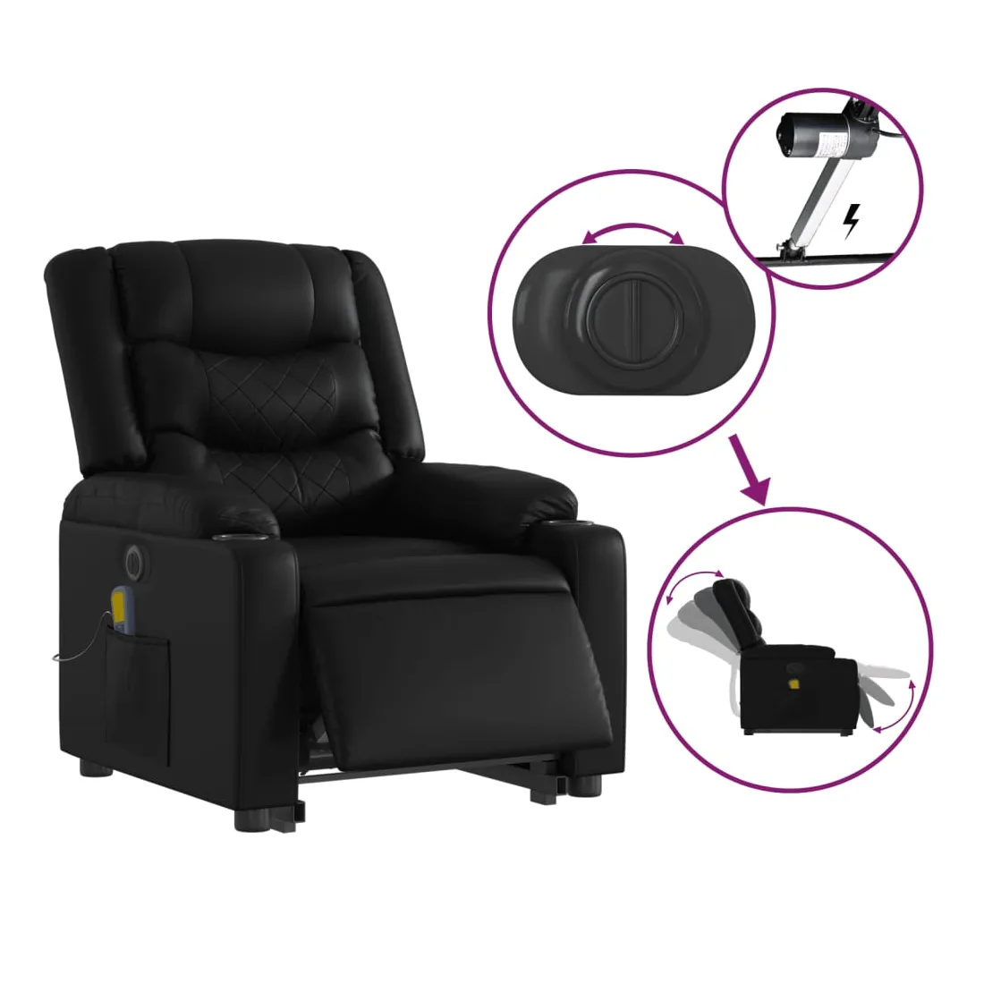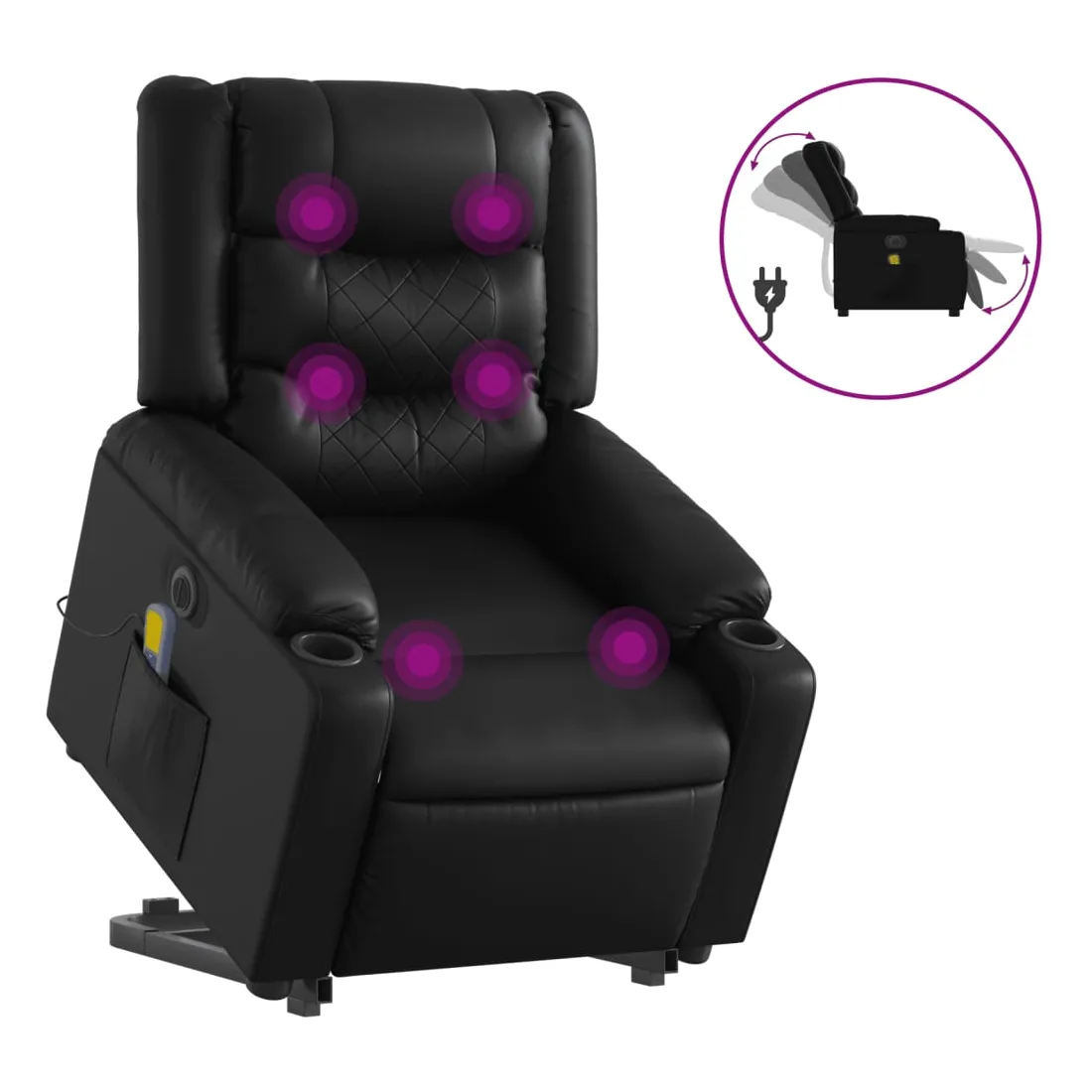 Asseyez-vous et détendez-vous dans ce fauteuil inclinable de massage électrique très confortable ! Fonction de levage électrique : ce fauteuil inclinable pour personnes âgées est équipé d'un moteur électrique pour la fonction de levage. Grâce à la fonction qui pousse toute la chaise vers le haut, vous pouvez facilement vous tenir debout sans stresser votre dos et vos genoux en appuyant simplement sur le bouton.Fonction d'inclinaison électrique : ce fauteuil inclinable est également équipé d'un moteur électrique qui permet de régler automatiquement le repose-pied et le dossier dans n'importe quelle position, selon votre confort, en appuyant simplement sur le bouton situé sur le côté du fauteuil. Cette fonction permet une inclinaison maximale de 135 degrés. En outre, le dossier peut revenir automatiquement à sa position d'origine par une simple pression sur le bouton.Fonction de vibration : les 6 points de massage vous permettent de faire l'expérience d'un massage mieux ciblé. De plus, la télécommande incluse vous permet de choisir différents programmes de massage. La fonction de massage est alimentée par le connecteur USB qui nécessite une source d'alimentation USB certifiée de 5 V (non fournie).Expérience de siège confortable : le siège, le dossier et les larges accoudoirs rembourrés épais recouverts de similicuir procurent une sensation confortable, vous faisant vous sentir enlacé lorsque vous êtes assis. Le similicuir est un matériau très résistant. Il est résistant aux taches, ce qui le rend facile à nettoyer avec un chiffon humide. La surface lisse donne également un aspect luxueux et la beauté du cuir véritable.Poche latérale pratique : ce fauteuil est doté d'une poche latérale pour ranger votre télécommande ou garder vos objets essentiels à portée de main.Cadre solide et stable : le cadre en bois et en métal offre une structure solide et une grande stabilité. Ce fauteuil inclinable est confortable et durable.