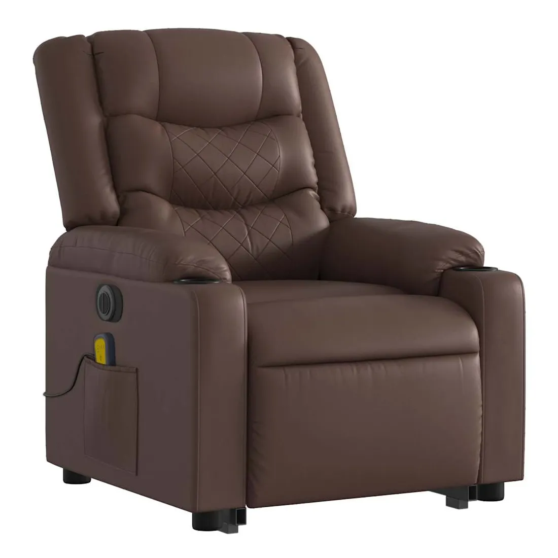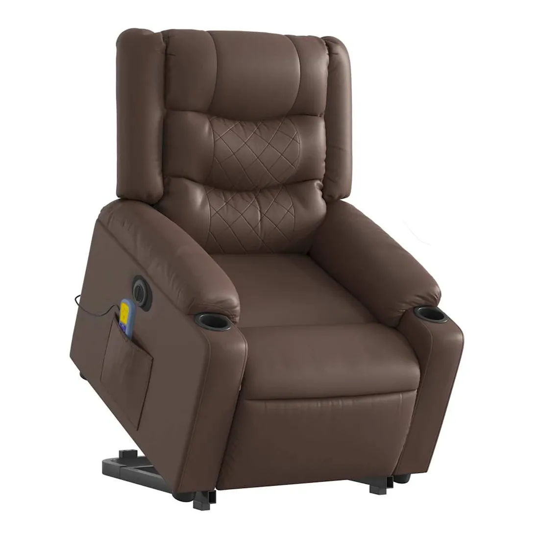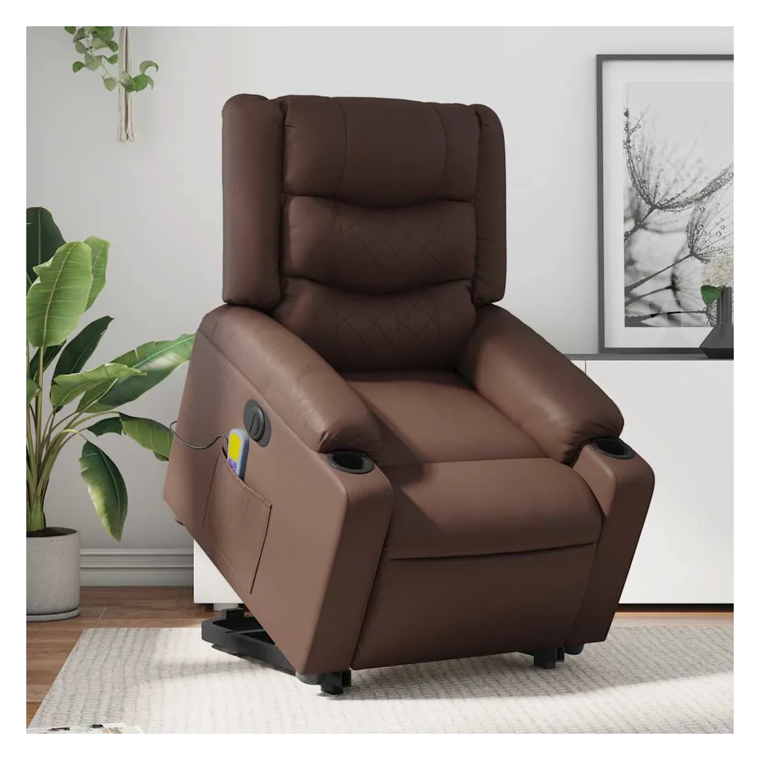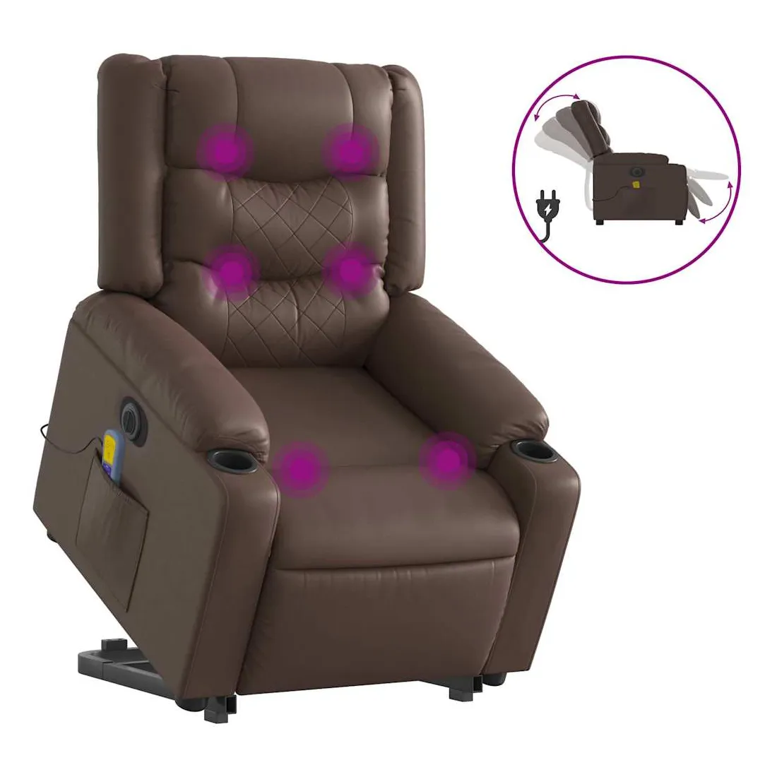 Asseyez-vous et détendez-vous dans ce fauteuil inclinable de massage électrique très confortable ! Fonction de levage électrique : ce fauteuil inclinable pour personnes âgées est équipé d'un moteur électrique pour la fonction de levage. Grâce à la fonction qui pousse toute la chaise vers le haut, vous pouvez facilement vous tenir debout sans stresser votre dos et vos genoux en appuyant simplement sur le bouton.Fonction d'inclinaison électrique : ce fauteuil inclinable est également équipé d'un moteur électrique qui permet de régler automatiquement le repose-pied et le dossier dans n'importe quelle position, selon votre confort, en appuyant simplement sur le bouton situé sur le côté du fauteuil. Cette fonction permet une inclinaison maximale de 135 degrés. En outre, le dossier peut revenir automatiquement à sa position d'origine par une simple pression sur le bouton.Fonction de vibration : les 6 points de massage vous permettent de faire l'expérience d'un massage mieux ciblé. De plus, la télécommande incluse vous permet de choisir différents programmes de massage. La fonction de massage est alimentée par le connecteur USB qui nécessite une source d'alimentation USB certifiée de 5 V (non fournie).Expérience de siège confortable : le siège, le dossier et les larges accoudoirs rembourrés épais recouverts de similicuir procurent une sensation confortable, vous faisant vous sentir enlacé lorsque vous êtes assis. Le similicuir est un matériau très résistant. Il est résistant aux taches, ce qui le rend facile à nettoyer avec un chiffon humide. La surface lisse donne également un aspect luxueux et la beauté du cuir véritable.Poche latérale pratique : ce fauteuil est doté d'une poche latérale pour ranger votre télécommande ou garder vos objets essentiels à portée de main.Cadre solide et stable : le cadre en bois et en métal offre une structure solide et une grande stabilité. Ce fauteuil inclinable est confortable et durable.