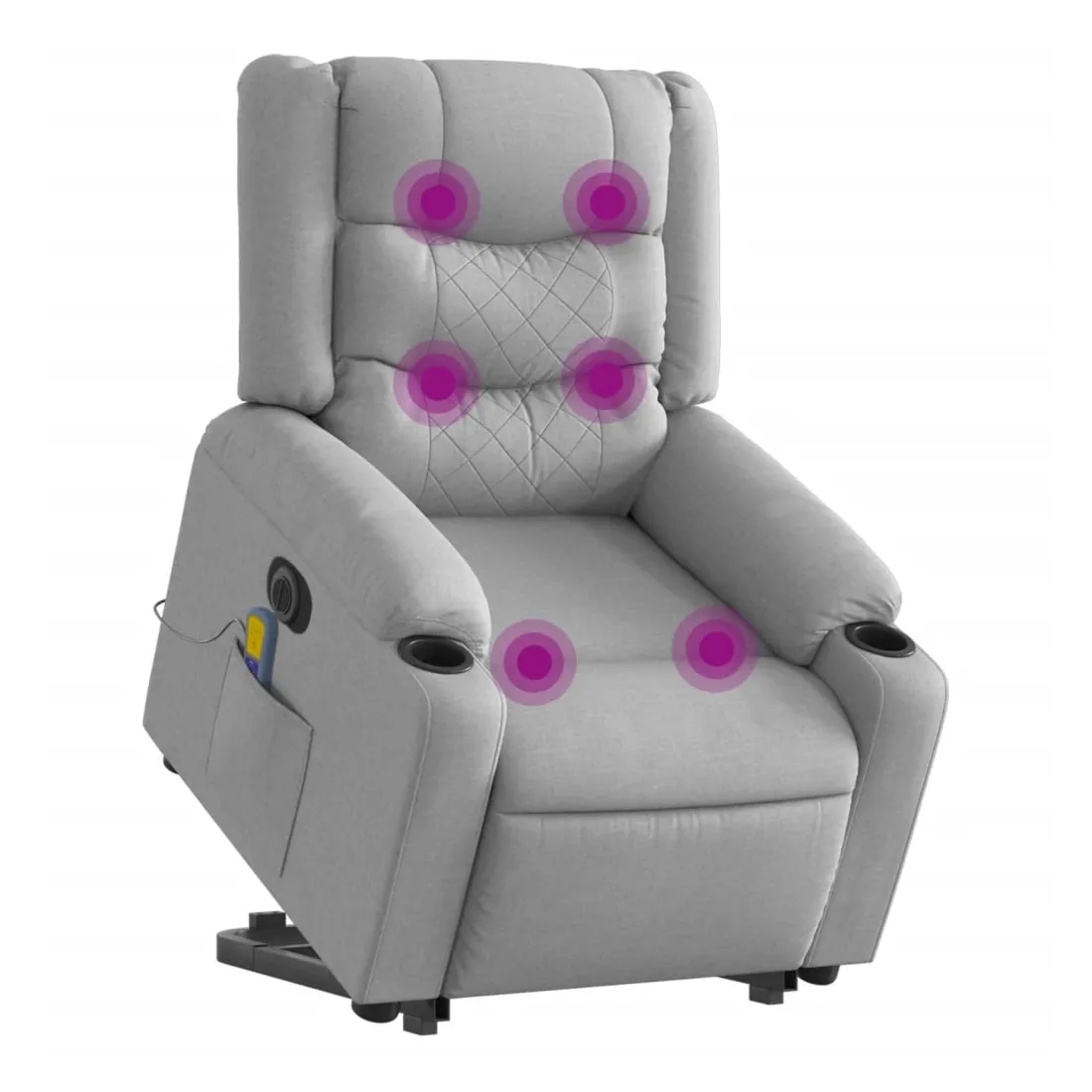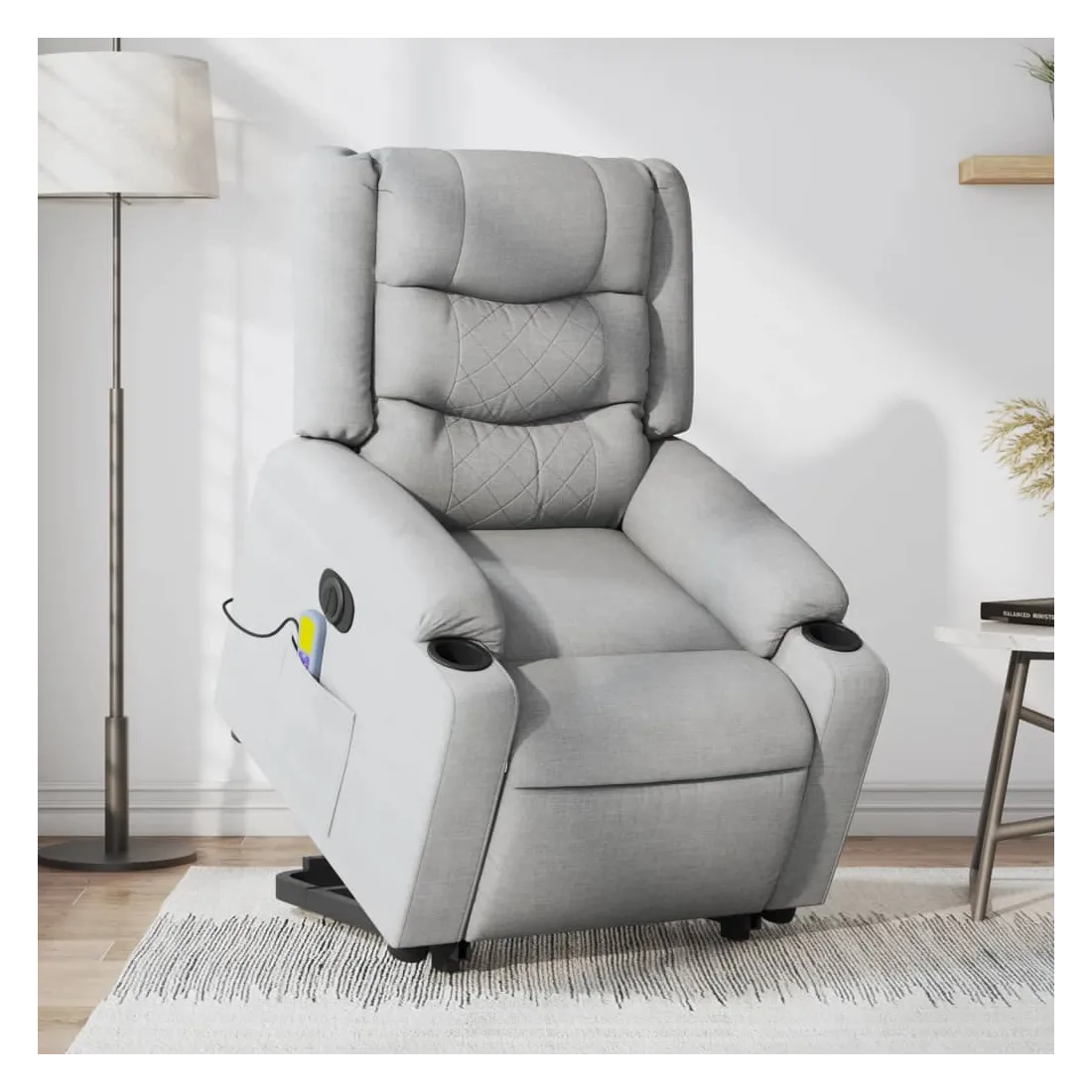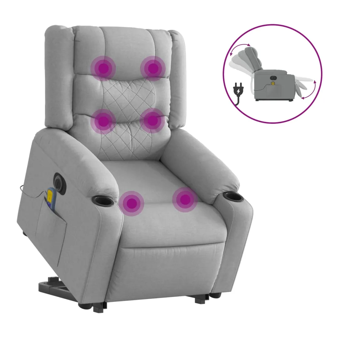 Asseyez-vous et détendez-vous dans ce fauteuil inclinable de massage électrique très confortable ! Fonction de levage électrique : ce fauteuil inclinable pour personnes âgées est équipé d'un moteur électrique pour la fonction de levage. Grâce à la fonction qui pousse toute la chaise vers le haut, vous pouvez facilement vous tenir debout sans stresser votre dos et vos genoux en appuyant simplement sur le bouton.Fonction d'inclinaison électrique : ce fauteuil inclinable est également équipé d'un moteur électrique qui permet de régler automatiquement le repose-pied et le dossier dans n'importe quelle position, selon votre confort, en appuyant simplement sur le bouton situé sur le côté du fauteuil. Cette fonction permet une inclinaison maximale de 135 degrés. En outre, le dossier peut revenir automatiquement à sa position d'origine par une simple pression sur le bouton.Fonction de vibration : les 6 points de massage vous permettent de faire l'expérience d'un massage mieux ciblé. De plus, la télécommande incluse vous permet de choisir différents programmes de massage. La fonction de massage est alimentée par le connecteur USB qui nécessite une source d'alimentation USB certifiée de 5 V (non fournie).Expérience d'assise confortable : le siège, le dossier et les larges accoudoirs bien rembourrés recouverts de tissu procurent une sensation confortable et chaleureuse, vous permettant de vous sentir enveloppé lorsque vous êtes assis. Le tissu présente un aspect simple et épuré et est respirant et durable.Poche latérale pratique : ce fauteuil est doté d'une poche latérale pour ranger votre télécommande ou garder vos objets essentiels à portée de main.Cadre solide et stable : le cadre en bois et en métal offre une structure solide et une grande stabilité. Ce fauteuil inclinable est confortable et durable.