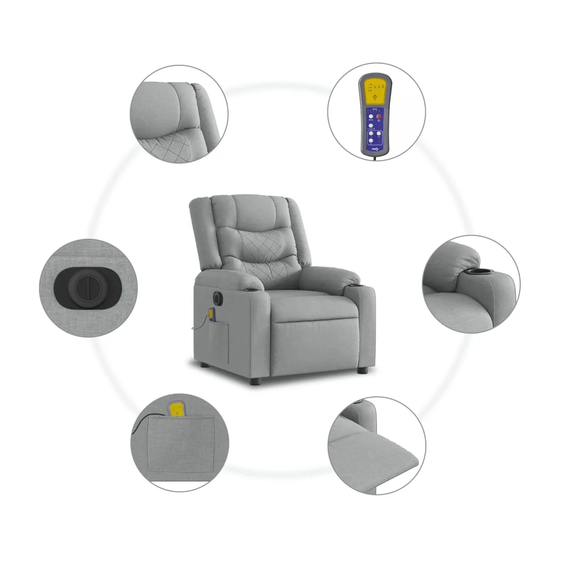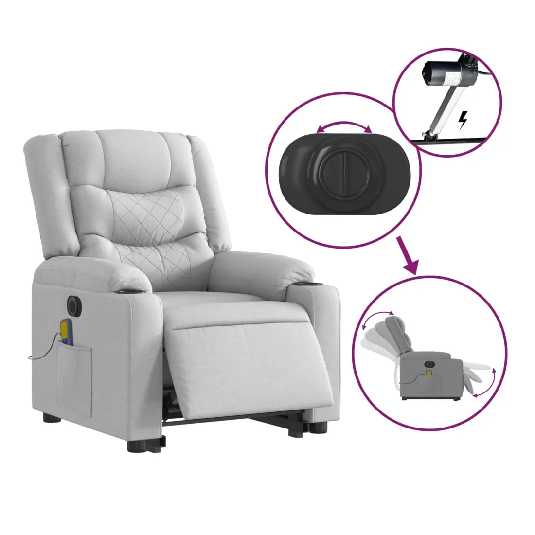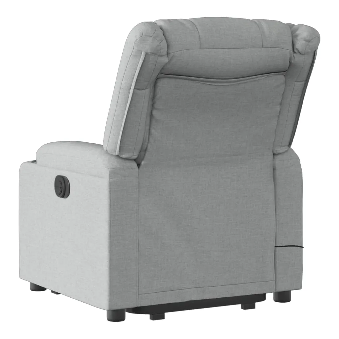 Asseyez-vous et détendez-vous dans ce fauteuil inclinable de massage électrique très confortable ! Fonction de levage électrique : ce fauteuil inclinable pour personnes âgées est équipé d'un moteur électrique pour la fonction de levage. Grâce à la fonction qui pousse toute la chaise vers le haut, vous pouvez facilement vous tenir debout sans stresser votre dos et vos genoux en appuyant simplement sur le bouton.Fonction d'inclinaison électrique : ce fauteuil inclinable est également équipé d'un moteur électrique qui permet de régler automatiquement le repose-pied et le dossier dans n'importe quelle position, selon votre confort, en appuyant simplement sur le bouton situé sur le côté du fauteuil. Cette fonction permet une inclinaison maximale de 135 degrés. En outre, le dossier peut revenir automatiquement à sa position d'origine par une simple pression sur le bouton.Fonction de vibration : les 6 points de massage vous permettent de faire l'expérience d'un massage mieux ciblé. De plus, la télécommande incluse vous permet de choisir différents programmes de massage. La fonction de massage est alimentée par le connecteur USB qui nécessite une source d'alimentation USB certifiée de 5 V (non fournie).Expérience d'assise confortable : le siège, le dossier et les larges accoudoirs bien rembourrés recouverts de tissu procurent une sensation confortable et chaleureuse, vous permettant de vous sentir enveloppé lorsque vous êtes assis. Le tissu présente un aspect simple et épuré et est respirant et durable.Poche latérale pratique : ce fauteuil est doté d'une poche latérale pour ranger votre télécommande ou garder vos objets essentiels à portée de main.Cadre solide et stable : le cadre en bois et en métal offre une structure solide et une grande stabilité. Ce fauteuil inclinable est confortable et durable.
