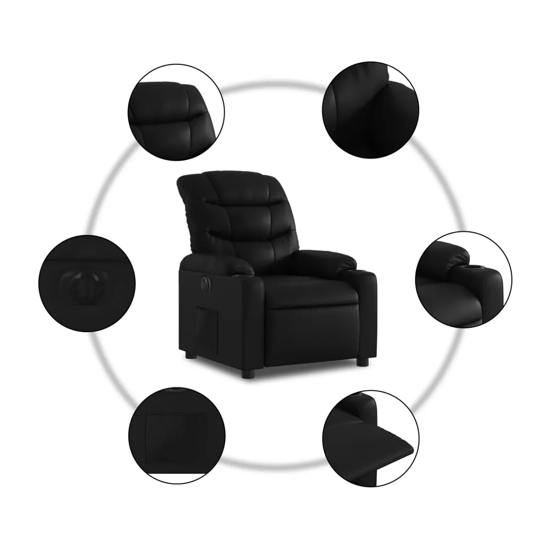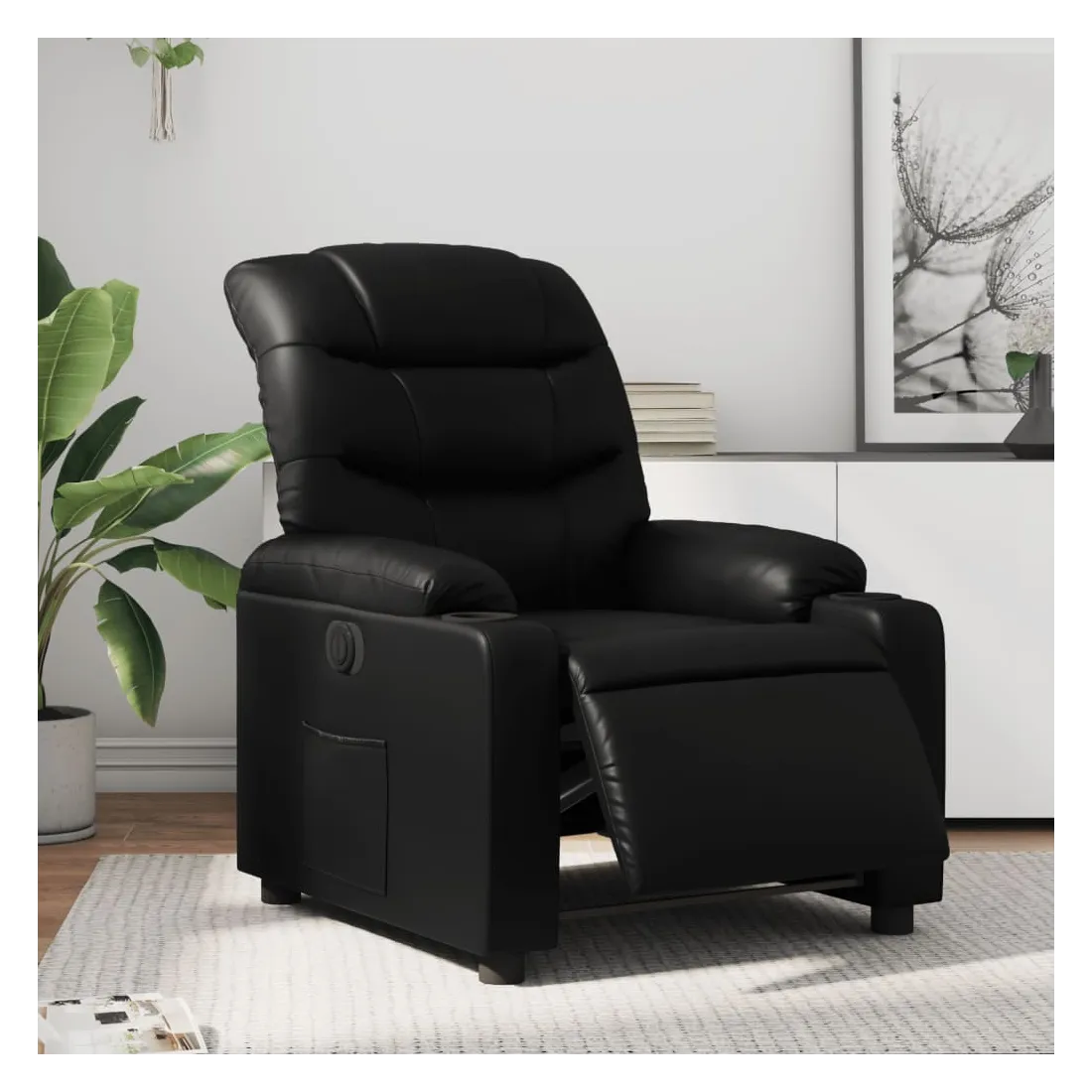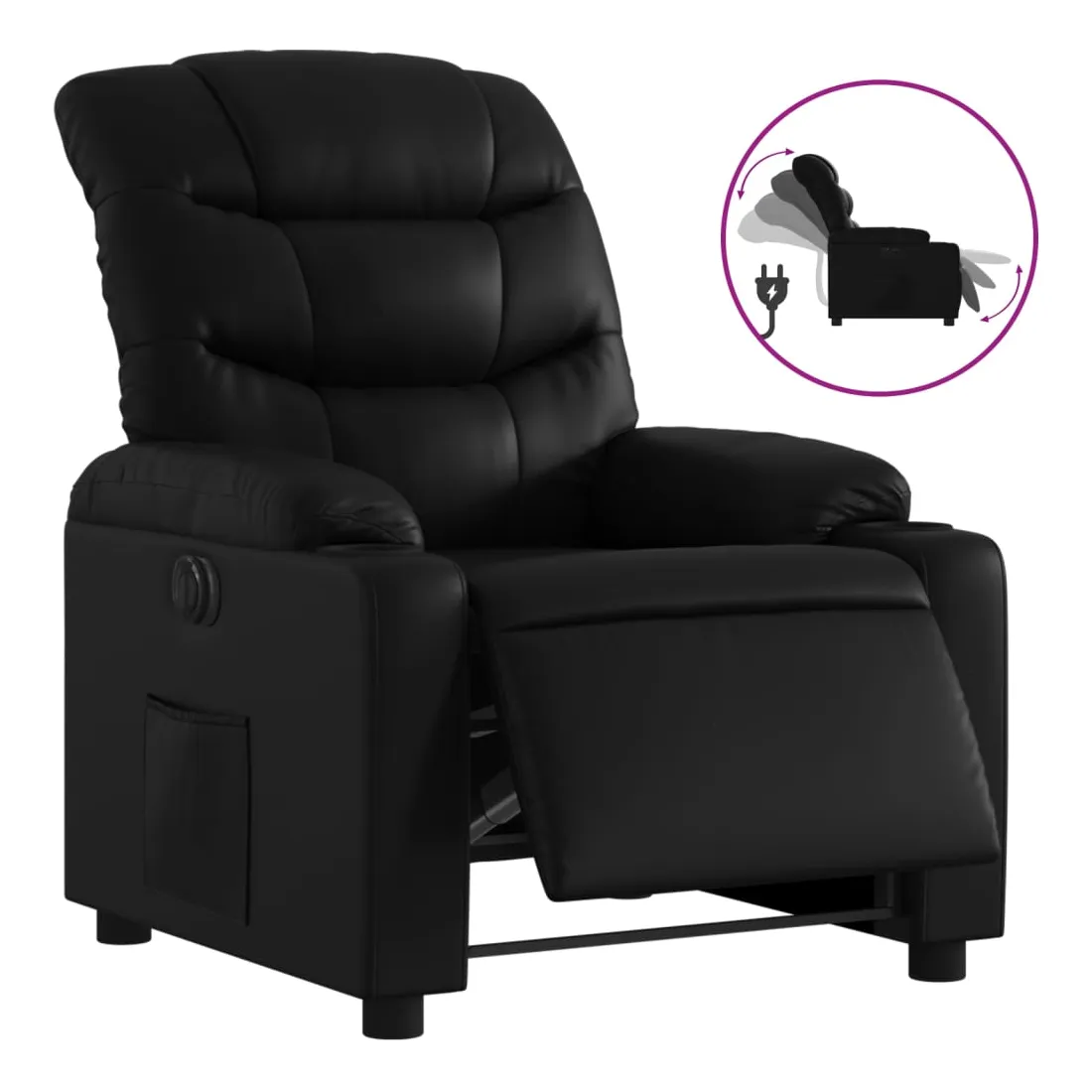 Asseyez-vous et détendez-vous dans ce fauteuil inclinable électrique très confortable ! Fonction d'inclinaison électrique : ce fauteuil inclinable est équipé d'un moteur électrique qui permet de régler automatiquement le repose-pied et le dossier dans n'importe quelle position, selon votre confort, en appuyant simplement sur le bouton situé sur le côté du fauteuil. Cette fonction permet une inclinaison maximale de 135 degrés. En outre, le dossier peut revenir automatiquement à sa position d'origine par une simple pression sur le bouton.Expérience de siège confortable : le siège, le dossier et les larges accoudoirs rembourrés épais recouverts de similicuir procurent une sensation confortable et chaleureuse, vous faisant vous sentir enlacé lorsque vous êtes assis. Le simili cuir est un matériau très résistant. Il est résistant aux taches, ce qui le rend facile à nettoyer avec un chiffon humide. La surface lisse donne également un aspect luxueux et la beauté du cuir véritable.Poche latérale pratique : ce fauteuil est doté d'une poche latérale pour vous permettre de garder vos objets essentiels à portée de main.Cadre solide et stable : le cadre en bois et en métal offre une structure solide et une grande stabilité. Ce fauteuil inclinable est confortable et durable.
