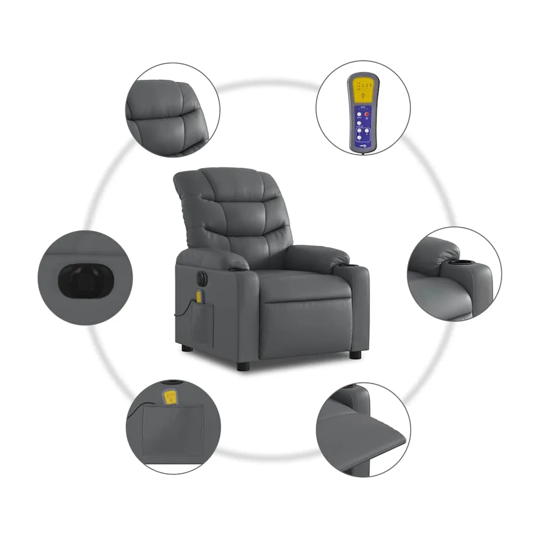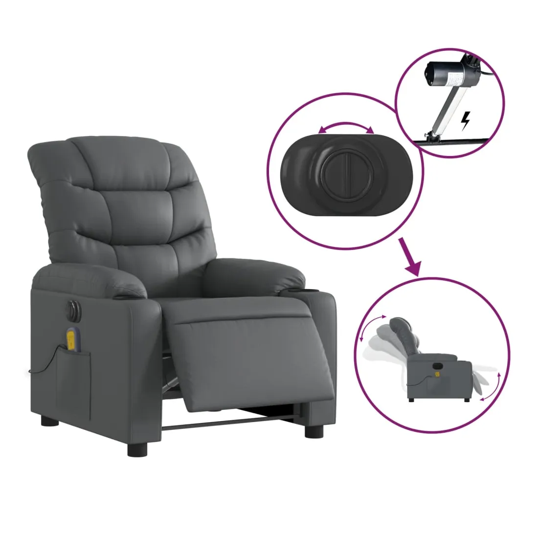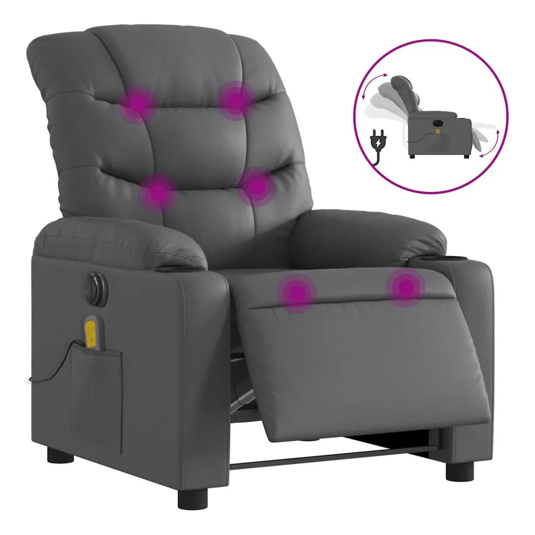 Asseyez-vous et détendez-vous dans ce fauteuil inclinable de massage électrique très confortable ! Fonction d'inclinaison électrique : ce fauteuil inclinable est équipé d'un moteur électrique qui permet de régler automatiquement le repose-pied et le dossier dans n'importe quelle position, selon votre confort, en appuyant simplement sur le bouton situé sur le côté du fauteuil. Cette fonction permet une inclinaison maximale de 135 degrés. En outre, le dossier peut revenir automatiquement à sa position d'origine par une simple pression sur le bouton.Fonction de vibration : les 6 points de massage vous permettent de faire l'expérience d'un massage mieux ciblé. De plus, la télécommande incluse vous permet de choisir différents programmes de massage. La fonction de massage est alimentée par le connecteur USB qui nécessite une source d'alimentation USB certifiée de 5 V (non fournie).Expérience de siège confortable : le siège, le dossier et les larges accoudoirs rembourrés épais recouverts de similicuir procurent une sensation confortable et chaleureuse, vous faisant vous sentir enlacé lorsque vous êtes assis. Le simili cuir est un matériau très résistant. Il est résistant aux taches, ce qui le rend facile à nettoyer avec un chiffon humide. La surface lisse donne également un aspect luxueux et la beauté du cuir véritable.Poche latérale pratique : ce fauteuil est doté d'une poche latérale pour ranger votre télécommande ou garder vos objets essentiels à portée de main.Cadre solide et stable : le cadre en bois et en métal offre une structure solide et une grande stabilité. Ce fauteuil inclinable est confortable et durable.