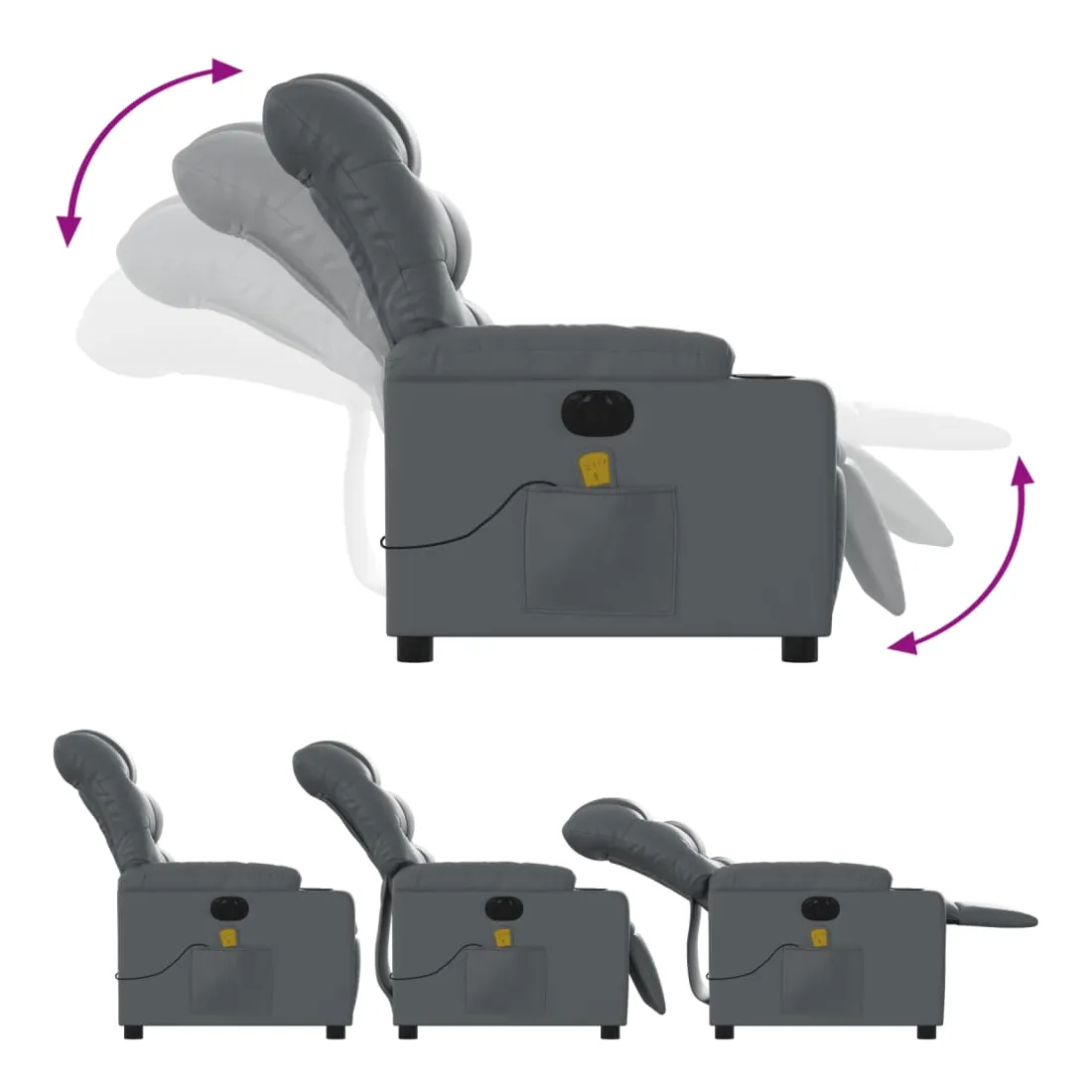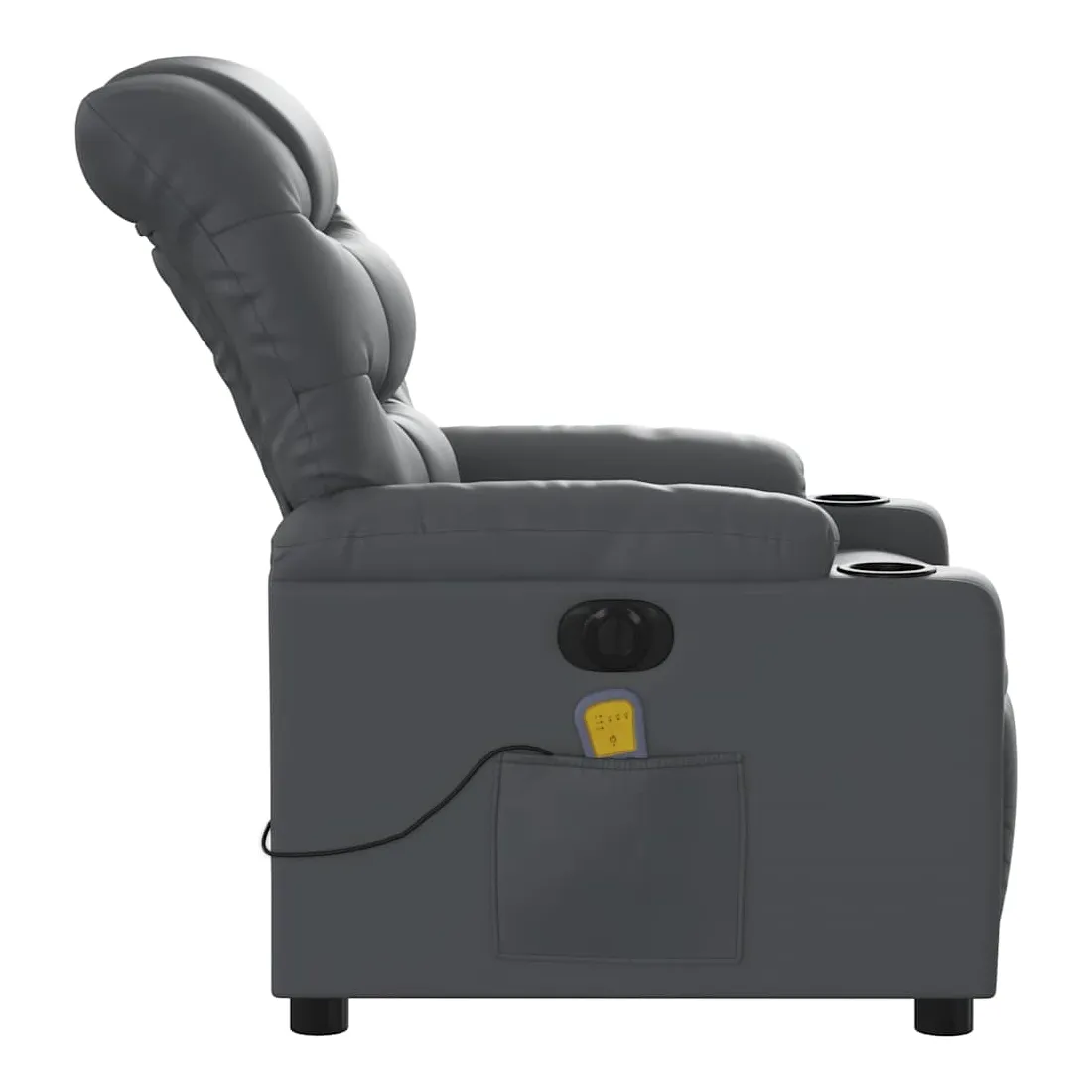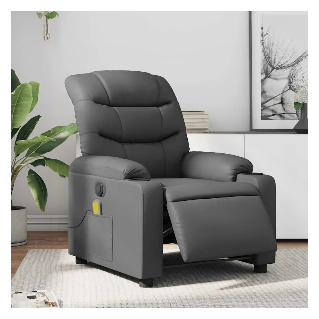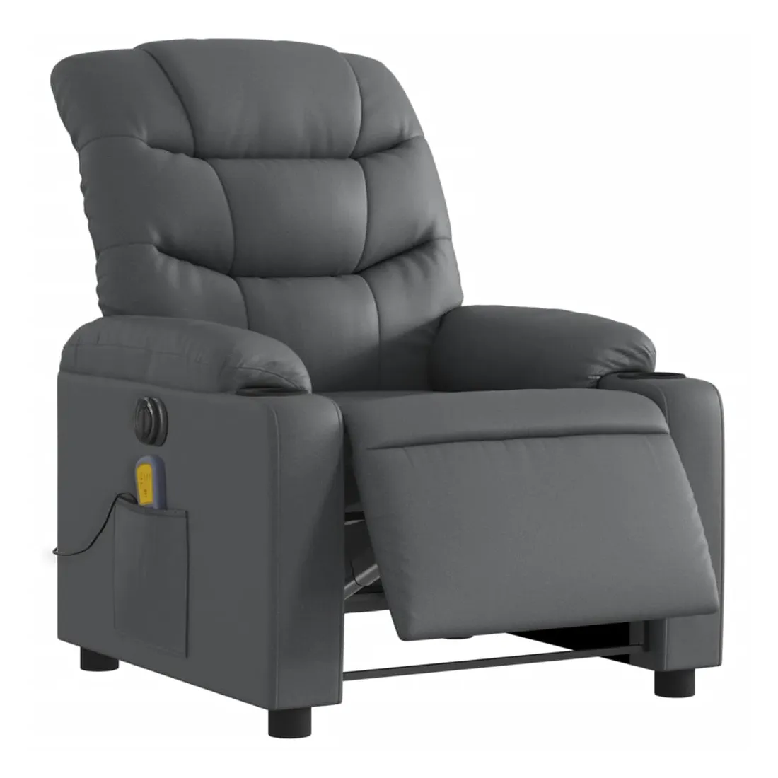 Asseyez-vous et détendez-vous dans ce fauteuil inclinable de massage électrique très confortable ! Fonction d'inclinaison électrique : ce fauteuil inclinable est équipé d'un moteur électrique qui permet de régler automatiquement le repose-pied et le dossier dans n'importe quelle position, selon votre confort, en appuyant simplement sur le bouton situé sur le côté du fauteuil. Cette fonction permet une inclinaison maximale de 135 degrés. En outre, le dossier peut revenir automatiquement à sa position d'origine par une simple pression sur le bouton.Fonction de vibration : les 6 points de massage vous permettent de faire l'expérience d'un massage mieux ciblé. De plus, la télécommande incluse vous permet de choisir différents programmes de massage. La fonction de massage est alimentée par le connecteur USB qui nécessite une source d'alimentation USB certifiée de 5 V (non fournie).Expérience de siège confortable : le siège, le dossier et les larges accoudoirs rembourrés épais recouverts de similicuir procurent une sensation confortable et chaleureuse, vous faisant vous sentir enlacé lorsque vous êtes assis. Le simili cuir est un matériau très résistant. Il est résistant aux taches, ce qui le rend facile à nettoyer avec un chiffon humide. La surface lisse donne également un aspect luxueux et la beauté du cuir véritable.Poche latérale pratique : ce fauteuil est doté d'une poche latérale pour ranger votre télécommande ou garder vos objets essentiels à portée de main.Cadre solide et stable : le cadre en bois et en métal offre une structure solide et une grande stabilité. Ce fauteuil inclinable est confortable et durable.