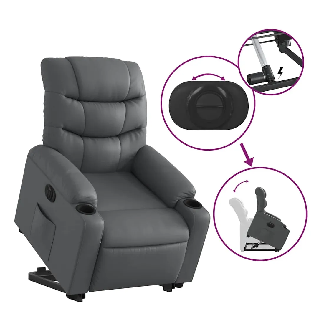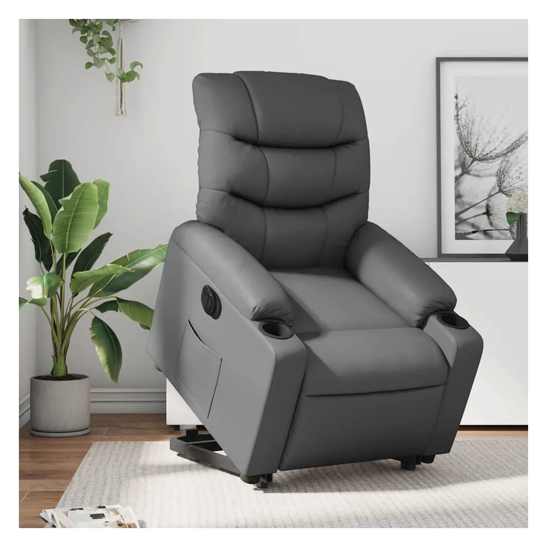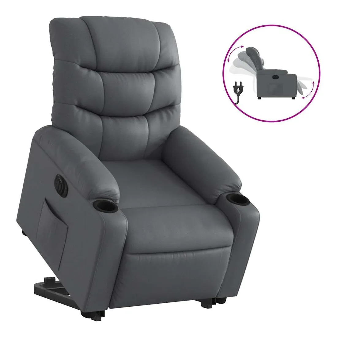 Asseyez-vous et détendez-vous dans ce fauteuil inclinable électrique très confortable ! Fonction de levage électrique : ce fauteuil inclinable pour personnes âgées est équipé d'un moteur électrique pour la fonction de levage. Grâce à la fonction qui pousse toute la chaise vers le haut, vous pouvez facilement vous tenir debout sans stresser votre dos et vos genoux en appuyant simplement sur le bouton.Fonction d'inclinaison électrique : ce fauteuil inclinable est également équipé d'un moteur électrique qui permet de régler automatiquement le repose-pied et le dossier dans n'importe quelle position, selon votre confort, en appuyant simplement sur le bouton situé sur le côté du fauteuil. Cette fonction permet une inclinaison maximale de 135 degrés. En outre, le dossier peut revenir automatiquement à sa position d'origine par une simple pression sur le bouton.Expérience de siège confortable : le siège, le dossier et les larges accoudoirs rembourrés épais recouverts de similicuir procurent une sensation confortable et chaleureuse, vous faisant vous sentir enlacé lorsque vous êtes assis. Le simili cuir est un matériau très résistant. Il est résistant aux taches, ce qui le rend facile à nettoyer avec un chiffon humide. La surface lisse donne également un aspect luxueux et la beauté du cuir véritable.Poche latérale pratique : ce fauteuil est doté d'une poche latérale pour vous permettre de garder vos objets essentiels à portée de main.Cadre solide et stable : le cadre en bois et en métal offre une structure solide et une grande stabilité. Ce fauteuil inclinable est confortable et durable.