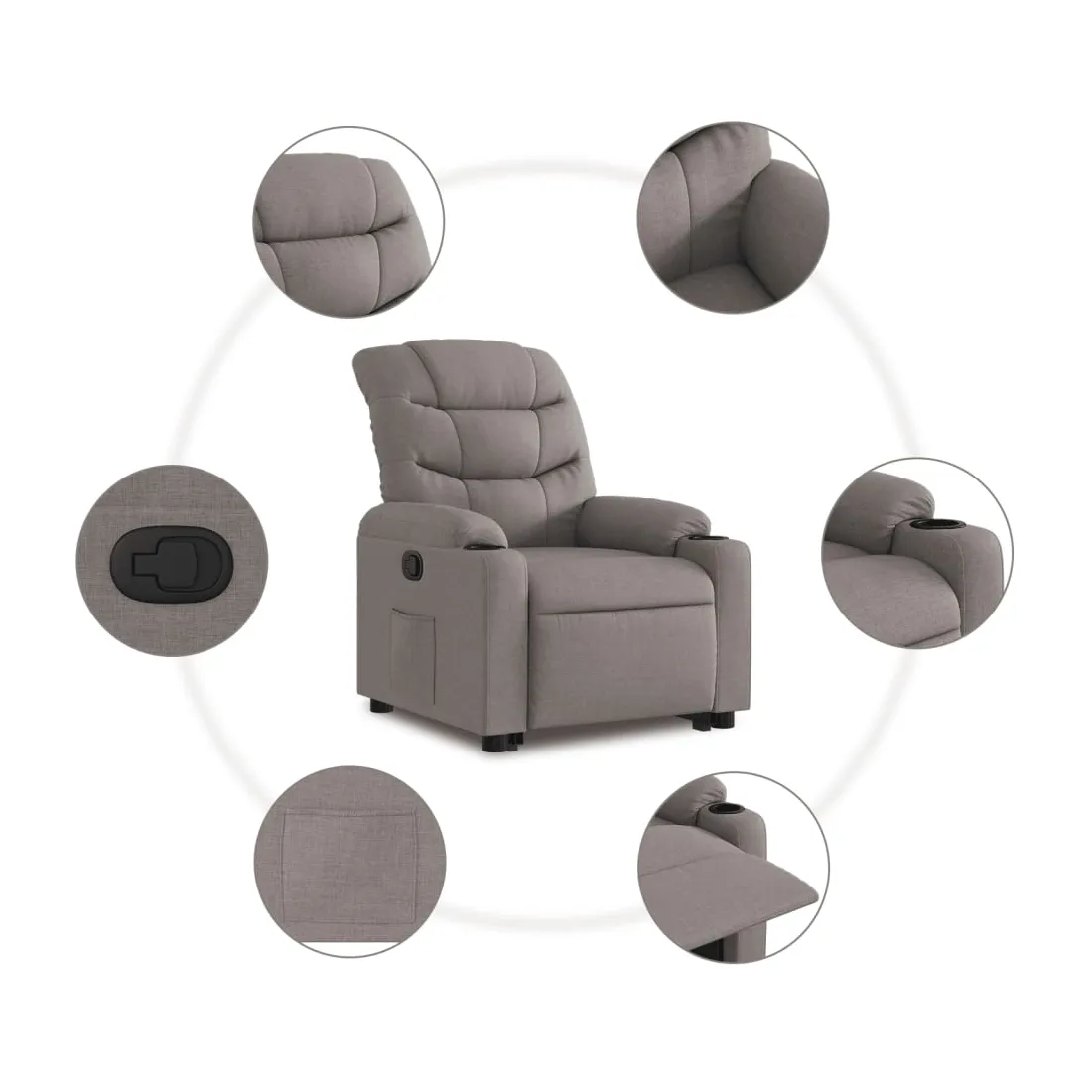 Asseyez-vous et détendez-vous dans ce fauteuil inclinable très confortable ! Fonction de levage électrique : ce fauteuil inclinable pour personnes âgées est équipé d'un moteur électrique pour la fonction de levage. Grâce à la fonction qui pousse toute la chaise vers le haut, vous pouvez facilement vous tenir debout sans stresser votre dos et vos genoux en appuyant simplement sur le bouton.Fonction d'inclinaison manuelle : ce fauteuil inclinable est doté d'une poignée du côté droit. Vous pouvez régler manuellement le repose-pieds et le dossier dans n'importe quelle position selon votre confort en tirant simplement sur la poignée. Cette fonction permet une inclinaison maximale de 135 degrés. De plus, le dossier peut revenir rapidement à sa position d'origine en tirant simplement sur la poignée.Expérience d'assise confortable : le siège, le dossier et les larges accoudoirs bien rembourrés recouverts de tissu procurent une sensation confortable et chaleureuse, vous permettant de vous sentir enveloppé lorsque vous êtes assis. Le tissu présente un aspect simple et épuré et est respirant et durable.Poche latérale pratique : ce fauteuil est doté d'une poche latérale pour vous permettre de garder vos objets essentiels à portée de main.Cadre solide et stable : le cadre en bois et en métal offre une structure solide et une grande stabilité. Ce fauteuil inclinable est confortable et durable.
