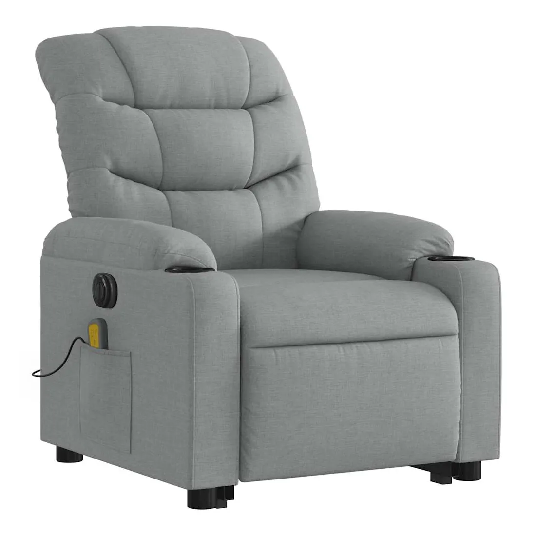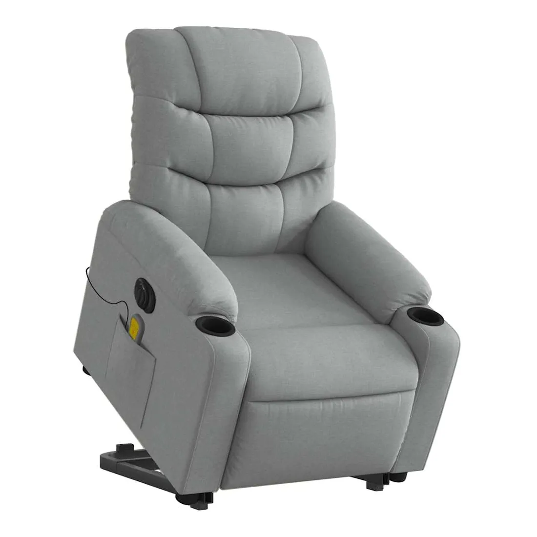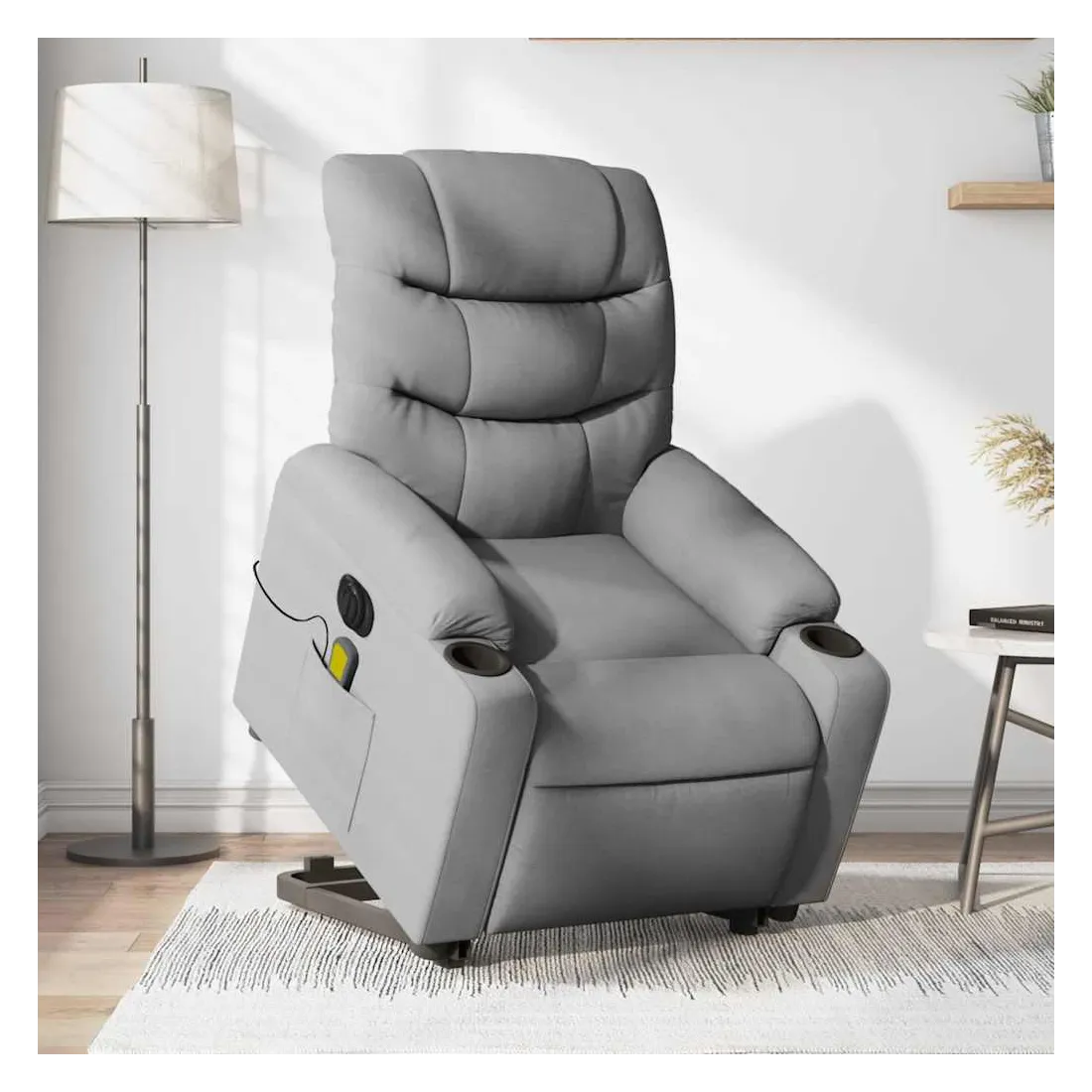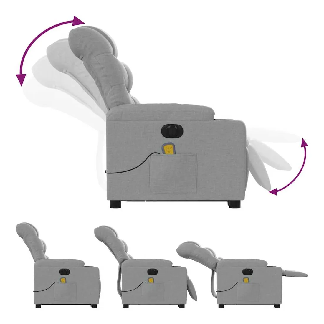 Asseyez-vous et détendez-vous dans ce fauteuil inclinable de massage électrique très confortable ! Fonction de levage électrique : ce fauteuil inclinable pour personnes âgées est équipé d'un moteur électrique pour la fonction de levage. Grâce à la fonction qui pousse toute la chaise vers le haut, vous pouvez facilement vous tenir debout sans stresser votre dos et vos genoux en appuyant simplement sur le bouton.Fonction d'inclinaison électrique : ce fauteuil inclinable est également équipé d'un moteur électrique qui permet de régler automatiquement le repose-pied et le dossier dans n'importe quelle position, selon votre confort, en appuyant simplement sur le bouton situé sur le côté du fauteuil. Cette fonction permet une inclinaison maximale de 135 degrés. En outre, le dossier peut revenir automatiquement à sa position d'origine par une simple pression sur le bouton.Fonction de vibration : les 6 points de massage vous permettent de faire l'expérience d'un massage mieux ciblé. De plus, la télécommande incluse vous permet de choisir différents programmes de massage. La fonction de massage est alimentée par le connecteur USB qui nécessite une source d'alimentation USB certifiée de 5 V (non fournie).Expérience d'assise confortable : le siège, le dossier et les larges accoudoirs bien rembourrés recouverts de tissu procurent une sensation confortable et chaleureuse, vous permettant de vous sentir enveloppé lorsque vous êtes assis. Le tissu présente un aspect simple et épuré et est respirant et durable.Poche latérale pratique : ce fauteuil est doté d'une poche latérale pour ranger votre télécommande ou garder vos objets essentiels à portée de main.Cadre solide et stable : le cadre en bois et en métal offre une structure solide et une grande stabilité. Ce fauteuil inclinable est confortable et durable.