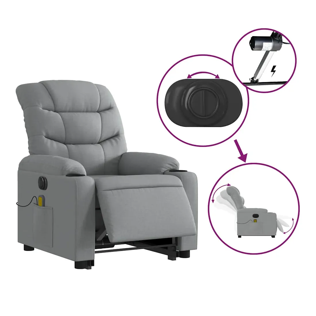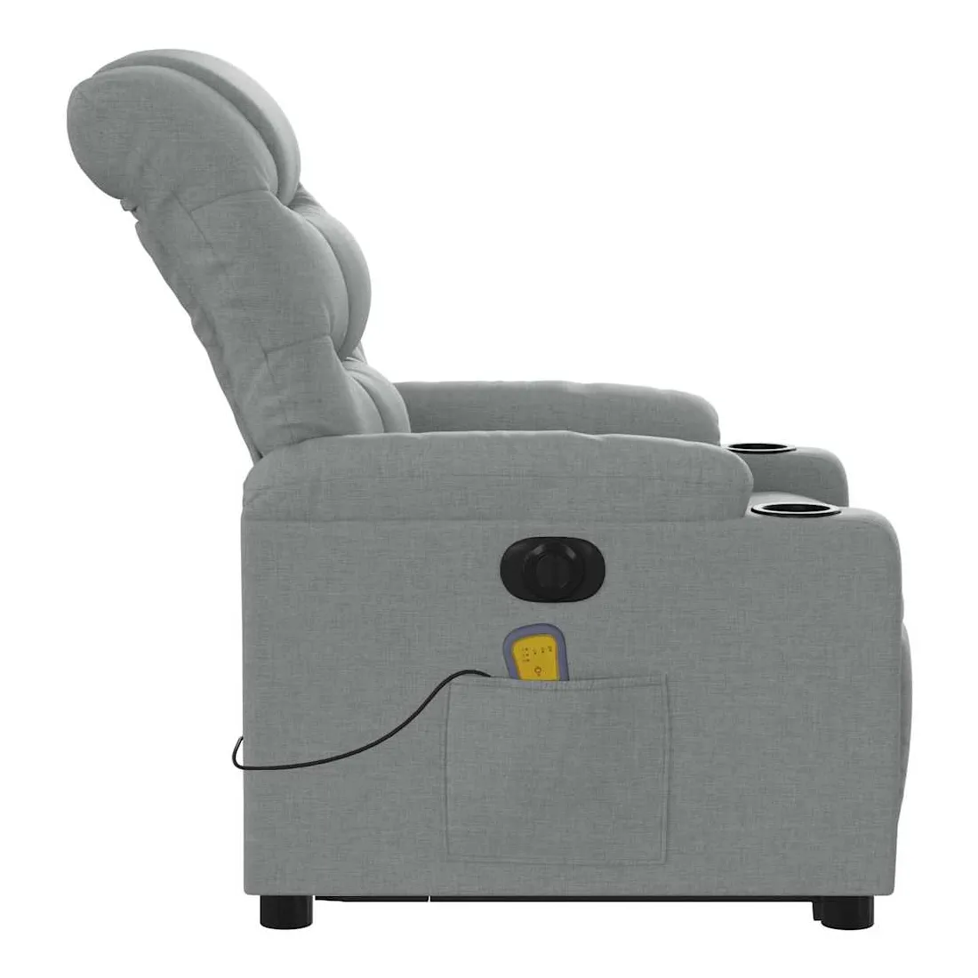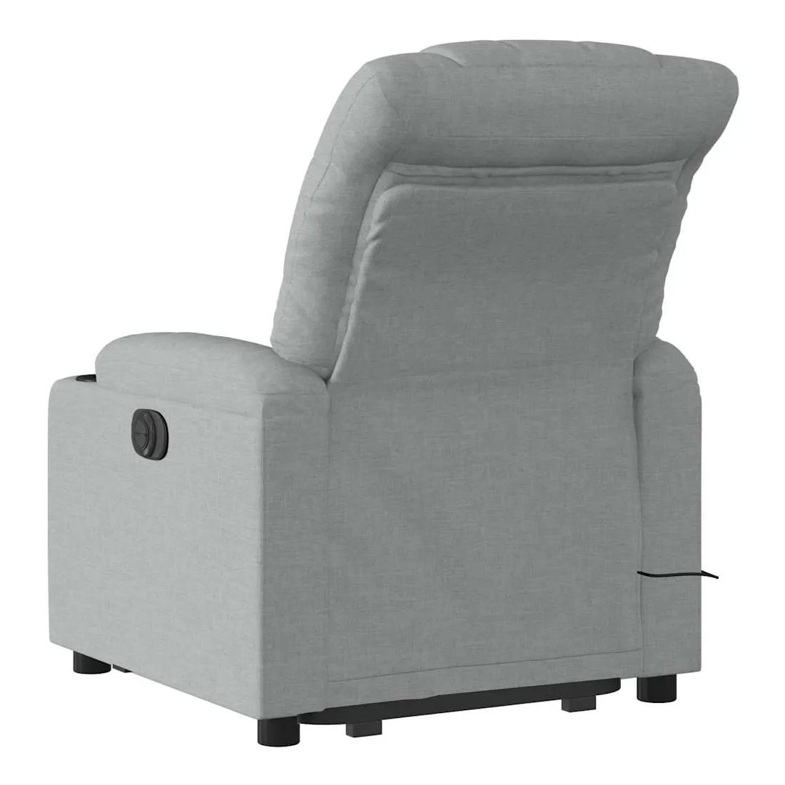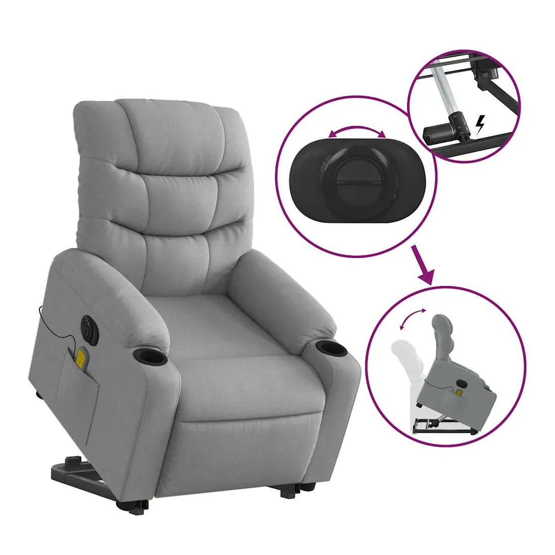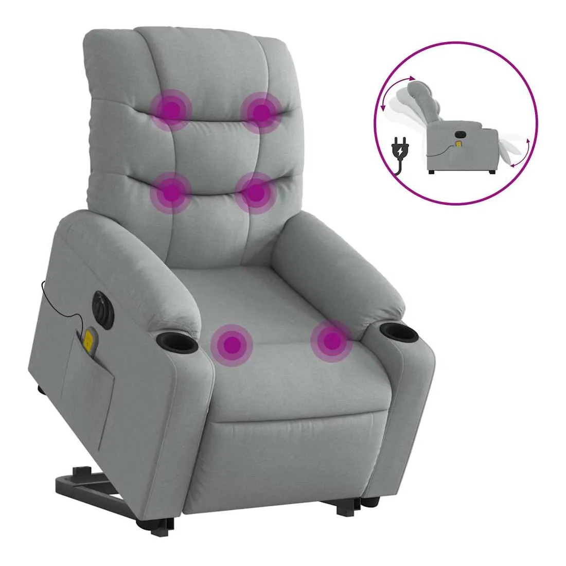 Asseyez-vous et détendez-vous dans ce fauteuil inclinable de massage électrique très confortable ! Fonction de levage électrique : ce fauteuil inclinable pour personnes âgées est équipé d'un moteur électrique pour la fonction de levage. Grâce à la fonction qui pousse toute la chaise vers le haut, vous pouvez facilement vous tenir debout sans stresser votre dos et vos genoux en appuyant simplement sur le bouton.Fonction d'inclinaison électrique : ce fauteuil inclinable est également équipé d'un moteur électrique qui permet de régler automatiquement le repose-pied et le dossier dans n'importe quelle position, selon votre confort, en appuyant simplement sur le bouton situé sur le côté du fauteuil. Cette fonction permet une inclinaison maximale de 135 degrés. En outre, le dossier peut revenir automatiquement à sa position d'origine par une simple pression sur le bouton.Fonction de vibration : les 6 points de massage vous permettent de faire l'expérience d'un massage mieux ciblé. De plus, la télécommande incluse vous permet de choisir différents programmes de massage. La fonction de massage est alimentée par le connecteur USB qui nécessite une source d'alimentation USB certifiée de 5 V (non fournie).Expérience d'assise confortable : le siège, le dossier et les larges accoudoirs bien rembourrés recouverts de tissu procurent une sensation confortable et chaleureuse, vous permettant de vous sentir enveloppé lorsque vous êtes assis. Le tissu présente un aspect simple et épuré et est respirant et durable.Poche latérale pratique : ce fauteuil est doté d'une poche latérale pour ranger votre télécommande ou garder vos objets essentiels à portée de main.Cadre solide et stable : le cadre en bois et en métal offre une structure solide et une grande stabilité. Ce fauteuil inclinable est confortable et durable.