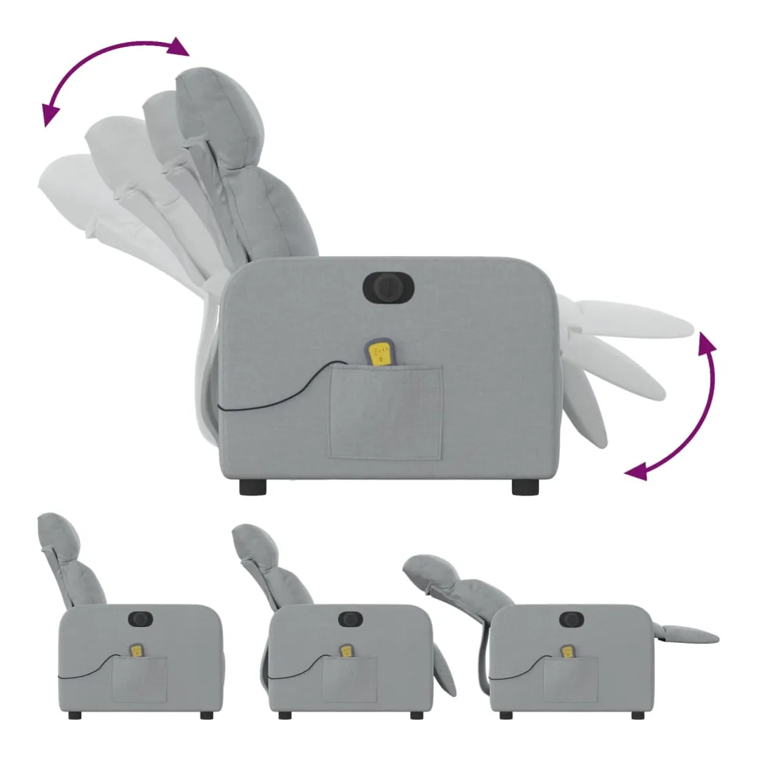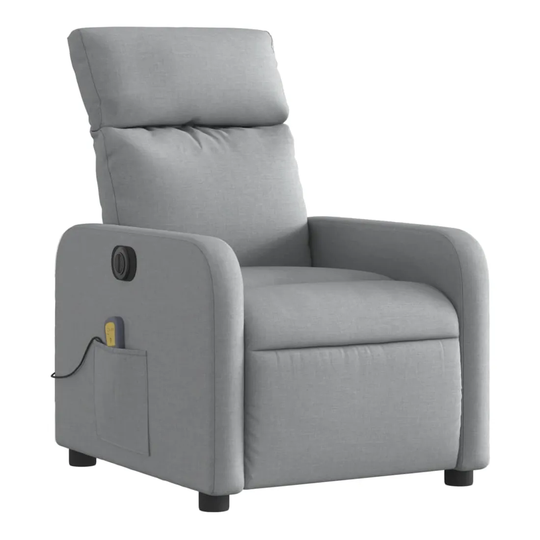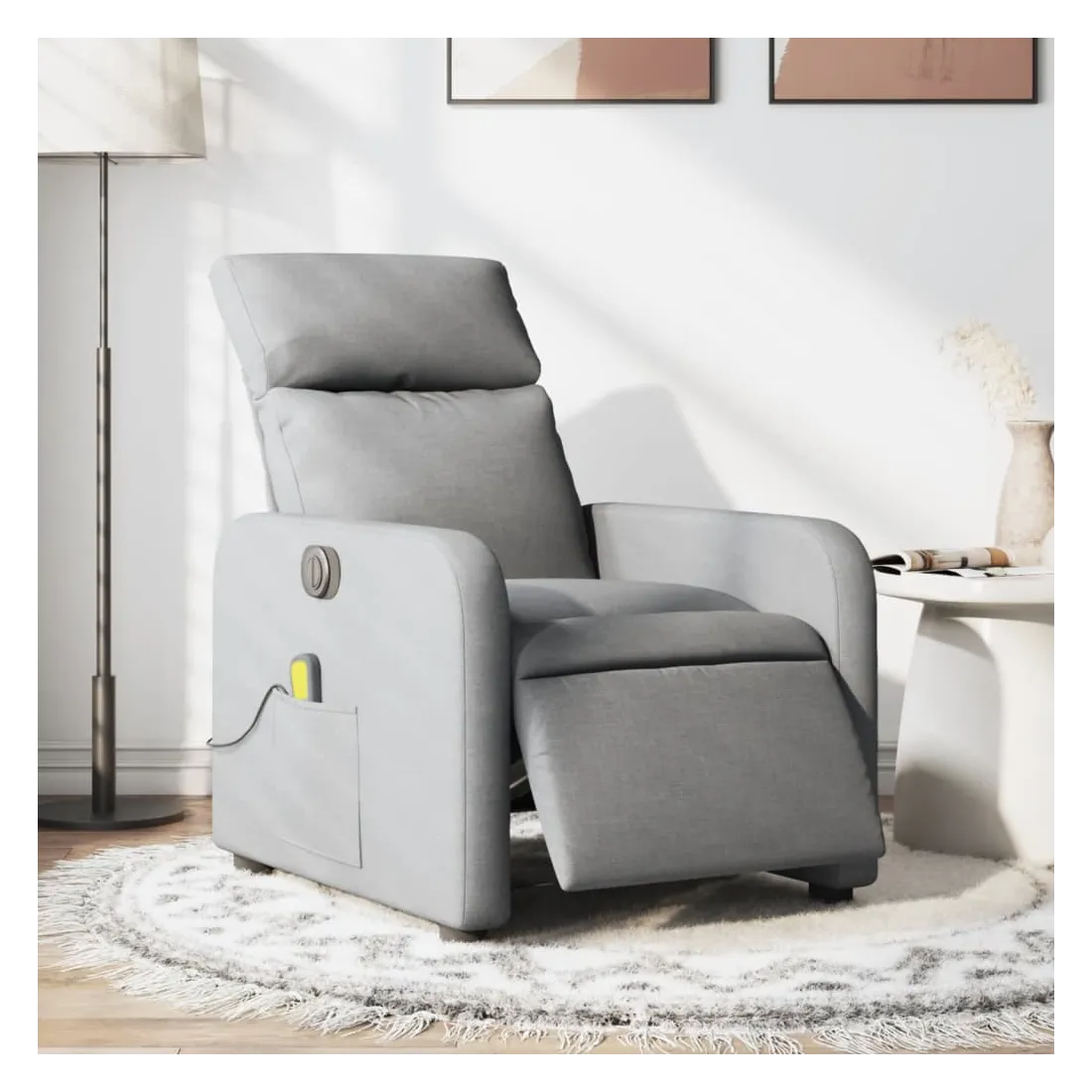 Asseyez-vous et détendez-vous dans ce fauteuil inclinable de massage électrique très confortable ! Fonction d'inclinaison électrique : ce fauteuil inclinable est équipé d'un moteur électrique qui permet de régler automatiquement le repose-pied et le dossier dans n'importe quelle position, selon votre confort, en appuyant simplement sur le bouton situé sur le côté du fauteuil. Cette fonction permet une inclinaison maximale de 135 degrés. En outre, le dossier peut revenir automatiquement à sa position d'origine par une simple pression sur le bouton.Fonction de vibration : les 6 points de massage vous permettent de faire l'expérience d'un massage mieux ciblé. De plus, la télécommande incluse vous permet de choisir différents programmes de massage. La fonction de massage est alimentée par le connecteur USB qui nécessite une source d'alimentation USB certifiée de 5 V (non fournie).Expérience d'assise confortable : le siège, le dossier et les larges accoudoirs bien rembourrés recouverts de tissu procurent une sensation confortable et chaleureuse, vous permettant de vous sentir enveloppé lorsque vous êtes assis. Le tissu présente un aspect simple et épuré et est respirant et durable.Poche latérale pratique : ce fauteuil est doté d'une poche latérale pour vous permettre de garder vos objets essentiels à portée de main.Cadre solide et stable : le cadre en bois et en métal offre une structure solide et une grande stabilité. Ce fauteuil inclinable est confortable et durable.