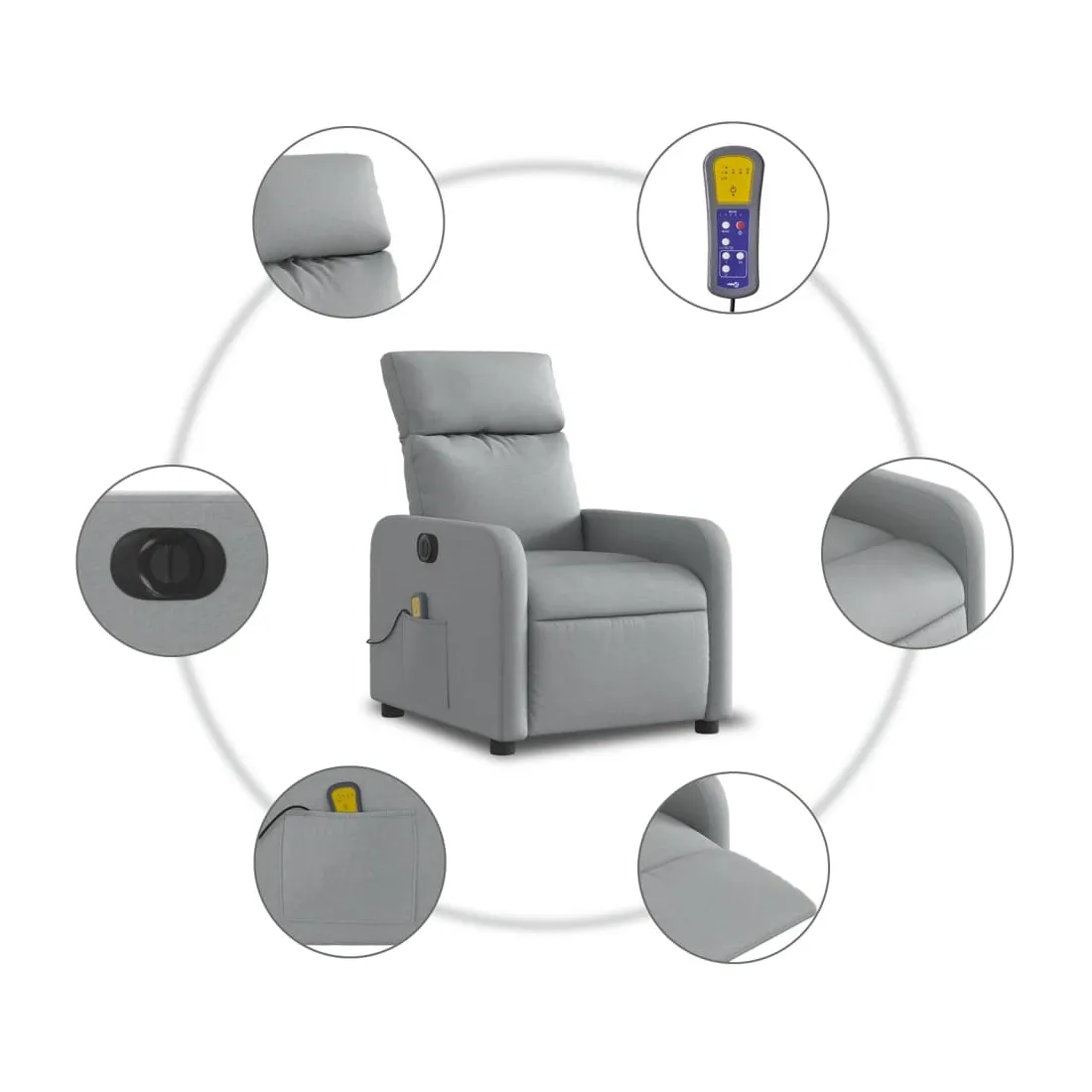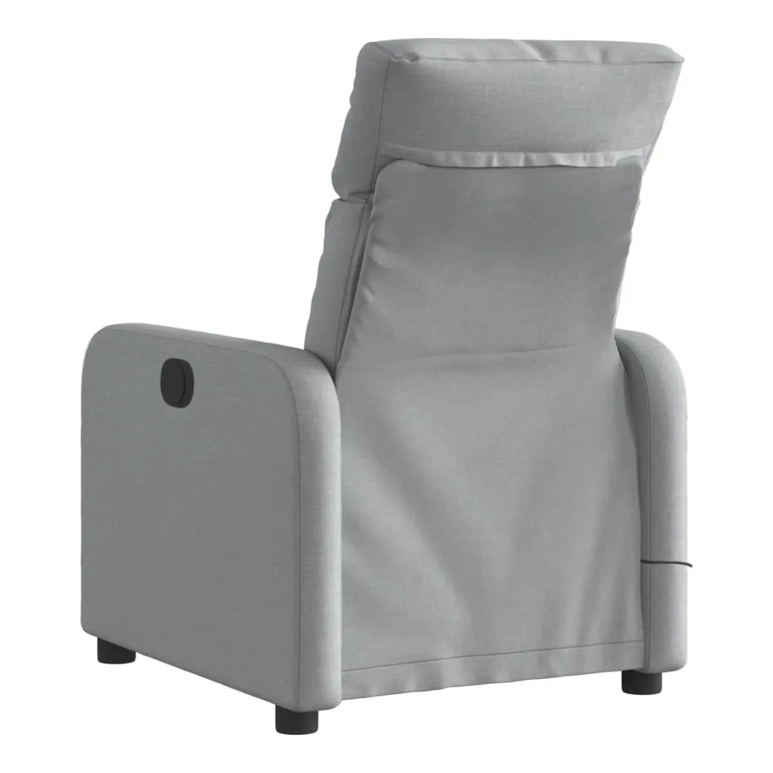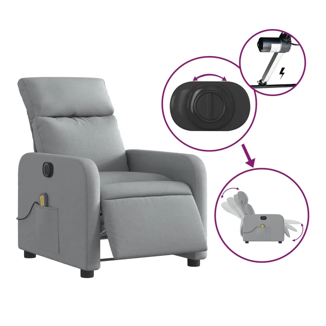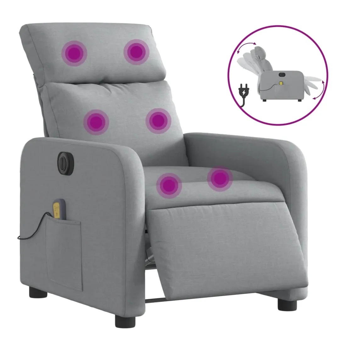 Asseyez-vous et détendez-vous dans ce fauteuil inclinable de massage électrique très confortable ! Fonction d'inclinaison électrique : ce fauteuil inclinable est équipé d'un moteur électrique qui permet de régler automatiquement le repose-pied et le dossier dans n'importe quelle position, selon votre confort, en appuyant simplement sur le bouton situé sur le côté du fauteuil. Cette fonction permet une inclinaison maximale de 135 degrés. En outre, le dossier peut revenir automatiquement à sa position d'origine par une simple pression sur le bouton.Fonction de vibration : les 6 points de massage vous permettent de faire l'expérience d'un massage mieux ciblé. De plus, la télécommande incluse vous permet de choisir différents programmes de massage. La fonction de massage est alimentée par le connecteur USB qui nécessite une source d'alimentation USB certifiée de 5 V (non fournie).Expérience d'assise confortable : le siège, le dossier et les larges accoudoirs bien rembourrés recouverts de tissu procurent une sensation confortable et chaleureuse, vous permettant de vous sentir enveloppé lorsque vous êtes assis. Le tissu présente un aspect simple et épuré et est respirant et durable.Poche latérale pratique : ce fauteuil est doté d'une poche latérale pour vous permettre de garder vos objets essentiels à portée de main.Cadre solide et stable : le cadre en bois et en métal offre une structure solide et une grande stabilité. Ce fauteuil inclinable est confortable et durable.