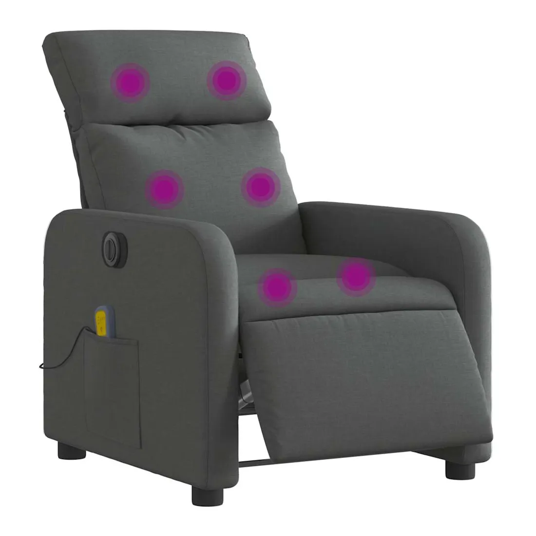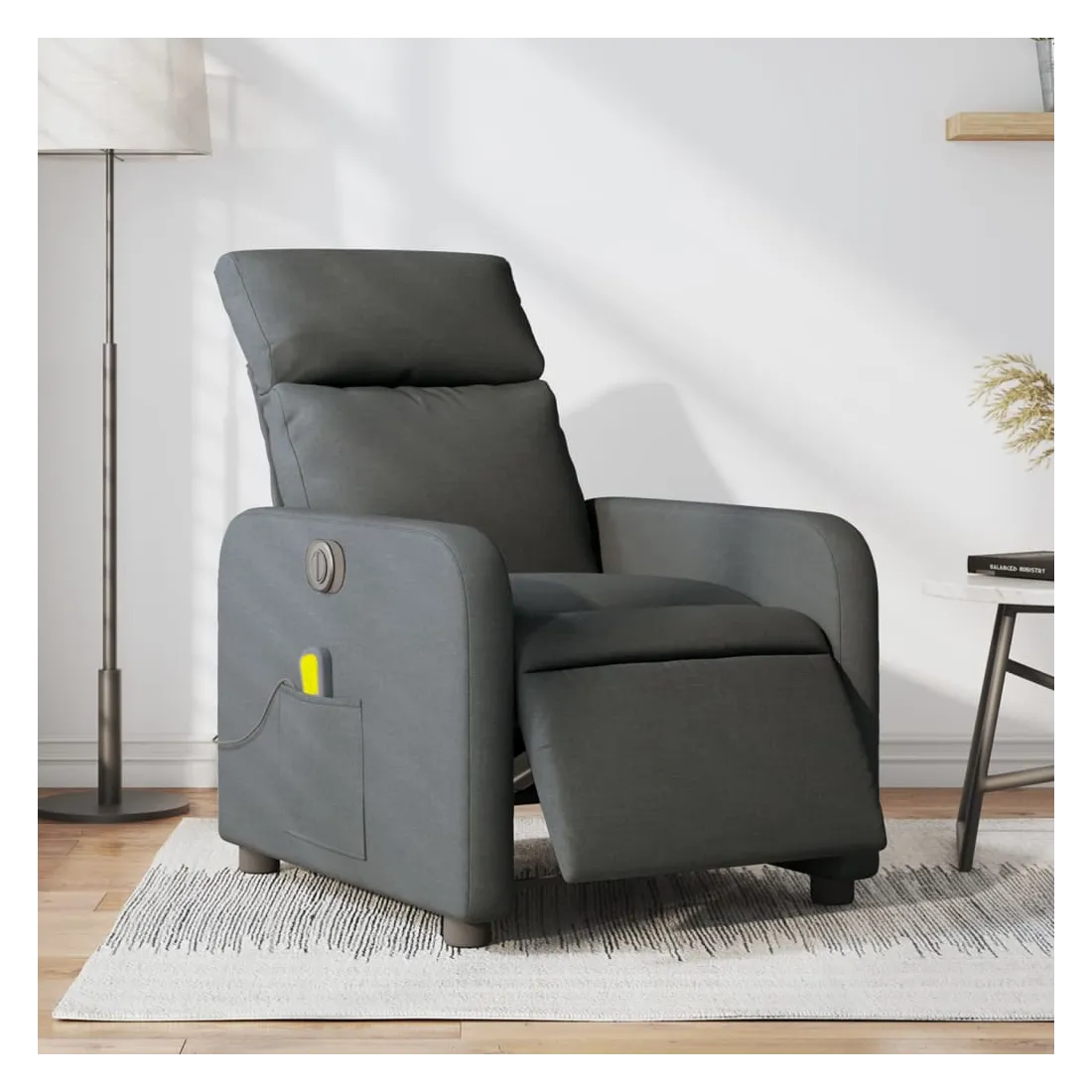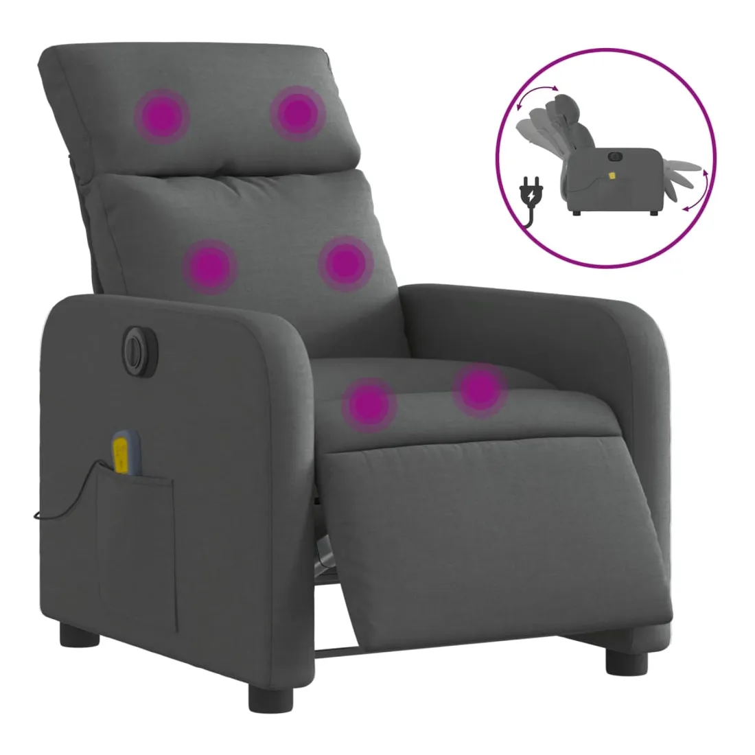 Asseyez-vous et détendez-vous dans ce fauteuil inclinable de massage électrique très confortable ! Fonction d'inclinaison électrique : ce fauteuil inclinable est équipé d'un moteur électrique qui permet de régler automatiquement le repose-pied et le dossier dans n'importe quelle position, selon votre confort, en appuyant simplement sur le bouton situé sur le côté du fauteuil. Cette fonction permet une inclinaison maximale de 135 degrés. En outre, le dossier peut revenir automatiquement à sa position d'origine par une simple pression sur le bouton.Fonction de vibration : les 6 points de massage vous permettent de faire l'expérience d'un massage mieux ciblé. De plus, la télécommande incluse vous permet de choisir différents programmes de massage. La fonction de massage est alimentée par le connecteur USB qui nécessite une source d'alimentation USB certifiée de 5 V (non fournie).Expérience d'assise confortable : le siège, le dossier et les larges accoudoirs bien rembourrés recouverts de tissu procurent une sensation confortable et chaleureuse, vous permettant de vous sentir enveloppé lorsque vous êtes assis. Le tissu présente un aspect simple et épuré et est respirant et durable.Poche latérale pratique : ce fauteuil est doté d'une poche latérale pour vous permettre de garder vos objets essentiels à portée de main.Cadre solide et stable : le cadre en bois et en métal offre une structure solide et une grande stabilité. Ce fauteuil inclinable est confortable et durable.