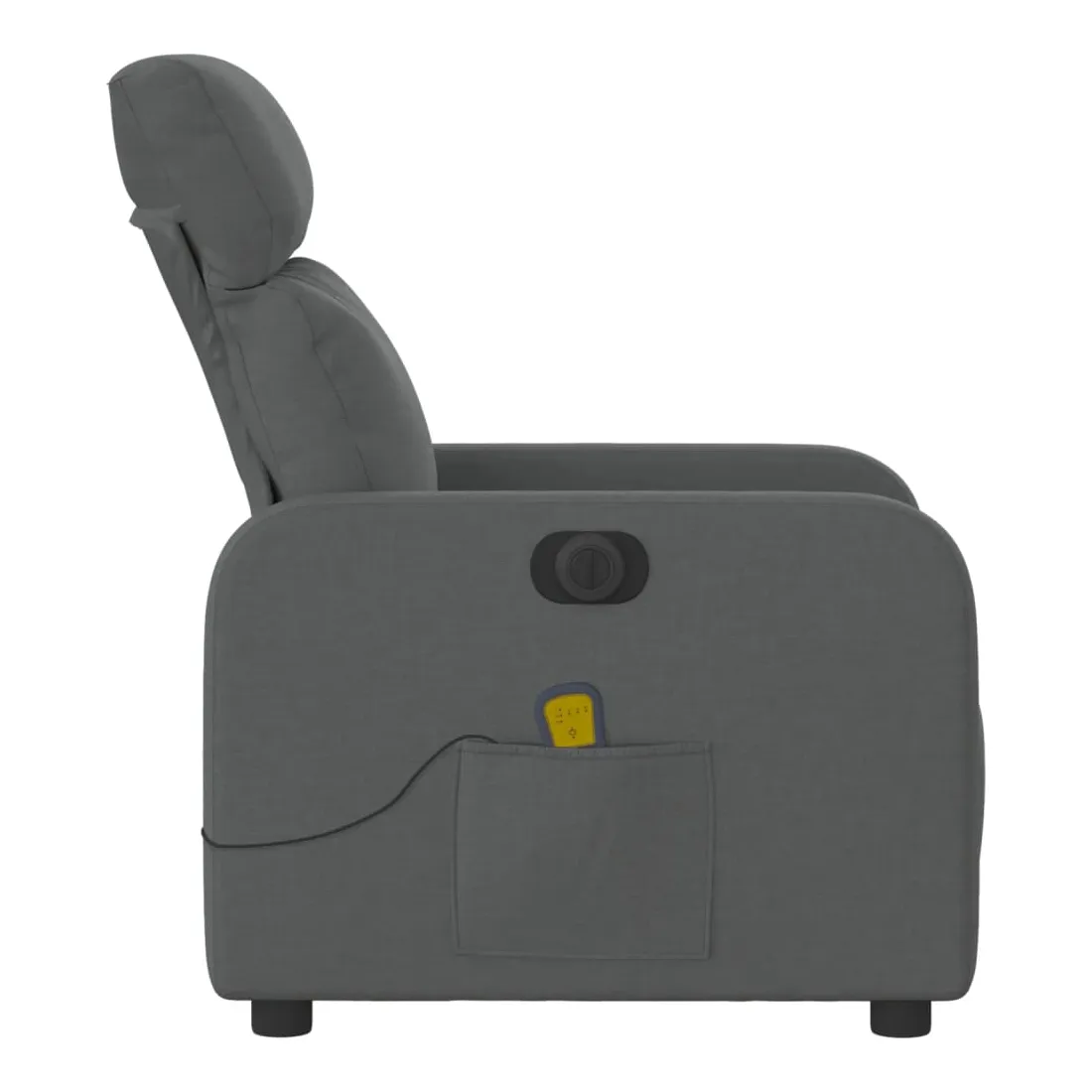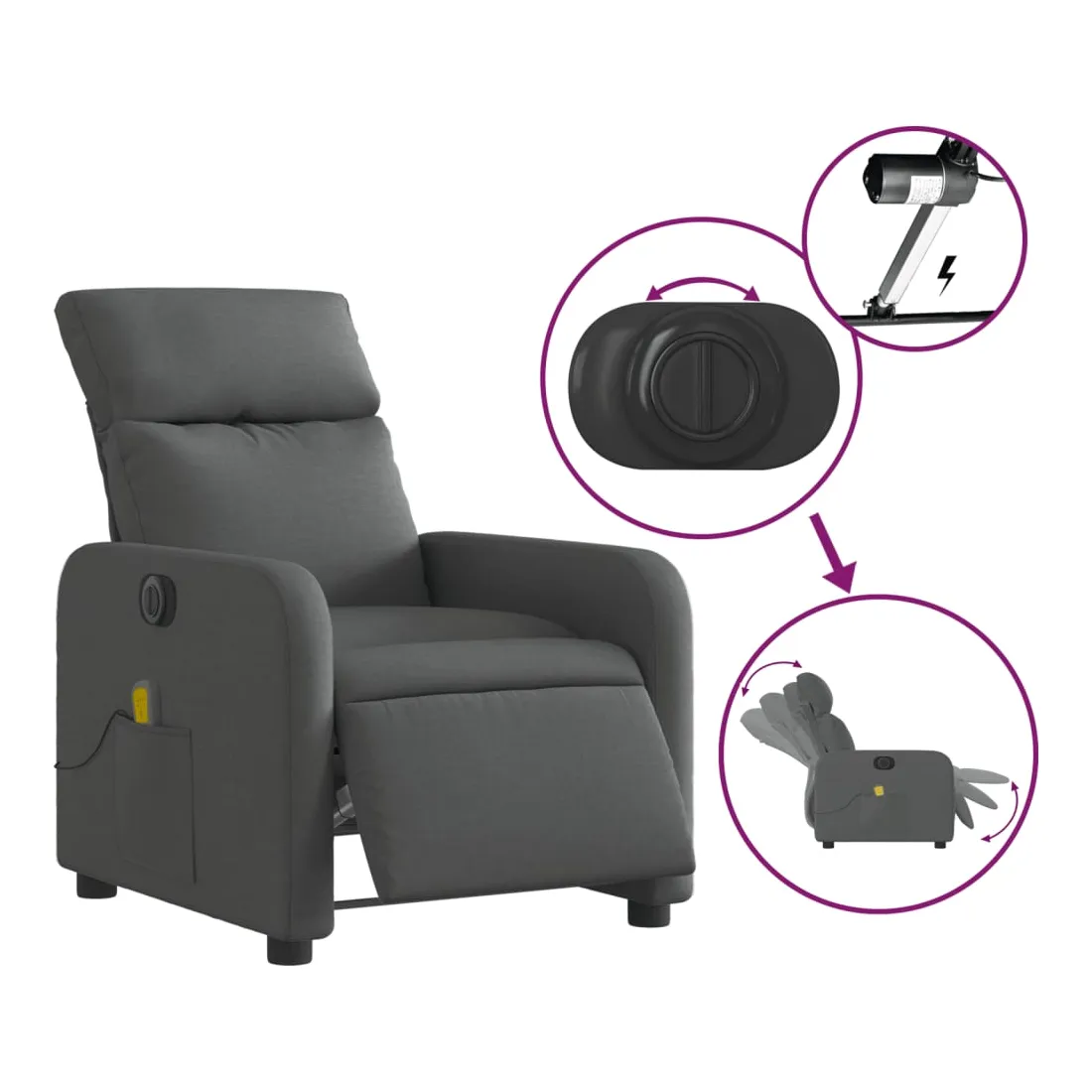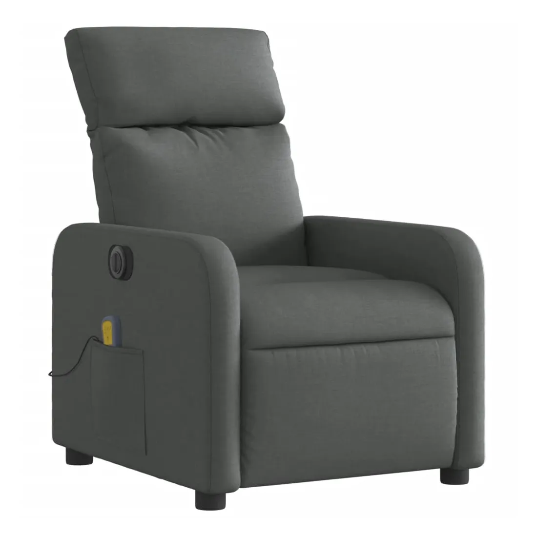 Asseyez-vous et détendez-vous dans ce fauteuil inclinable de massage électrique très confortable ! Fonction d'inclinaison électrique : ce fauteuil inclinable est équipé d'un moteur électrique qui permet de régler automatiquement le repose-pied et le dossier dans n'importe quelle position, selon votre confort, en appuyant simplement sur le bouton situé sur le côté du fauteuil. Cette fonction permet une inclinaison maximale de 135 degrés. En outre, le dossier peut revenir automatiquement à sa position d'origine par une simple pression sur le bouton.Fonction de vibration : les 6 points de massage vous permettent de faire l'expérience d'un massage mieux ciblé. De plus, la télécommande incluse vous permet de choisir différents programmes de massage. La fonction de massage est alimentée par le connecteur USB qui nécessite une source d'alimentation USB certifiée de 5 V (non fournie).Expérience d'assise confortable : le siège, le dossier et les larges accoudoirs bien rembourrés recouverts de tissu procurent une sensation confortable et chaleureuse, vous permettant de vous sentir enveloppé lorsque vous êtes assis. Le tissu présente un aspect simple et épuré et est respirant et durable.Poche latérale pratique : ce fauteuil est doté d'une poche latérale pour vous permettre de garder vos objets essentiels à portée de main.Cadre solide et stable : le cadre en bois et en métal offre une structure solide et une grande stabilité. Ce fauteuil inclinable est confortable et durable.