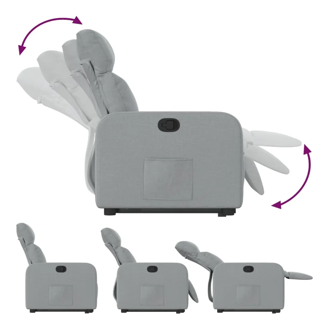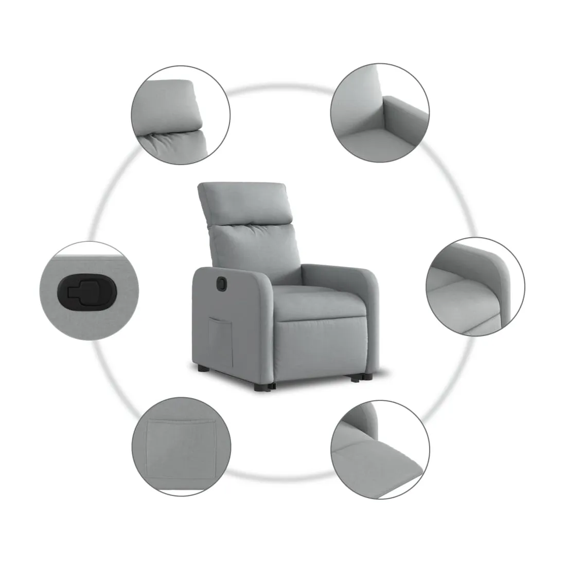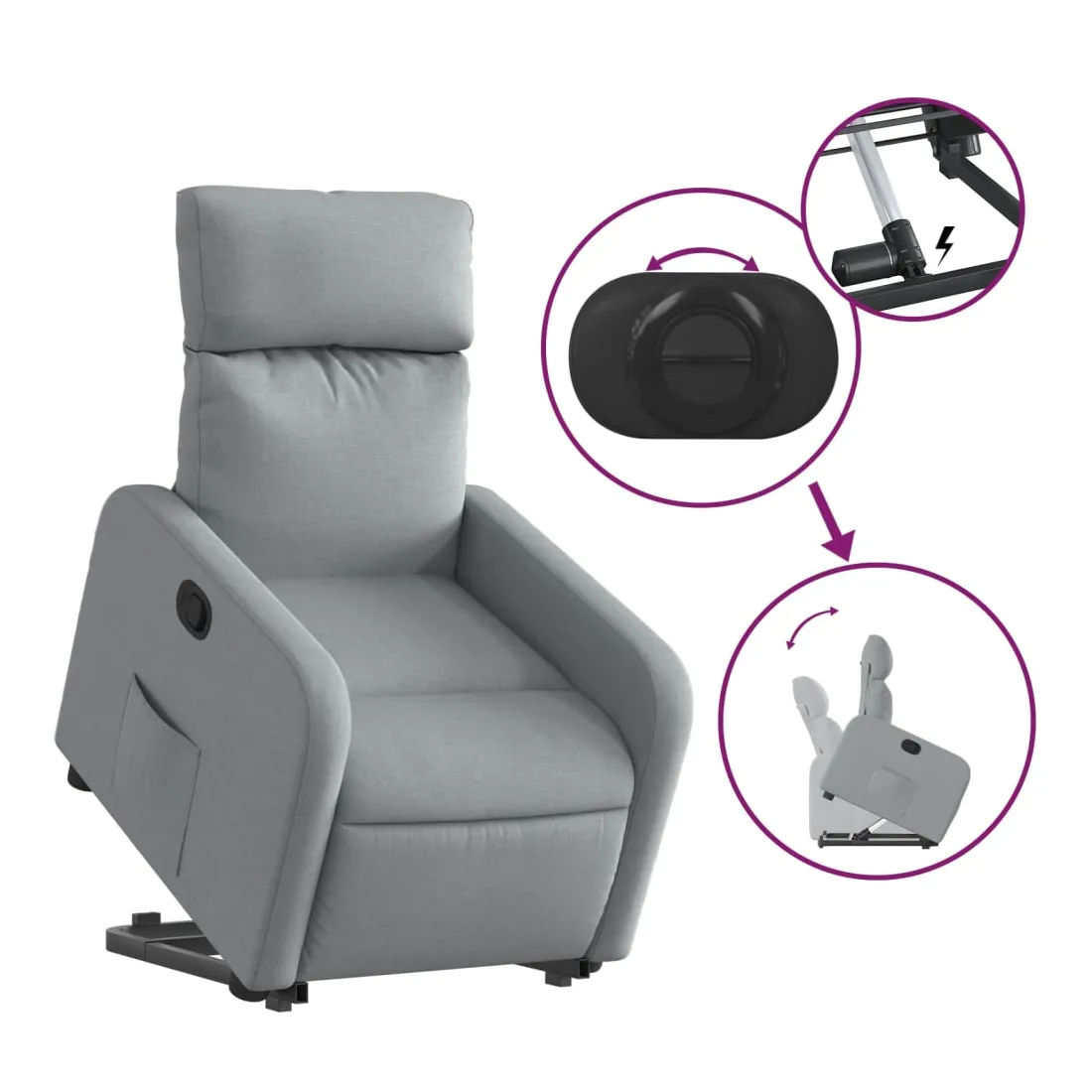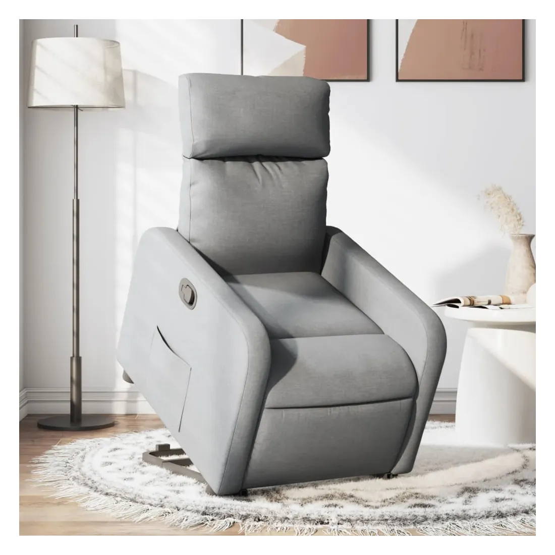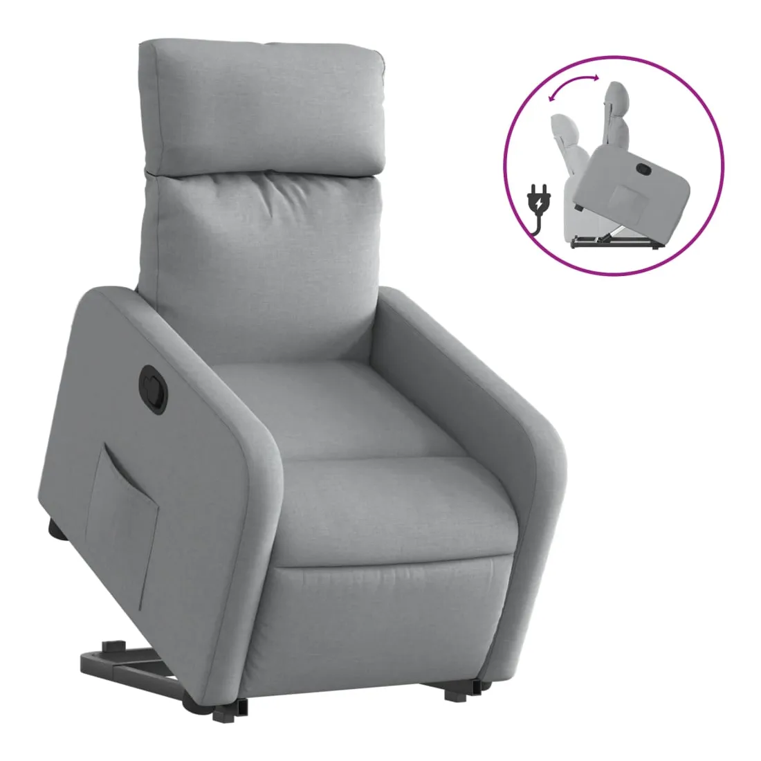 Asseyez-vous et détendez-vous dans ce fauteuil inclinable très confortable ! Fonction de levage électrique : ce fauteuil inclinable pour personnes âgées est équipé d'un moteur électrique pour la fonction de levage. Grâce à la fonction qui pousse toute la chaise vers le haut, vous pouvez facilement vous tenir debout sans stresser votre dos et vos genoux en appuyant simplement sur le bouton.Fonction d'inclinaison manuelle : ce fauteuil inclinable est doté d'une poignée du côté droit. Vous pouvez régler manuellement le repose-pieds et le dossier dans n'importe quelle position selon votre confort en tirant simplement sur la poignée. Cette fonction permet une inclinaison maximale de 135 degrés. De plus, le dossier peut revenir rapidement à sa position d'origine en tirant simplement sur la poignée.Expérience d'assise confortable : le siège, le dossier et les larges accoudoirs bien rembourrés recouverts de tissu procurent une sensation confortable et chaleureuse, vous permettant de vous sentir enveloppé lorsque vous êtes assis. Le tissu présente un aspect simple et épuré et est respirant et durable.Poche latérale pratique : ce fauteuil est doté d'une poche latérale pour vous permettre de garder vos objets essentiels à portée de main.Cadre solide et stable : le cadre en bois et en métal offre une structure solide et une grande stabilité. Ce fauteuil inclinable est confortable et durable.