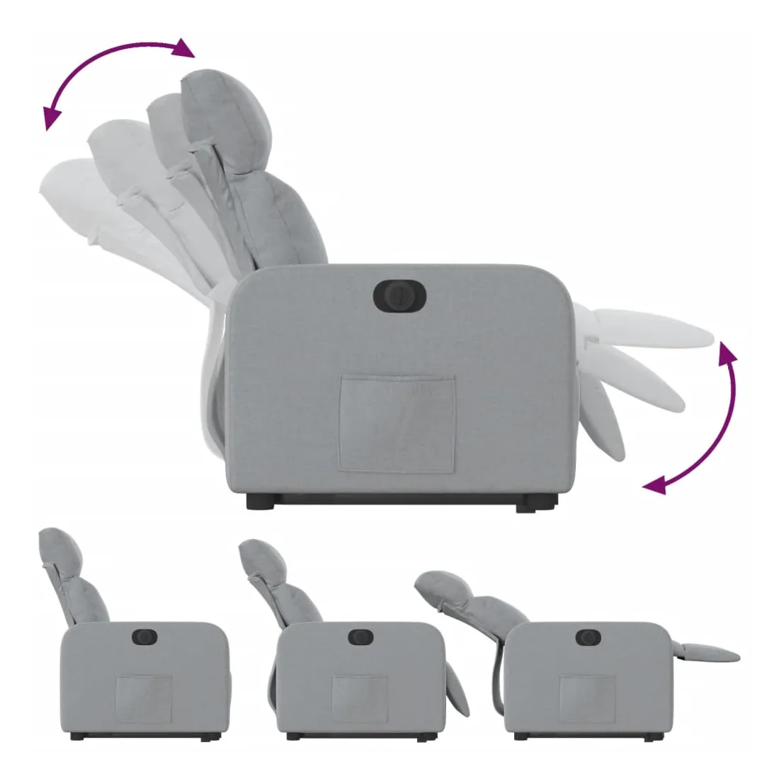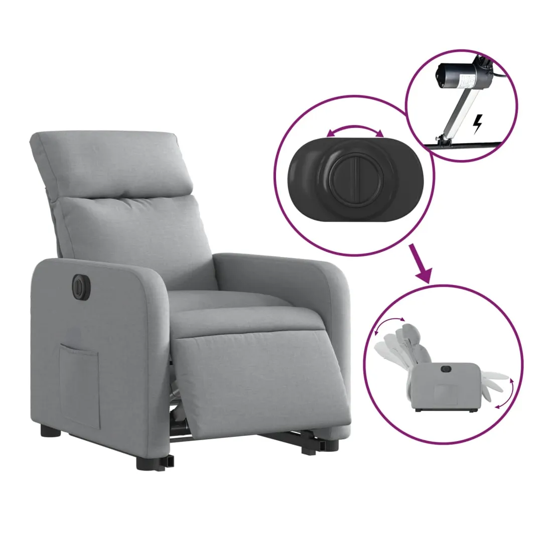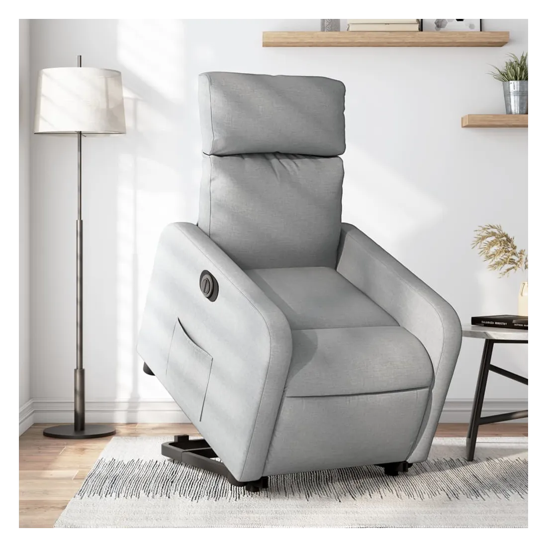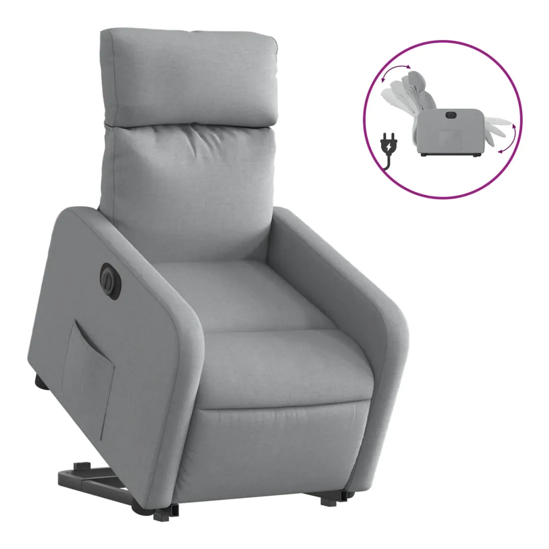 Asseyez-vous et détendez-vous dans ce fauteuil inclinable électrique très confortable ! Fonction de levage électrique : ce fauteuil inclinable pour personnes âgées est équipé d'un moteur électrique pour la fonction de levage. Grâce à la fonction qui pousse toute la chaise vers le haut, vous pouvez facilement vous tenir debout sans stresser votre dos et vos genoux en appuyant simplement sur le bouton.Fonction d'inclinaison électrique : ce fauteuil inclinable est également équipé d'un moteur électrique qui permet de régler automatiquement le repose-pied et le dossier dans n'importe quelle position, selon votre confort, en appuyant simplement sur le bouton situé sur le côté du fauteuil. Cette fonction permet une inclinaison maximale de 135 degrés. En outre, le dossier peut revenir automatiquement à sa position d'origine par une simple pression sur le bouton.Expérience d'assise confortable : le siège, le dossier et les larges accoudoirs bien rembourrés recouverts de tissu procurent une sensation confortable et chaleureuse, vous permettant de vous sentir enveloppé lorsque vous êtes assis. Le tissu présente un aspect simple et épuré et est respirant et durable.Poche latérale pratique : ce fauteuil est doté d'une poche latérale pour vous permettre de garder vos objets essentiels à portée de main.Cadre solide et stable : le cadre en bois et en métal offre une structure solide et une grande stabilité. Ce fauteuil inclinable est confortable et durable.