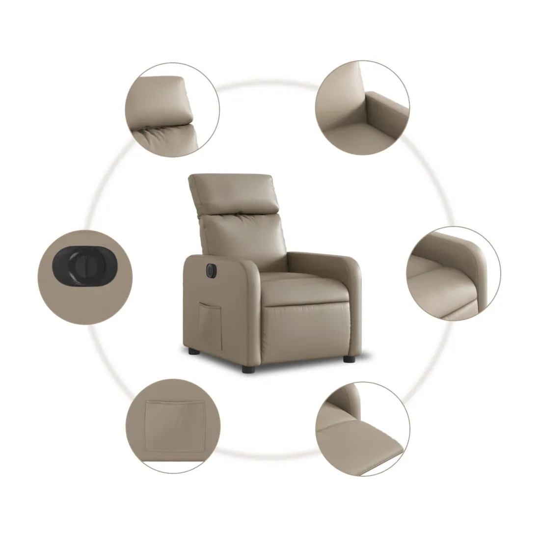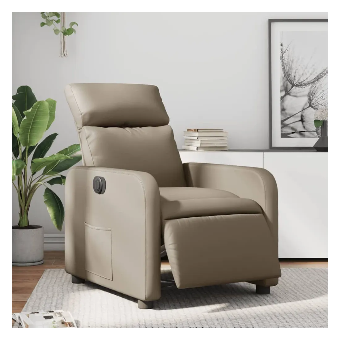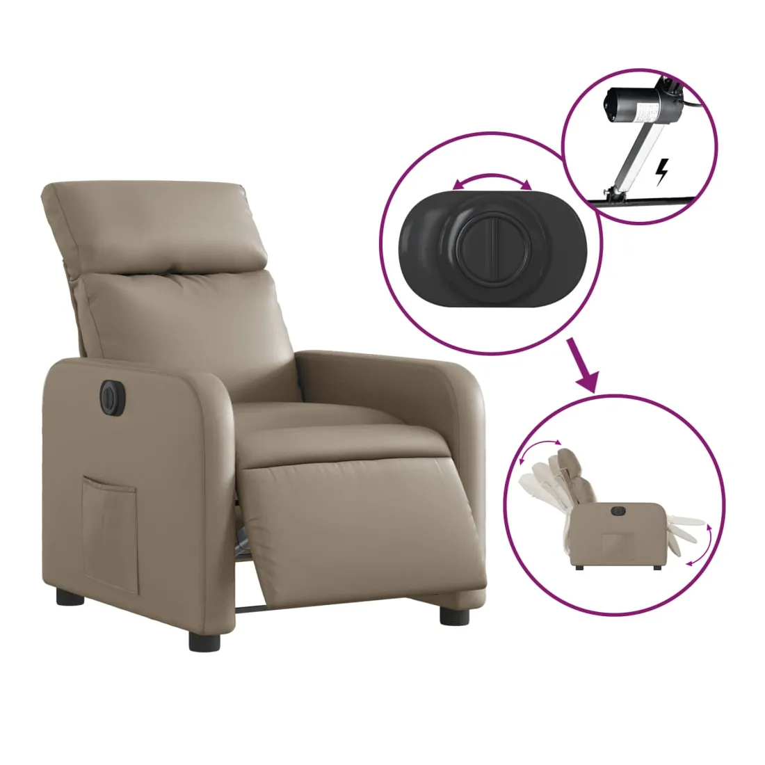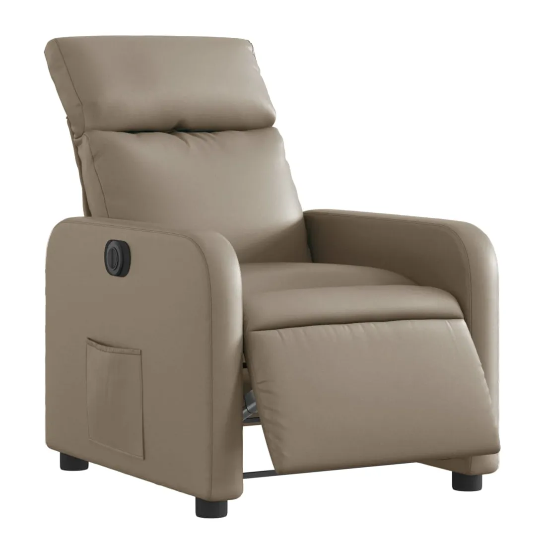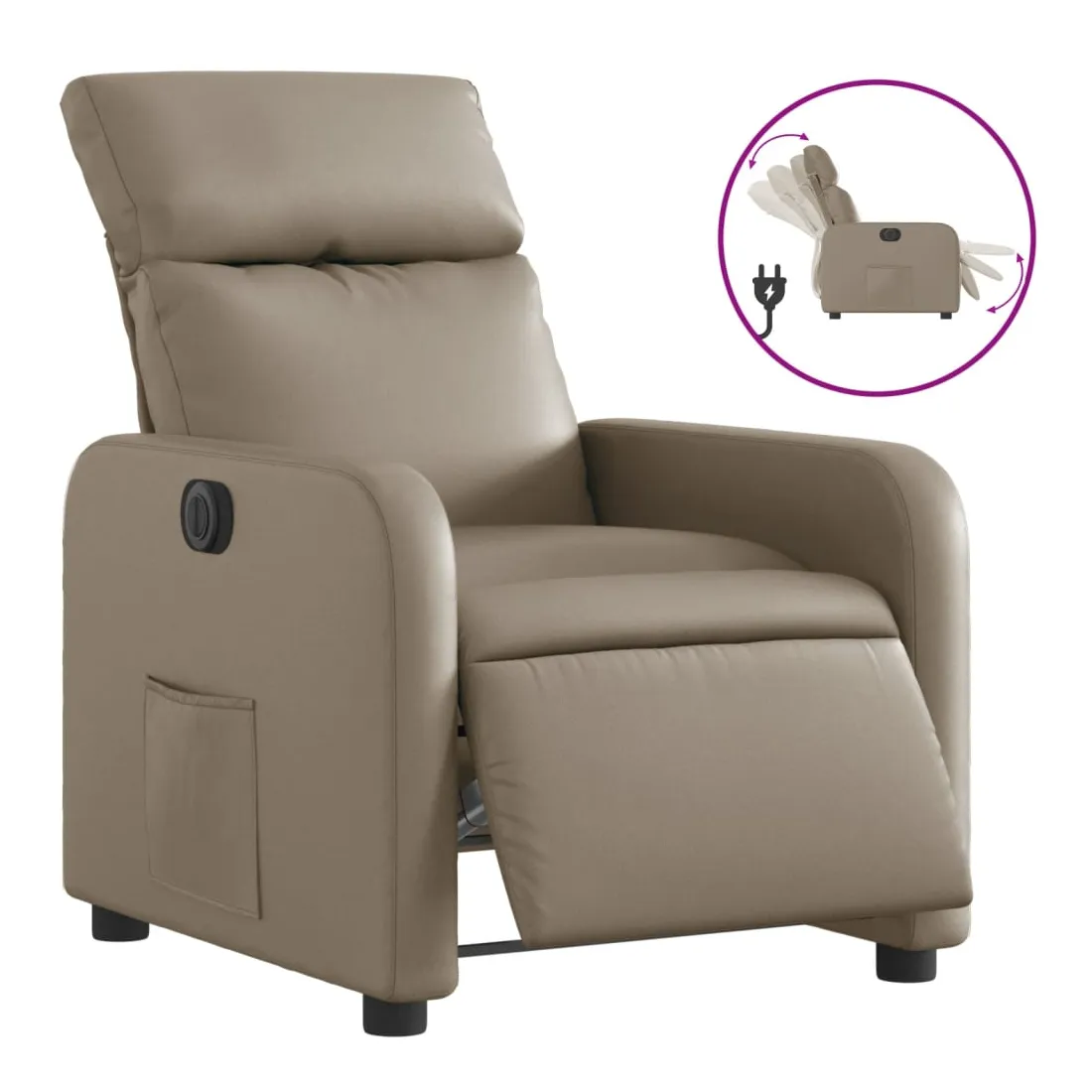 Asseyez-vous et détendez-vous dans ce fauteuil inclinable électrique très confortable ! Fonction d'inclinaison électrique : ce fauteuil inclinable est équipé d'un moteur électrique qui permet de régler automatiquement le repose-pied et le dossier dans n'importe quelle position, selon votre confort, en appuyant simplement sur le bouton situé sur le côté du fauteuil. Cette fonction permet une inclinaison maximale de 135 degrés. En outre, le dossier peut revenir automatiquement à sa position d'origine par une simple pression sur le bouton.Expérience de siège confortable : le siège, le dossier et les larges accoudoirs rembourrés épais recouverts de similicuir procurent une sensation confortable, vous faisant vous sentir enlacé lorsque vous êtes assis. Le similicuir est un matériau très résistant. Il est résistant aux taches, ce qui le rend facile à nettoyer avec un chiffon humide. La surface lisse donne également un aspect luxueux et la beauté du cuir véritable.Poche latérale pratique : ce fauteuil est doté d'une poche latérale pour vous permettre de garder vos objets essentiels à portée de main.Cadre solide et stable : le cadre en bois et en métal offre une structure solide et une grande stabilité. Ce fauteuil inclinable est confortable et durable.