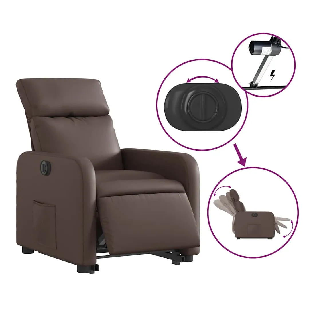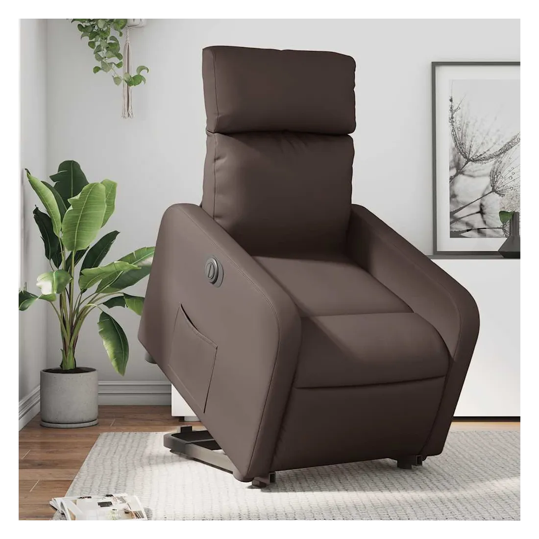 Asseyez-vous et détendez-vous dans ce fauteuil inclinable électrique très confortable ! Fonction de levage électrique : ce fauteuil inclinable pour personnes âgées est équipé d'un moteur électrique pour la fonction de levage. Grâce à la fonction qui pousse toute la chaise vers le haut, vous pouvez facilement vous tenir debout sans stresser votre dos et vos genoux en appuyant simplement sur le bouton.Fonction d'inclinaison électrique : ce fauteuil inclinable est également équipé d'un moteur électrique qui permet de régler automatiquement le repose-pied et le dossier dans n'importe quelle position, selon votre confort, en appuyant simplement sur le bouton situé sur le côté du fauteuil. Cette fonction permet une inclinaison maximale de 135 degrés. En outre, le dossier peut revenir automatiquement à sa position d'origine par une simple pression sur le bouton.Expérience de siège confortable : le siège, le dossier et les larges accoudoirs rembourrés épais recouverts de similicuir procurent une sensation confortable, vous faisant vous sentir enlacé lorsque vous êtes assis. Le similicuir est un matériau très résistant. Il est résistant aux taches, ce qui le rend facile à nettoyer avec un chiffon humide. La surface lisse donne également un aspect luxueux et la beauté du cuir véritable.Poche latérale pratique : ce fauteuil est doté d'une poche latérale pour vous permettre de garder vos objets essentiels à portée de main.Cadre solide et stable : le cadre en bois et en métal offre une structure solide et une grande stabilité. Ce fauteuil inclinable est confortable et durable.