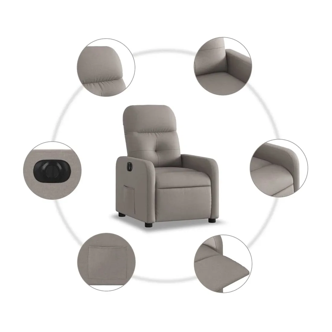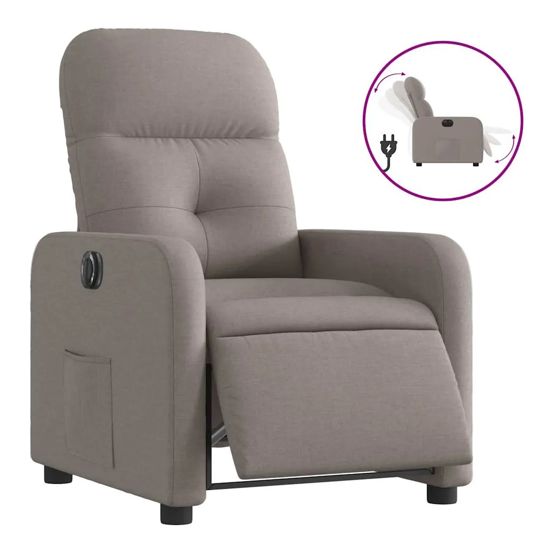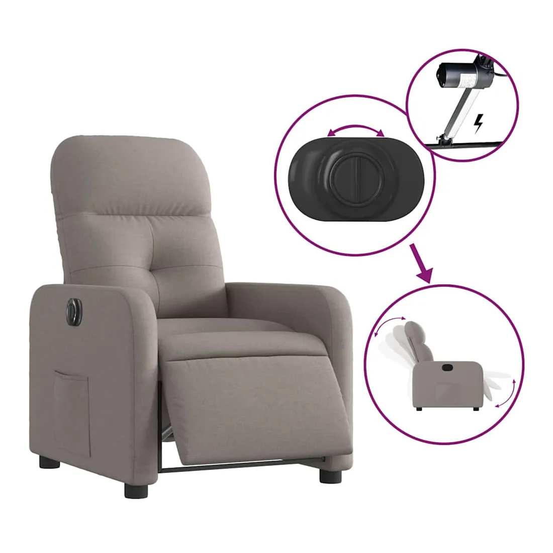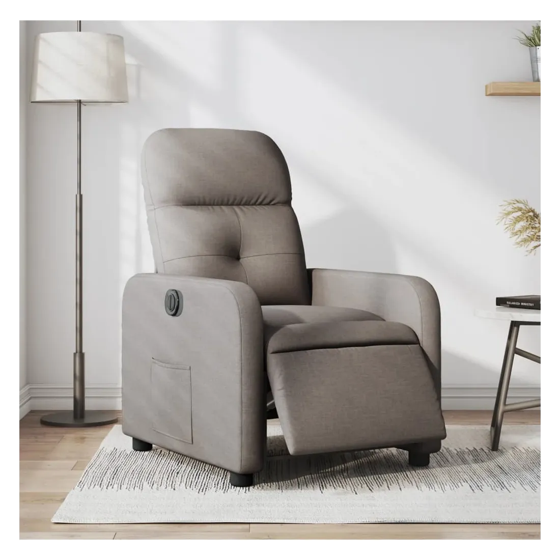 Asseyez-vous et détendez-vous dans ce fauteuil inclinable électrique très confortable ! Fonction d'inclinaison électrique : ce fauteuil inclinable est équipé d'un moteur électrique qui permet de régler automatiquement le repose-pied et le dossier dans n'importe quelle position, selon votre confort, en appuyant simplement sur le bouton situé sur le côté du fauteuil. Cette fonction permet une inclinaison maximale de 135 degrés. En outre, le dossier peut revenir automatiquement à sa position d'origine par une simple pression sur le bouton.Expérience d'assise confortable : le siège, le dossier et les larges accoudoirs bien rembourrés recouverts de tissu procurent une sensation confortable et chaleureuse, vous permettant de vous sentir enveloppé lorsque vous êtes assis. Le tissu présente un aspect simple et épuré et est respirant et durable.Poche latérale pratique : ce fauteuil est doté d'une poche latérale pour vous permettre de garder vos objets essentiels à portée de main.Cadre solide et stable : le cadre en bois et en métal offre une structure solide et une grande stabilité. Ce fauteuil inclinable est confortable et durable.